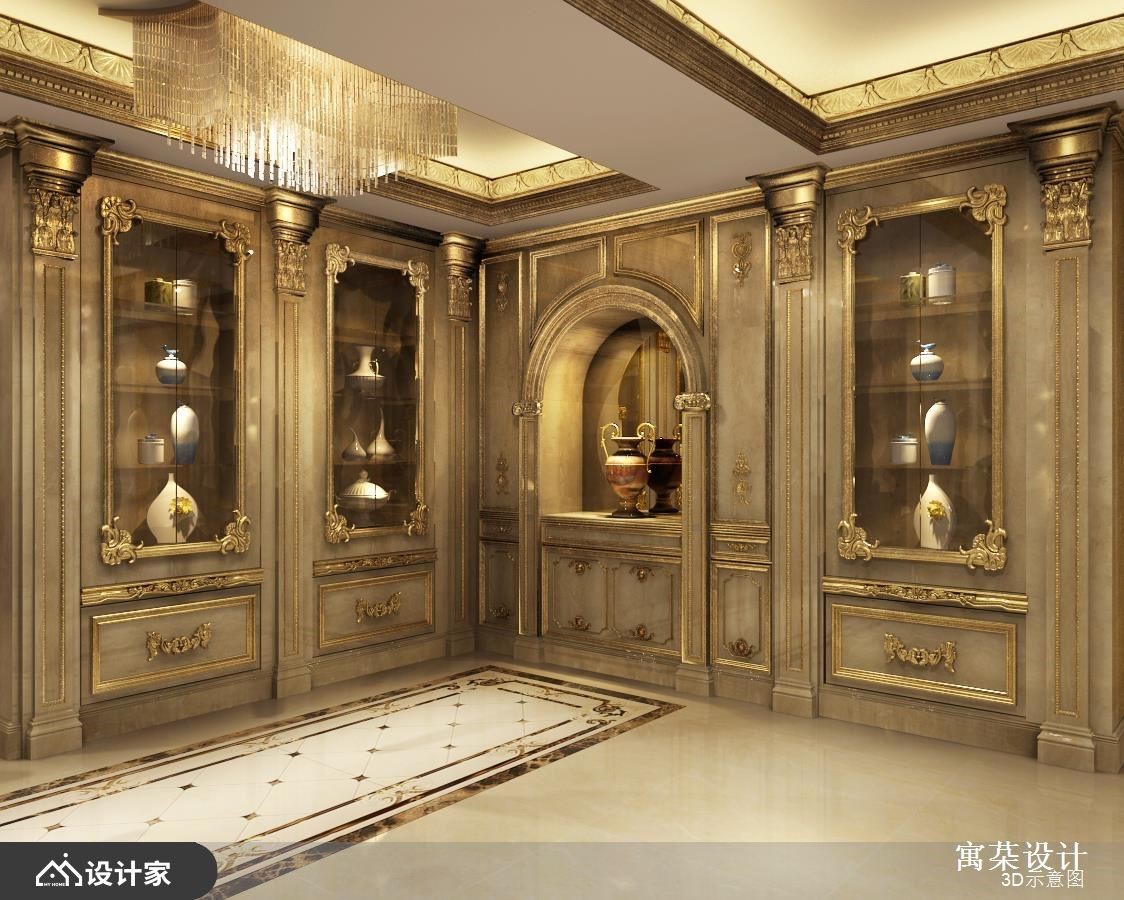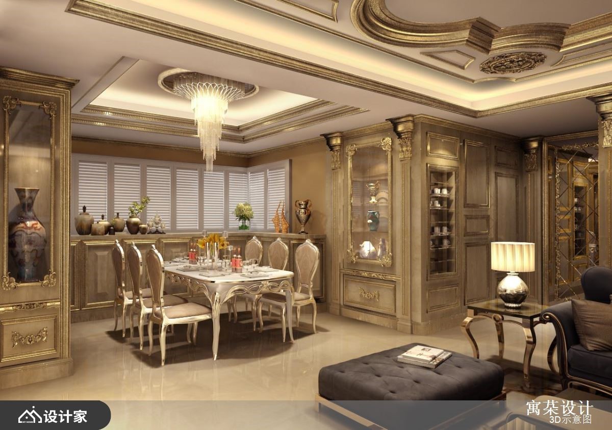 264平方米大宅,设计师让公共领域呈现金碧辉煌的奢华气场,满足迎宾与宴客的需求,并藉由古典元素与精雕细琢的工艺设计,重现有如巴洛克宫廷的风采。【大量金色铺陈,打造华丽质感】入门即可见玄关展示柜的精采设计,以金色做为主轴,揉合精细的花样滚边,搭配收藏艺品的陈列,引领无上奢华的视觉印象。公共领域内,则从柜体、壁板到家具等,皆可见一致的金色雕花饰边,搭配香槟色、镜面、清玻等辅助,铺展出戏剧张力十足的华丽质感。【利用图腾灯饰,画出空间界线】天花板揉入对称而开展的优雅图腾,烘托中心的水晶灯饰,在光影之间演绎丰富层次,同时运用天花造型界定范围,开创出不同场域的空间特质。而私领域内,则在兼具质感之余,也挹注量身打造的实用机能,让每个居室透过不特定的风格语汇,更加贴近居者的内在本质。