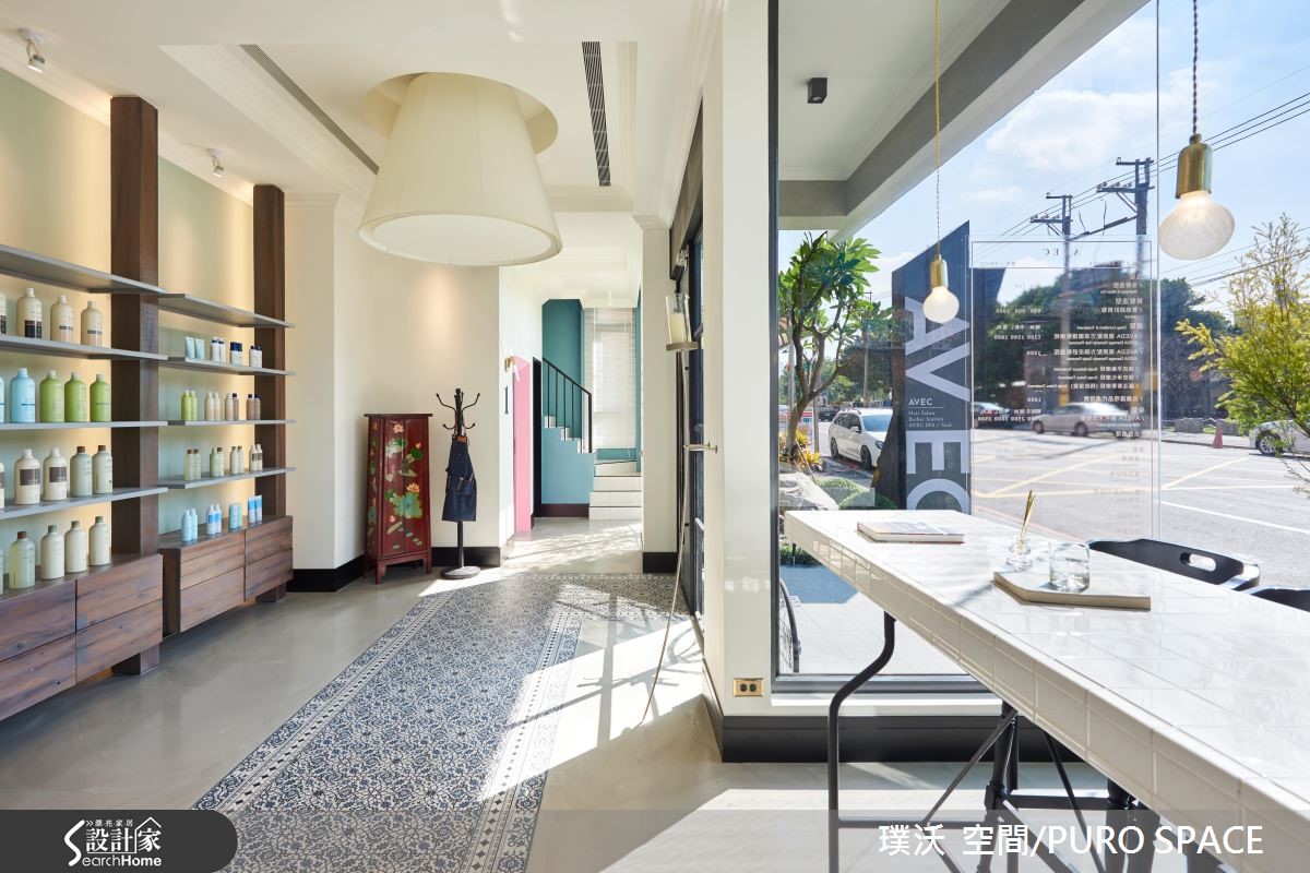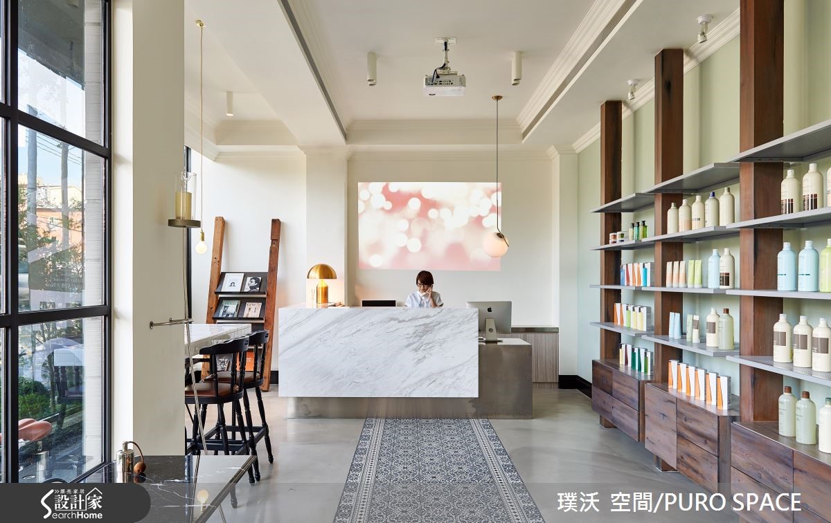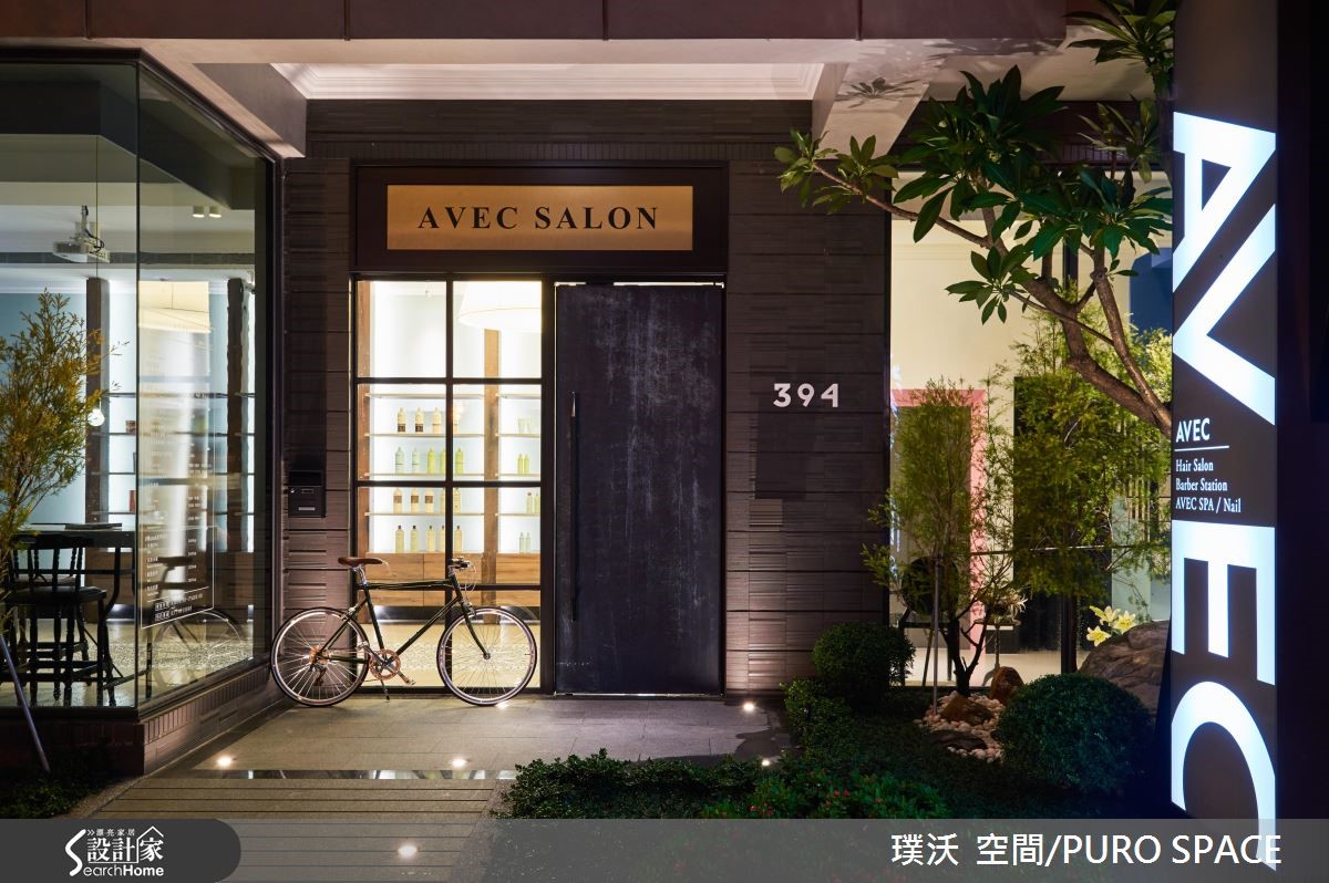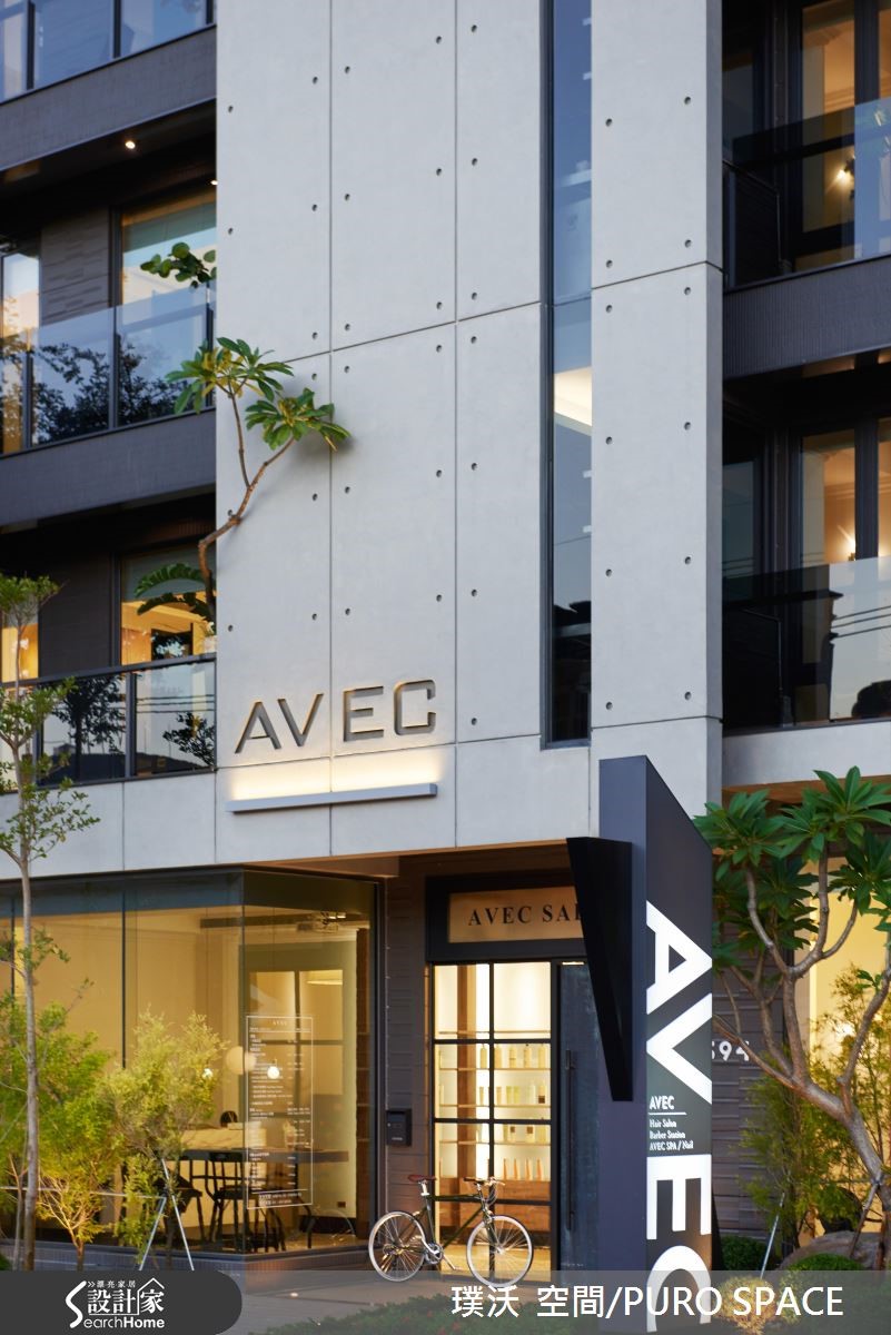 AVEC SALON为业主自建的7层楼美发沙龙,采用并贩卖知名美发品牌Aveda产品,为了切合对于美发的专业形象,并结合美感与时尚,设计团队分别在建筑外观、接待大厅与各楼层体现配合各式美发、美甲打造专属的风格设计! 【引景入室,为大厅带来时尚美感】建筑外观与大厅设计将重点摆在彰显简约的时尚美感,进一步营造宛如欧式精品旅馆的设计概念。建筑本体联合建筑团队完成外观,以清水模质感建材铺叙外墙,象征专业有条的精神,并以大面积铁件落地窗导入充裕阳光与绿景,将内外的隔阂降至最低。【利用材质堆砌,创造多元风格】大门采用青铜漆与实木,注入复古的时髦意象,入门即可看见商品展示,以春藤绿与木质石材展示架衬托商品,作为迎宾装饰。柜台以大理石搭配不锈钢,地坪则以花砖结合无接缝树脂地坪,为多重风格带来微妙平衡,同时不失冲突美感。临窗长桌不仅能提供贩卖、说明与实作解说,更能给予宾客于候位、结账与交谊时,拥有宾至如归的高雅感受。通往其他楼层的电梯与楼梯,特意以粉红与粉蓝色调打造梦幻气息,成功吸引注目。