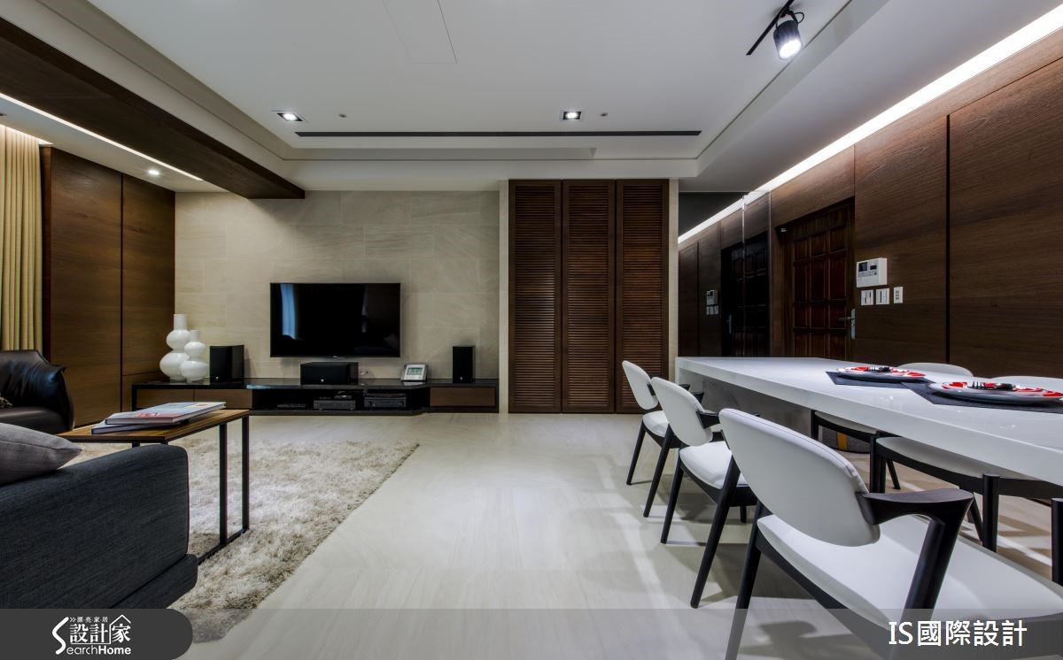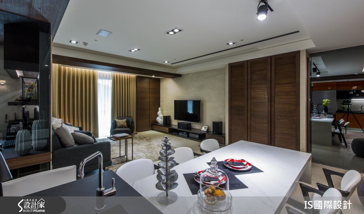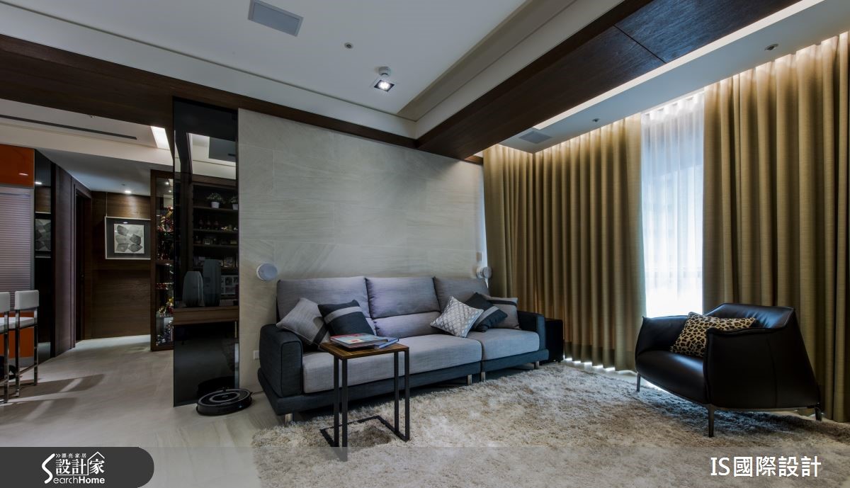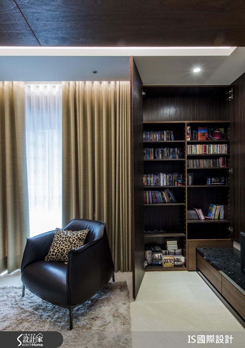 这是一间116平方米的住宅,但设计师掌握优势条件,成功消弭空间压迫感;同时运用线条勾勒,以及合宜的色彩比例分配,让老屋瞬间焕然一新,开拓出大宅般的开阔视野。【开放中岛,导引流畅动线】此案整体运用深色木皮搭衬浅色木地板,注入自然稳重的居家氛围,并整合立面线条,透过延伸柜体串联场域。天花梁柱则运用木质包覆,不仅拉抬视觉高度,亦型塑出四平八稳的方正格局。设计师特意在窗边摆放一张单椅,营造随兴的生活感受。延续着屋主的使用习惯,设置开放式中岛吧台,导引流畅动线。一旁相连的是多功能书房领域,以深色玻璃作出隔断,在通透之中维持领域隐私性。再刻意外推柜体,展示屋主的收藏公仔。不仅延展更多收纳,也让廊道变得不再单调,拥有与众不同的吸睛亮点。