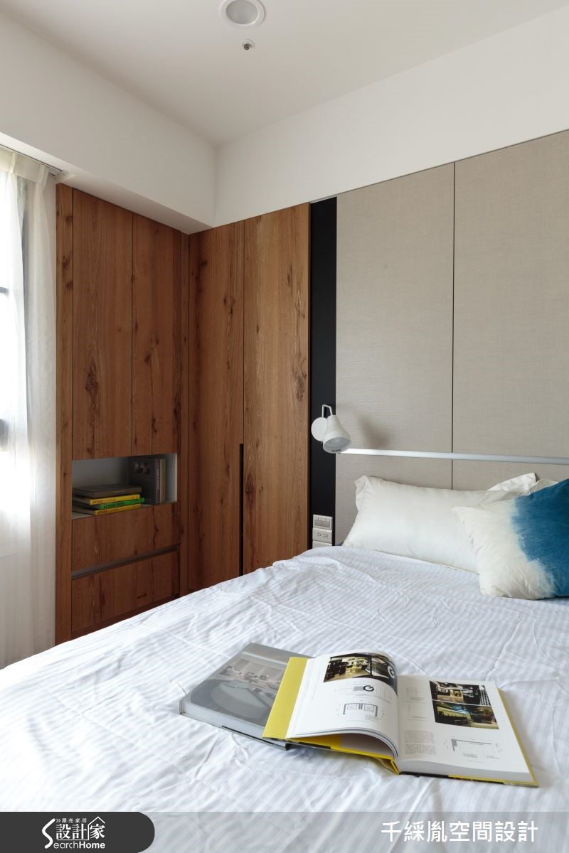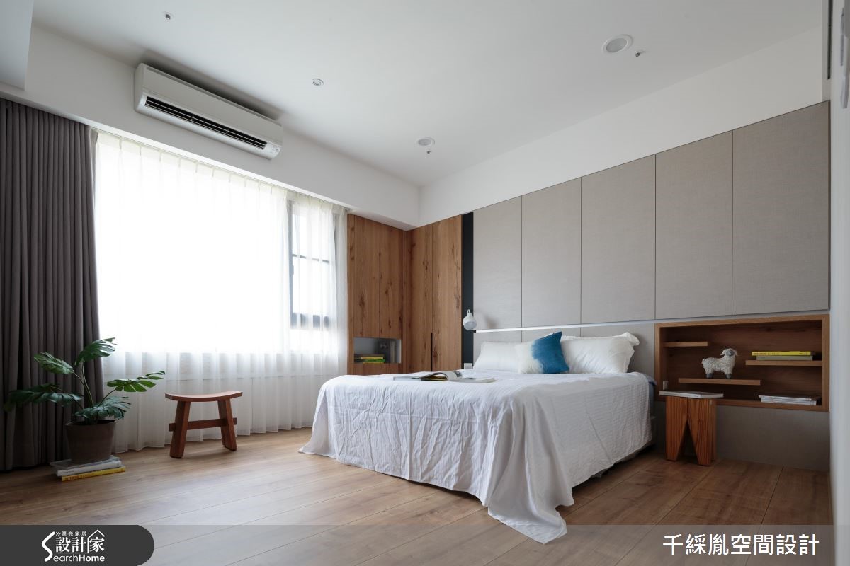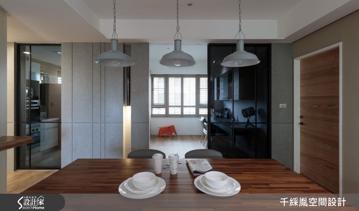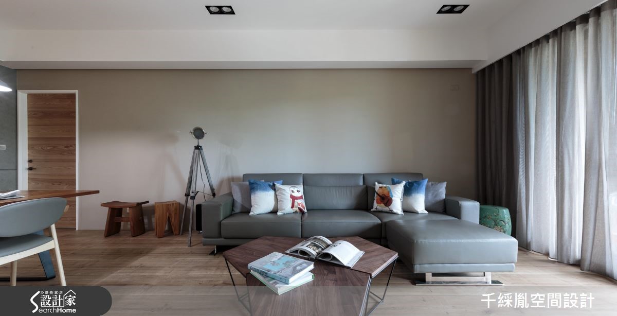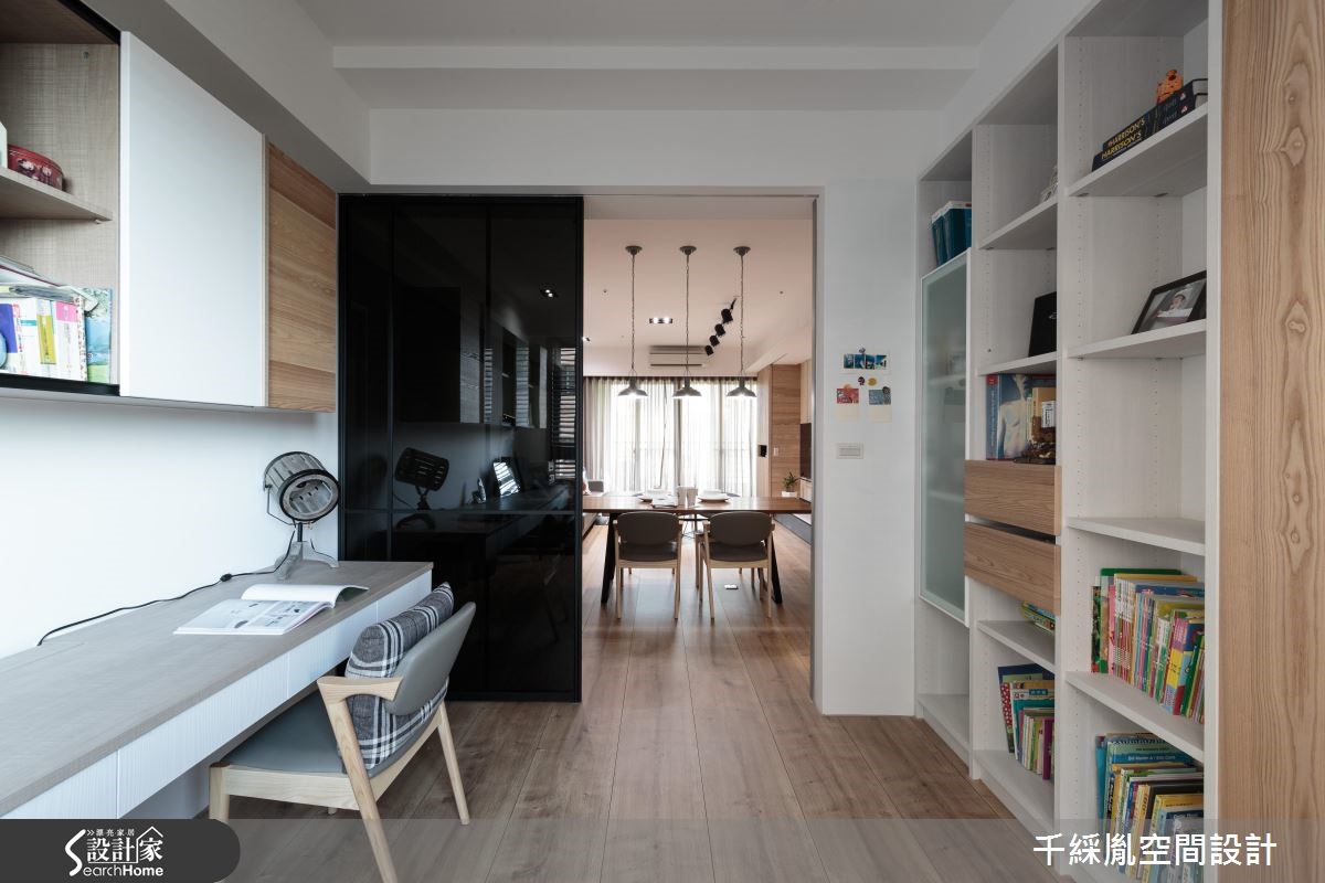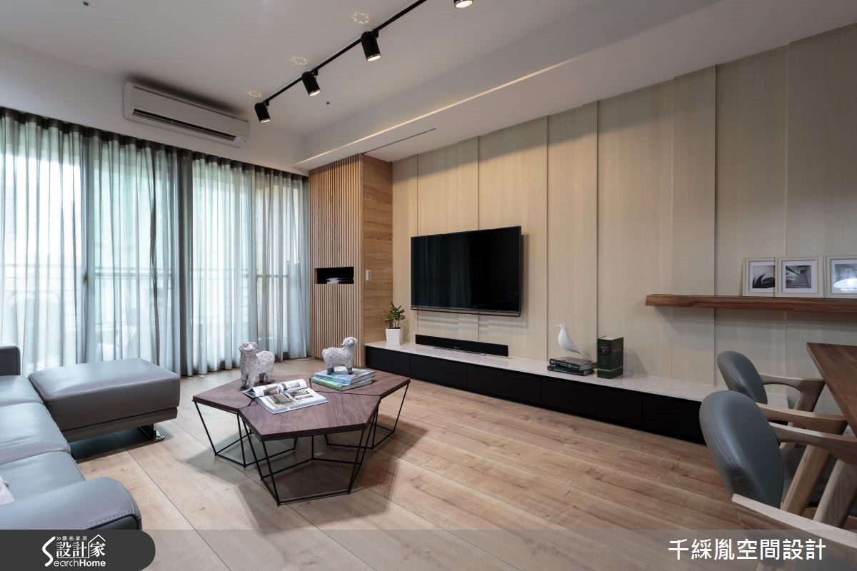 温暖的太阳光穿透纱质窗帘,洒进满室柔和光意,映照在温润的木纹质感,替全然开放的公共领域增添无限温馨与闲适氛围。【柔和用色,营造自然朴实空间】设计师利用大面采光的优势,结合大地色系基底,以及干净无华的天花板结构,塑造惬意、休闲的空间氛围;电视墙以渐层的立体壁面铺陈,并串联客、餐厅领域,再搭配悬空展示层板上的风格摆件,创造出美感与机能兼具的实用居家。餐厅旁的壁面则以清水模漆粉饰,引入朴实无华的质感,并藉由线条沟缝描绘视觉层次,搭配墨镜推门界定出书房领域;书房内利用虚实相兼的书墙,满足屋主阅读与收纳的需求,而半开放式的门扇设计,还可依使用状况开阖宽度,弹性调节光源进入室内。