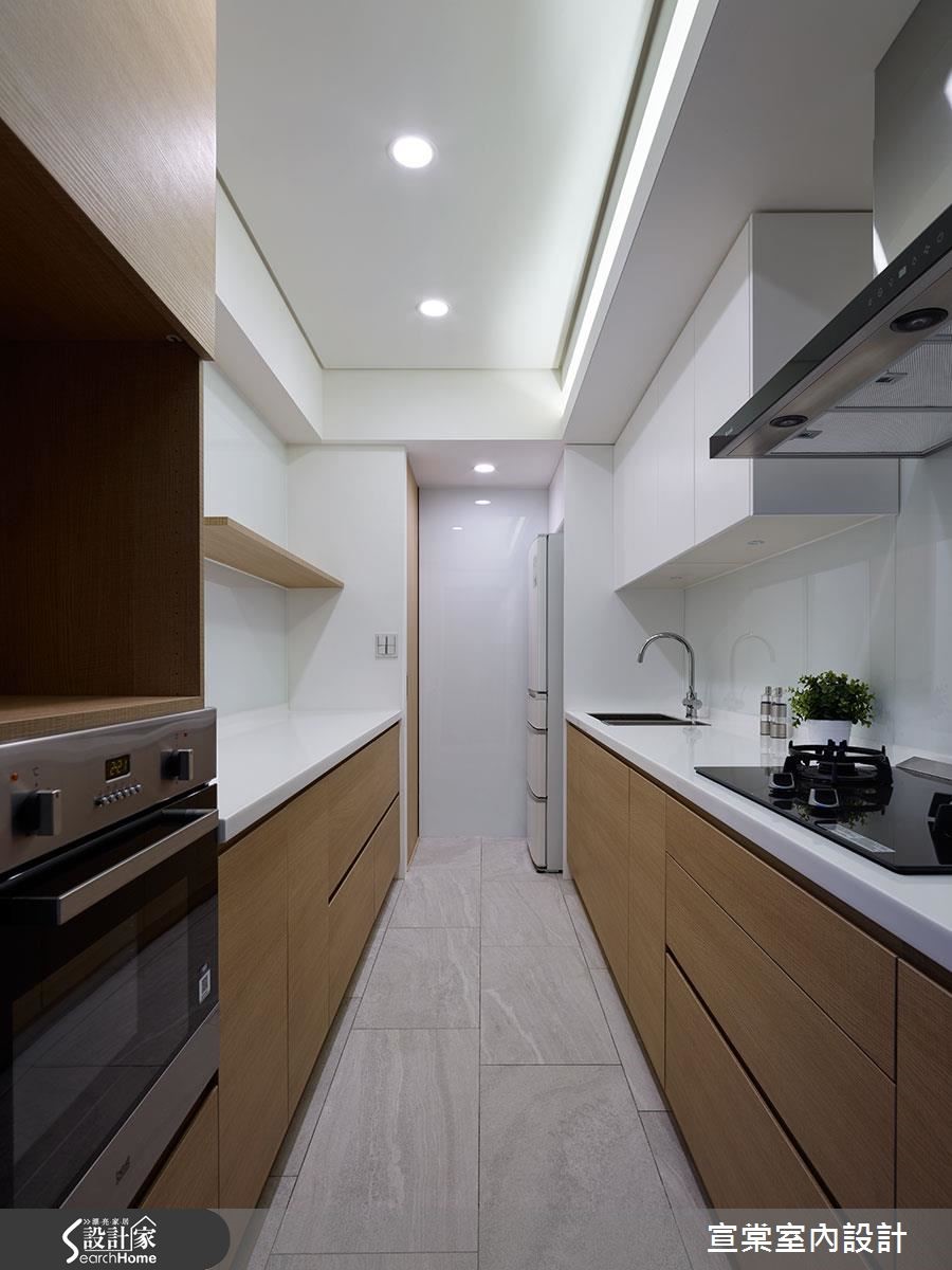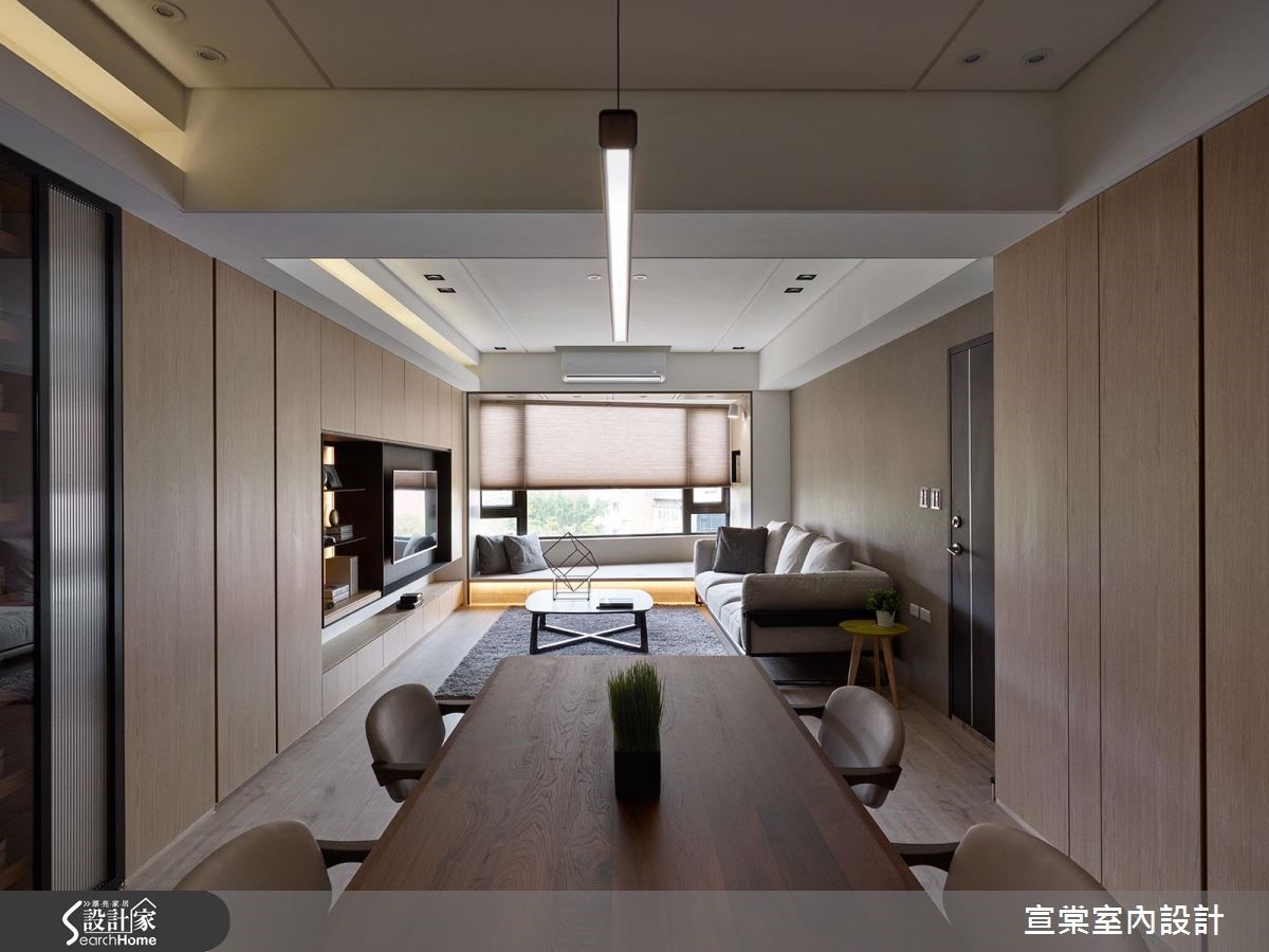 随着飘窗的开敞设计,将户外风光引入,与满室的木纹质感相互呼应,调和一抹惬意气息。并在充满梁柱的室内空间里,发挥创新的设计巧思,注入收纳机能,巧妙与梁柱并行,让立面更显完整,避免产生凹凸的畸零角落,营造机能与简约兼具的质感宅。【转化难用畸零区,变身展示空间】以现代简约风引领空间氛围,透过大量的木纹铺陈室内,并以全然开放的公领域登场,展现宽敞气度。客厅电视墙结合收纳机能,屏幕搭衬深色背板、隔板与嵌灯设计,强化客厅视觉。男屋主因为职业的需求拥有大量书籍,而常到世界各地出差的女屋主也收藏不少城市杯。设计师善用梁柱结构下的畸零地带,创造出丰富的收纳机能,特别是客、餐厅设置整排收纳柜及城市杯展示柜。而客厅的临窗处则规划飘窗,让屋主能够陪伴家中的孩子阅读,顺着大梁结构转化为拱门造型,藉此消弭柱体突兀感,壁面的中央设置美学展示区。飘窗下方则打造出玩具收纳柜,一次满足美感与机能运用。