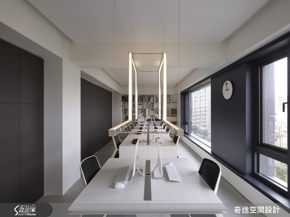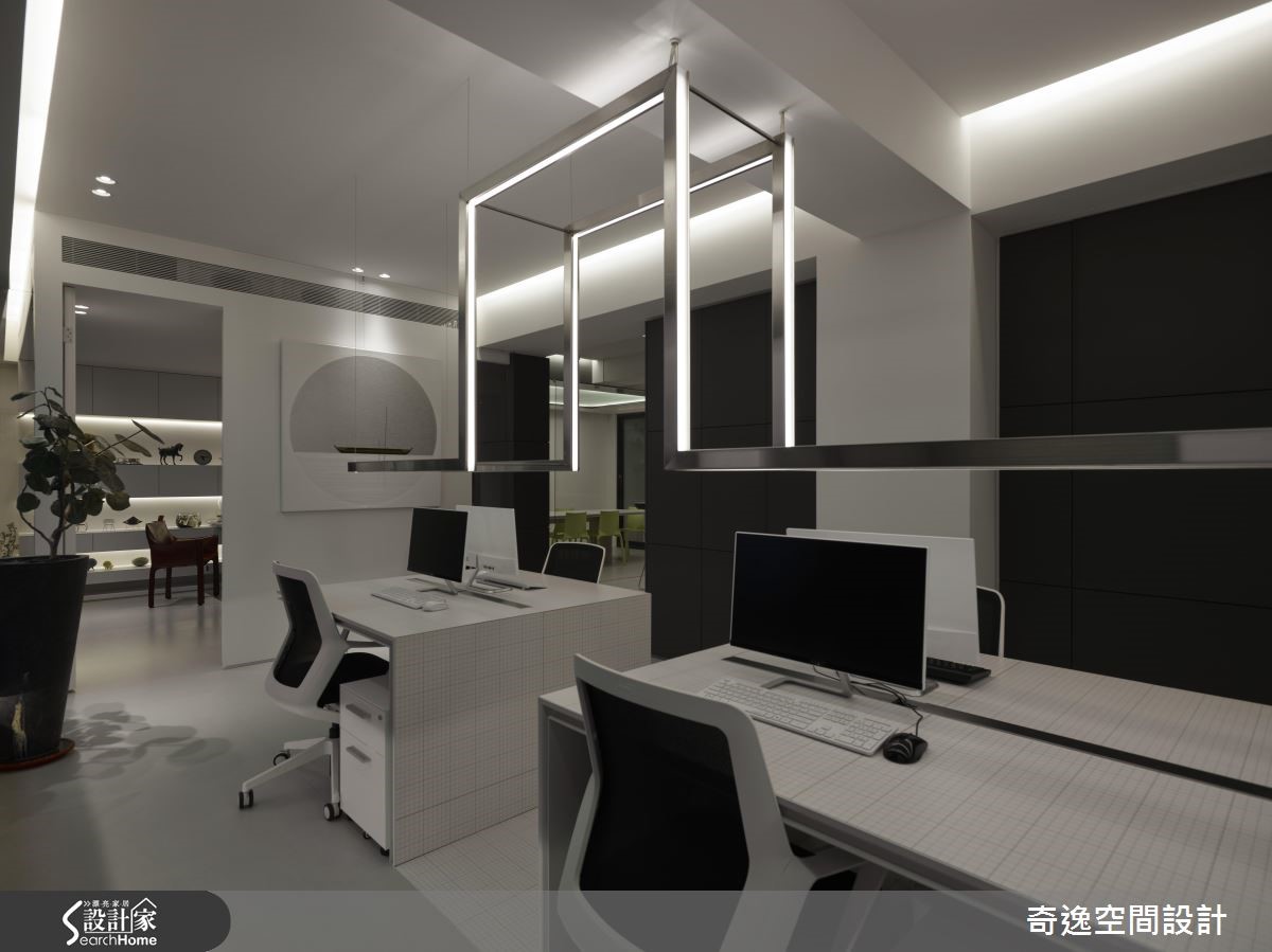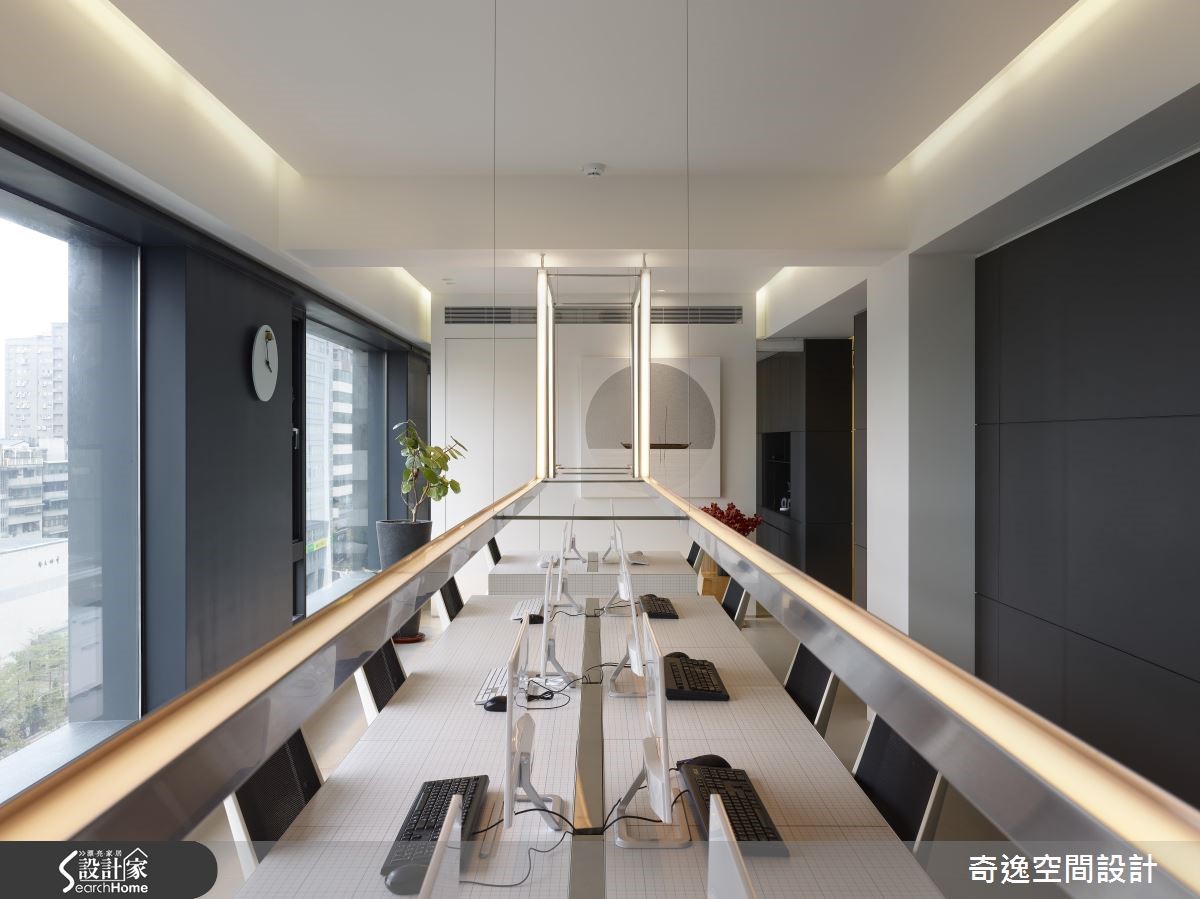 104平方米老屋,是奇逸空间设计团队的办公室,设计师规划自家办公室,想必更能确切掌握各项机能与格局;沿用空间的13米窗面,创造丰富多变的景观,给予混搭风挹注,创造美感不设限的创意环境,让员工更能激发工作潜力。【运用未来感设计,激发创意火花】大门处,设计师以深灰布纹砖铺陈壁面、建构专业印象,运用渐层纹理创造视觉层次,形成由外向内的动线导引。走进室内,则可见不规则切割的花岗石桌台,作为接待、会议与休憩的多功能区域,梁体则自然横亘于天花,有如后现代的艺术雕塑。藉由既有景观优势,安排长型会议桌,以绿意、采光营造纾压感,帮助团队激发更多创意火花。而俐落对称的框线设计,搭配着轻薄电脑屏幕、带有未来感的灯光,演绎出简洁洗练的后现代时尚场景。