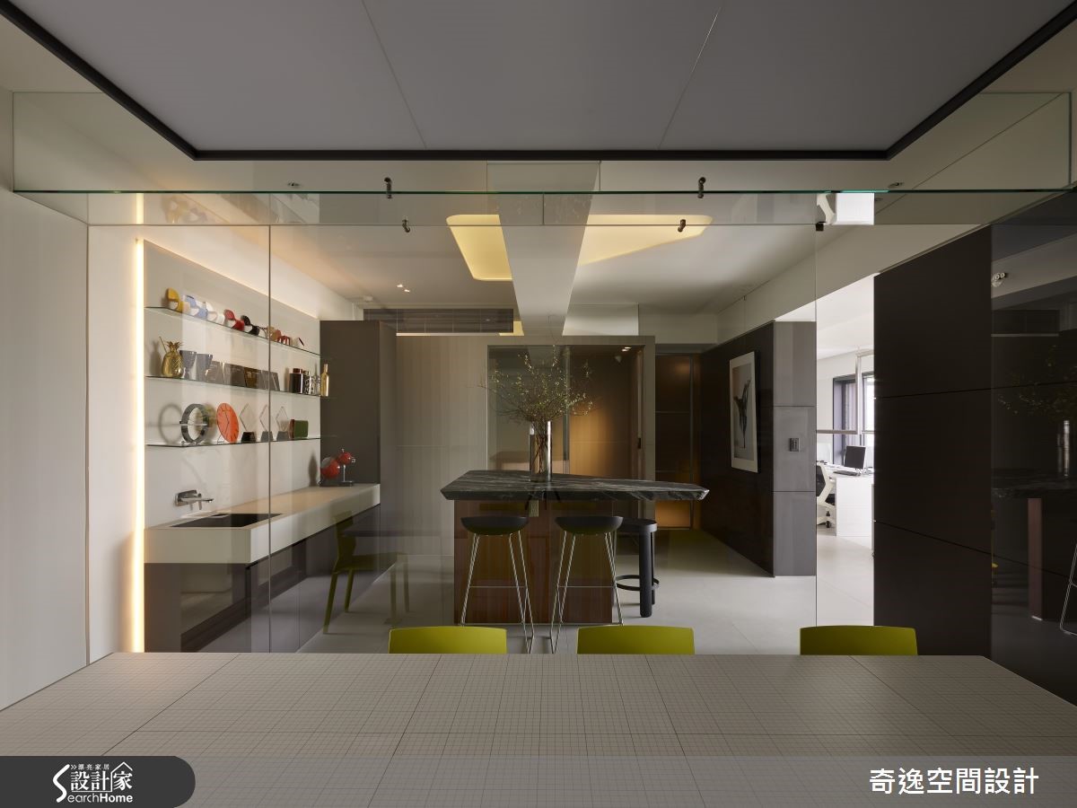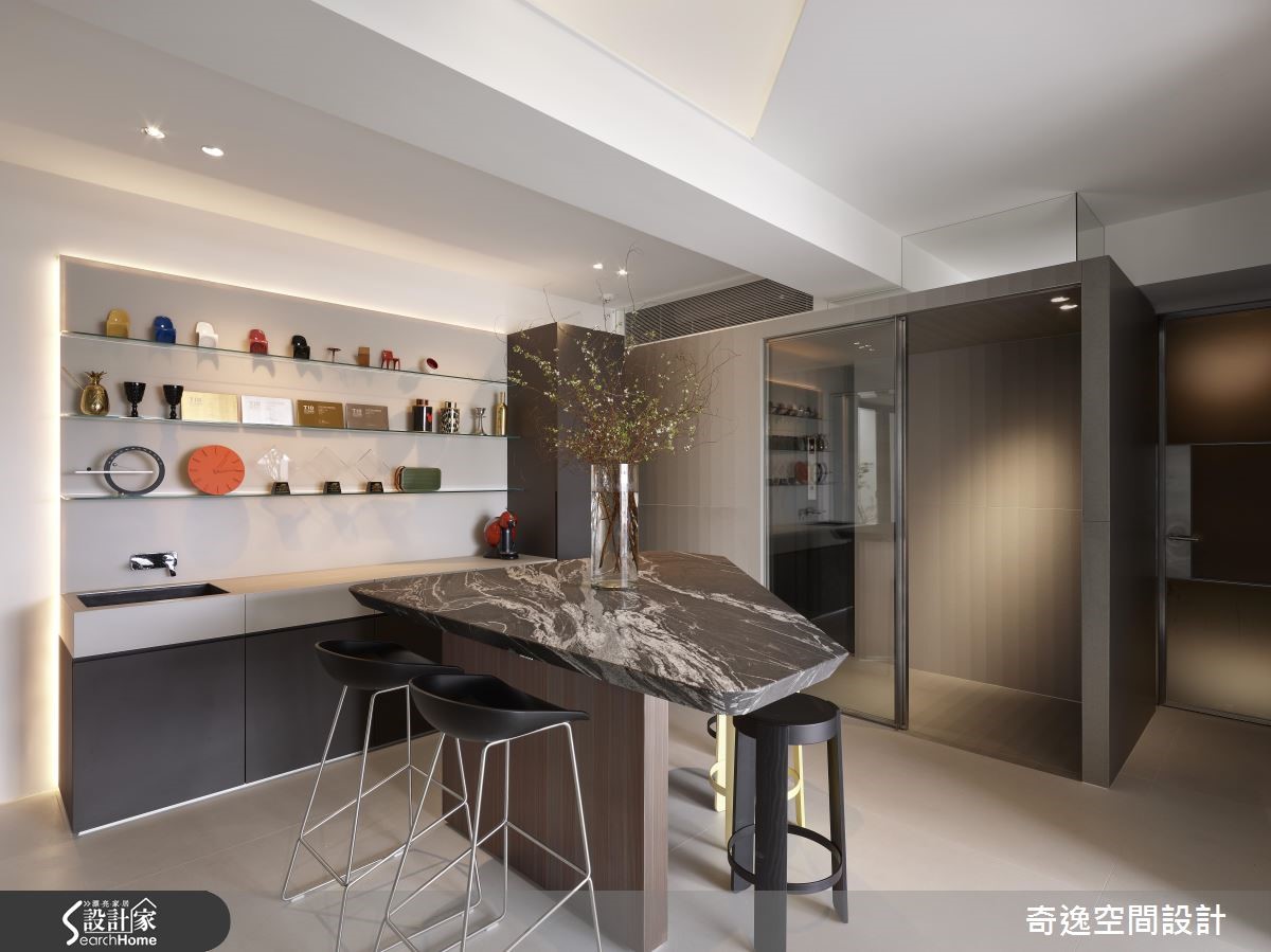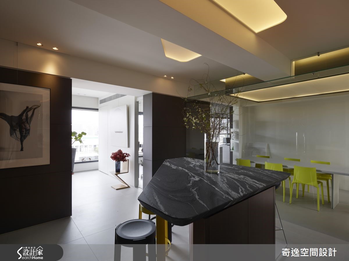 104平方米老屋,是奇逸空间设计团队的办公室,设计师规划自家办公室,想必更能确切掌握各项机能与格局;沿用空间的13米窗面,创造丰富多变的景观,给予混搭风挹注,创造美感不设限的创意环境,让员工更能激发工作潜力。【运用未来感设计,激发创意火花】大门处,设计师以深灰布纹砖铺陈壁面、建构专业印象,运用渐层纹理创造视觉层次,形成由外向内的动线导引。走进室内,则可见不规则切割的花岗石桌台,作为接待、会议与休憩的多功能区域,梁体则自然横亘于天花,有如后现代的艺术雕塑。藉由既有景观优势,安排长型会议桌,以绿意、采光营造纾压感,帮助团队激发更多创意火花。而俐落对称的框线设计,搭配着轻薄电脑屏幕、带有未来感的灯光,演绎出简洁洗练的后现代时尚场景。