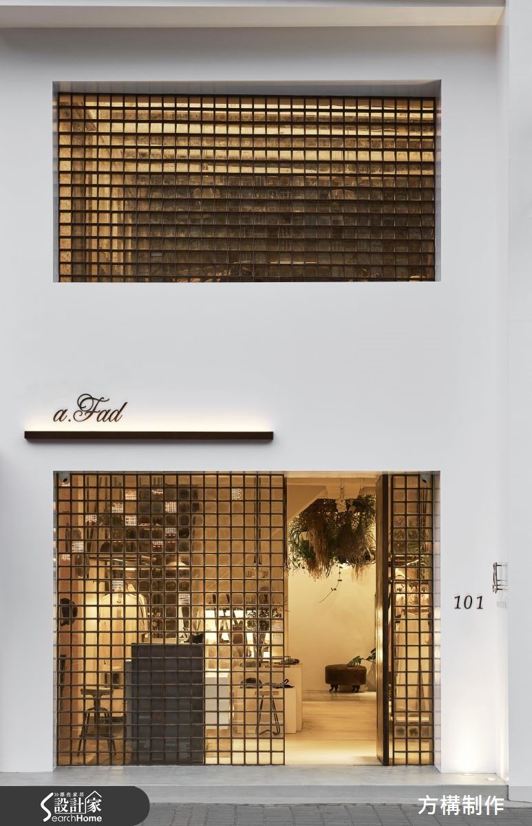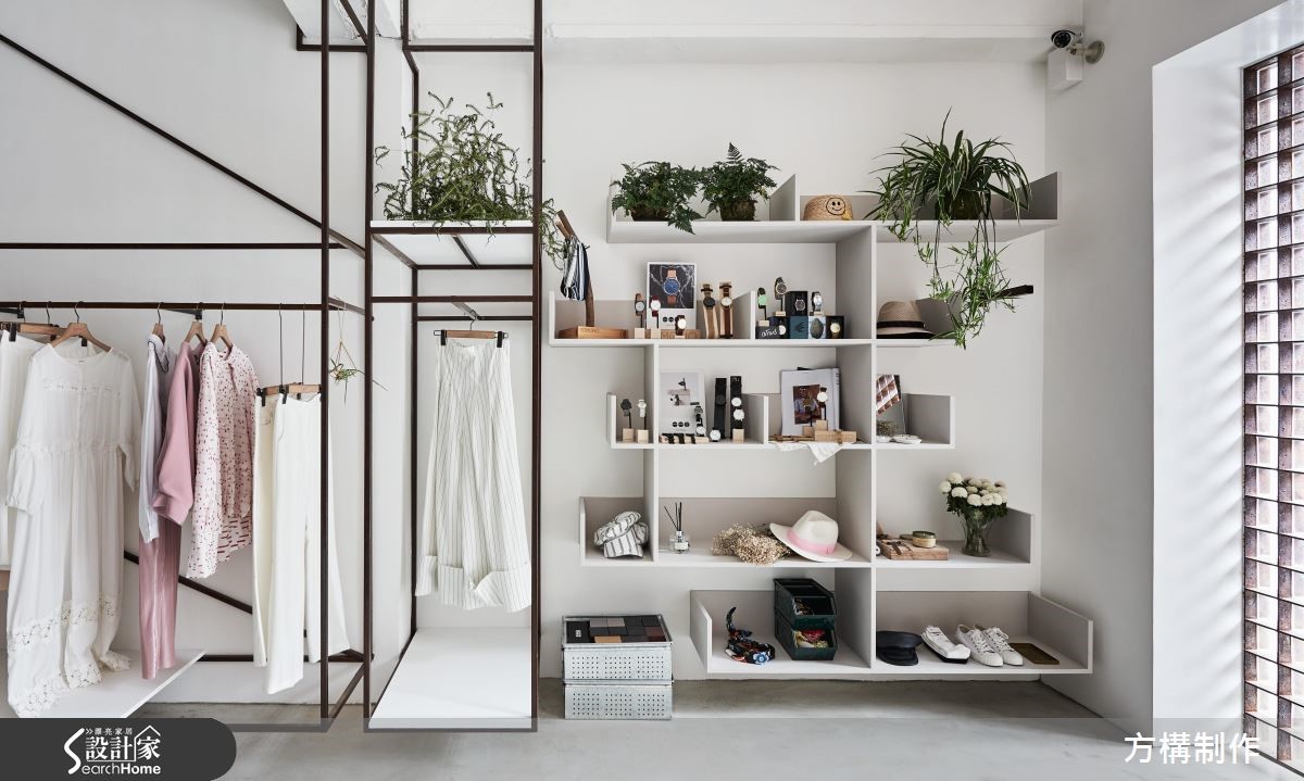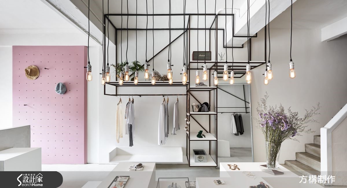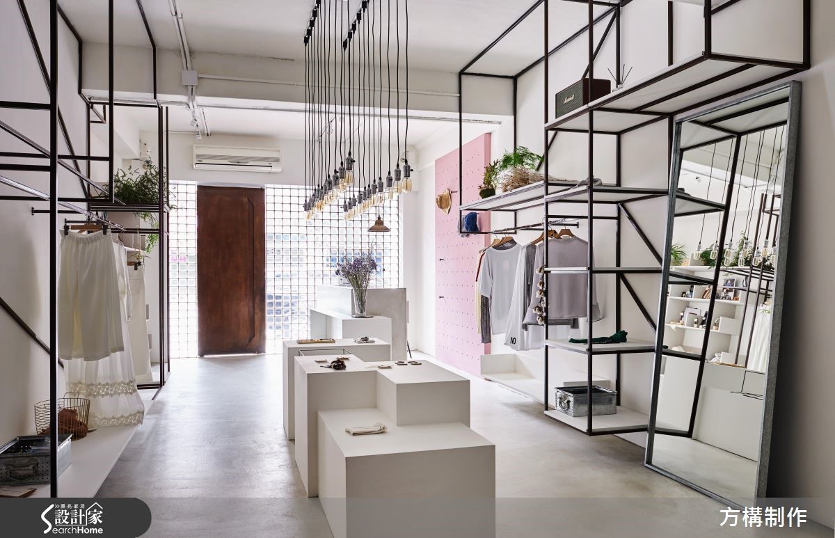 两层楼的纯白色建筑,为"AFAD"韩国服饰精品门市,设计师改变了老屋原本的杂乱外观,赋予优雅俐落的立面线条,两道大面玻璃窗,为室内引入充裕的自然光线,并藉由铁件划分出小窗格,营造出若隐若现的隐约神秘感。【花草植栽,中和空间刚硬冷调】建筑采用大面积纯白色外观,搭配优雅的铁件字体logo,给予顾客干净、清新的时尚印象;走进店内,在商品陈设规划上,以细铁打造俐落的收纳框线,从纯白与水泥的浅灰色调中,跳出鲜明的层次对比。 富有甜美气息的粉红色洞洞板则可悬挂帽子、配件等商品,并依照物品的特质,随时改变高低位置,布置成极具时尚话题的展示墙;往室内深入,利用花砖铺陈地坪,切分出后方更衣区的独立性,搭配植物绿意点缀,也让购物氛围更加舒适放松。