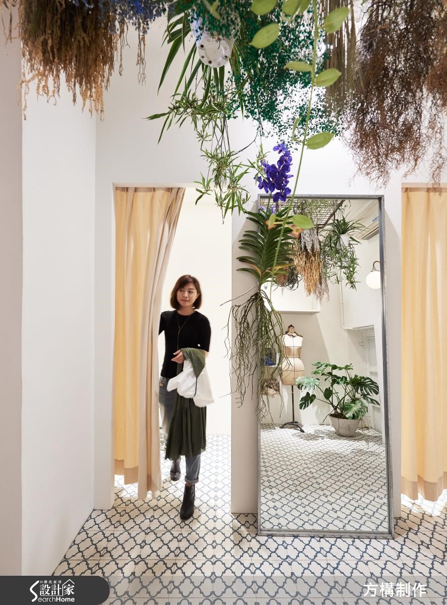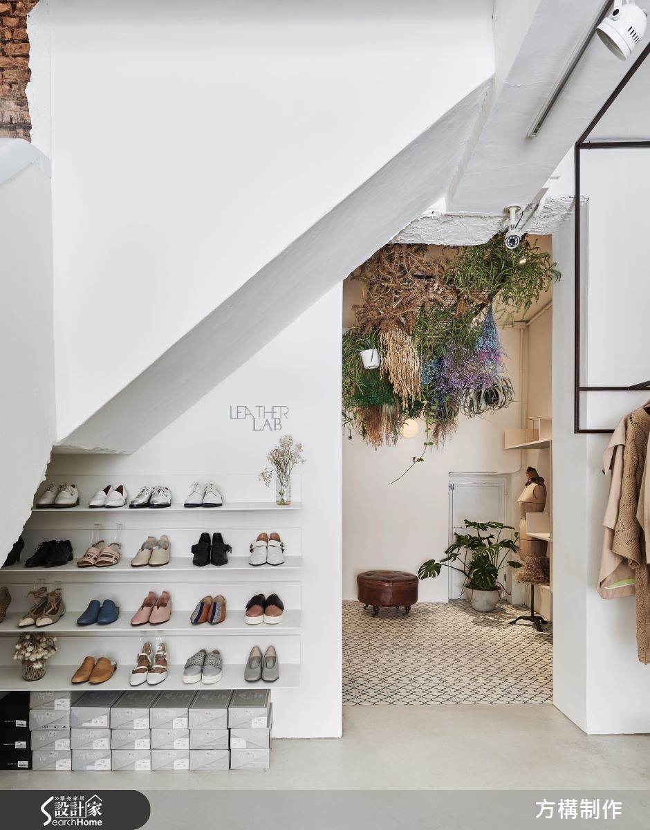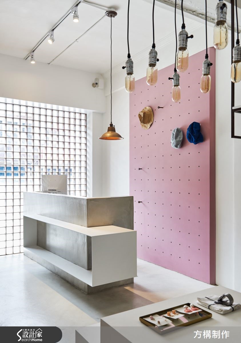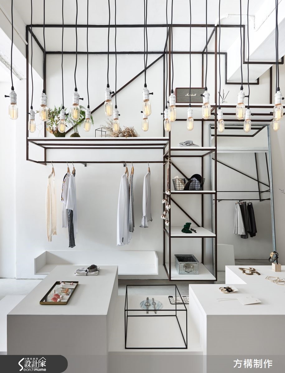 两层楼的纯白色建筑,为"AFAD"韩国服饰精品门市,设计师改变了老屋原本的杂乱外观,赋予优雅俐落的立面线条,两道大面玻璃窗,为室内引入充裕的自然光线,并藉由铁件划分出小窗格,营造出若隐若现的隐约神秘感。【花草植栽,中和空间刚硬冷调】建筑采用大面积纯白色外观,搭配优雅的铁件字体logo,给予顾客干净、清新的时尚印象;走进店内,在商品陈设规划上,以细铁打造俐落的收纳框线,从纯白与水泥的浅灰色调中,跳出鲜明的层次对比。 富有甜美气息的粉红色洞洞板则可悬挂帽子、配件等商品,并依照物品的特质,随时改变高低位置,布置成极具时尚话题的展示墙;往室内深入,利用花砖铺陈地坪,切分出后方更衣区的独立性,搭配植物绿意点缀,也让购物氛围更加舒适放松。