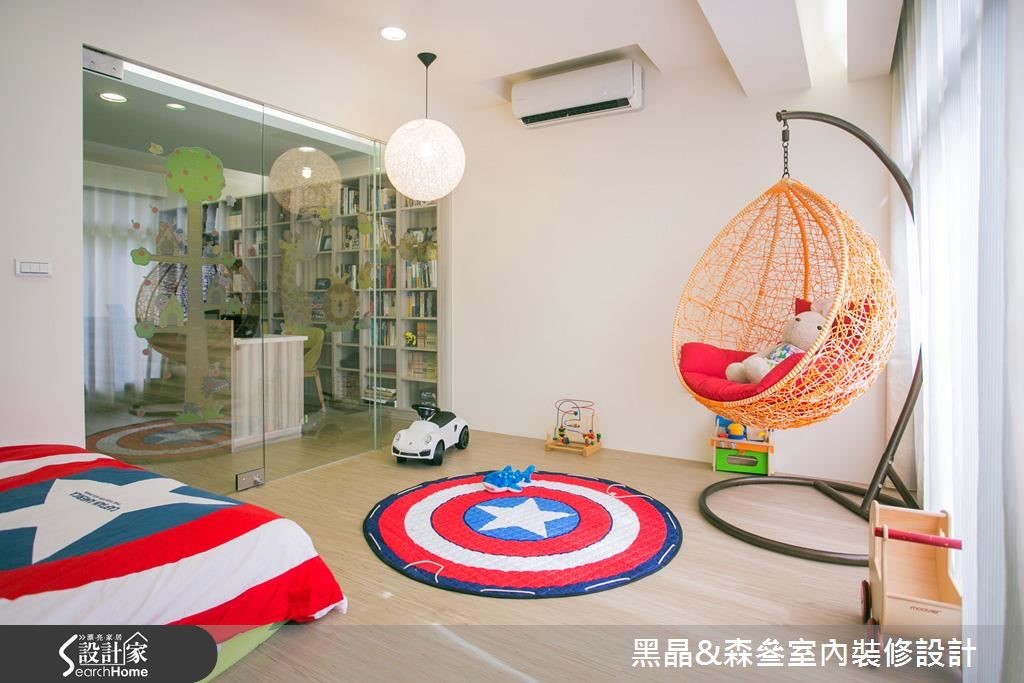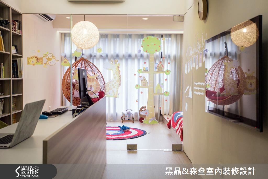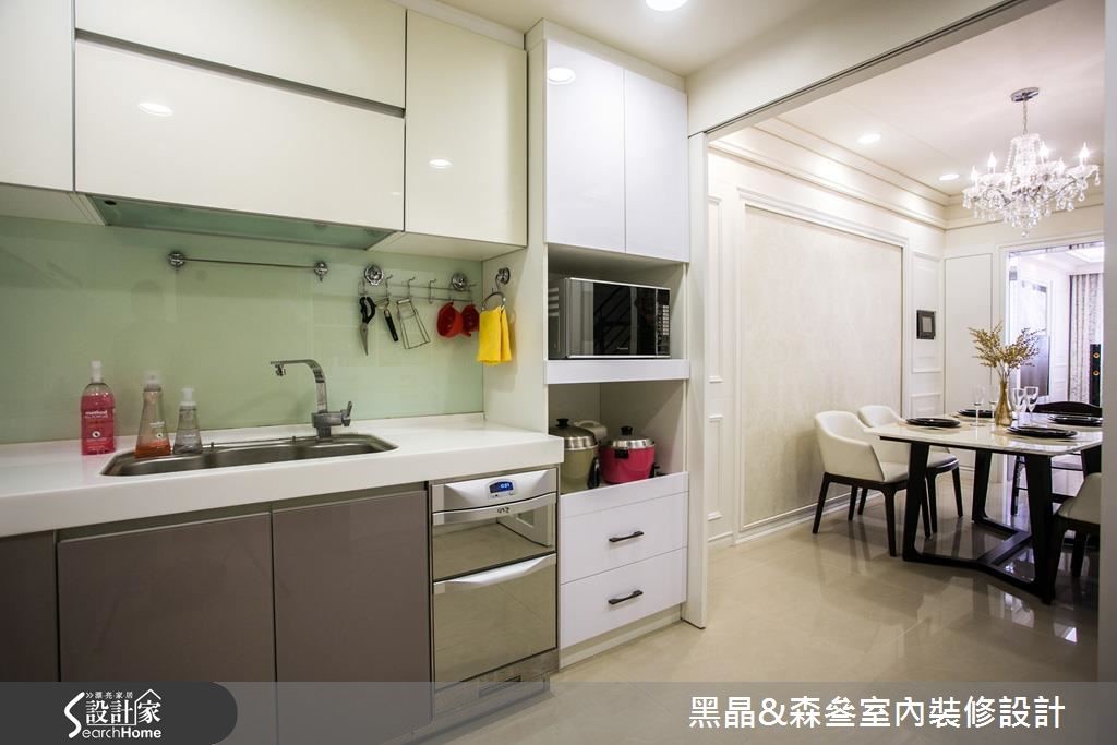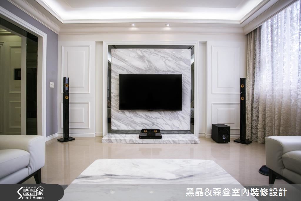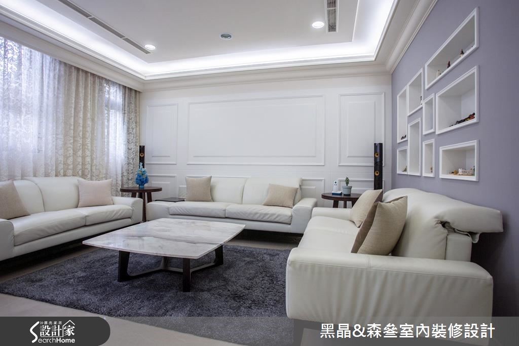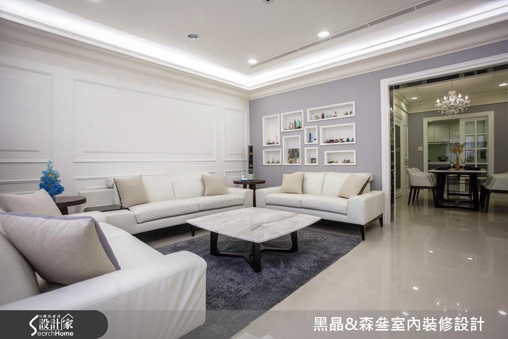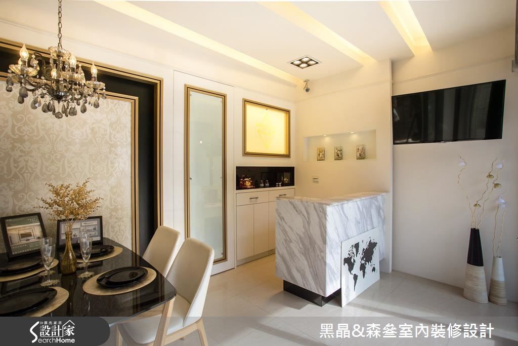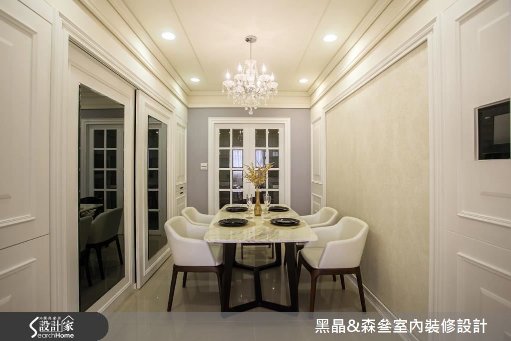 入口处以亮眼的金色质感挥洒,并利用黑色调勾勒出视觉层次,搭配优雅的壁纸铺陈壁面,以及大理石材质与水晶吊灯的妆点,营造出优雅的迷人景致。【清新色调,优雅串联全室空间】开放的客、餐厅空间里,带着自然纹理的石材作为电视墙基底,深色镜面框出周围造型,展现大器之姿;沙发背墙以线板描绘出简单且对称的视觉美感,侧边则以紫色为底,并以白色边框的收纳展示机能,与背墙上的线板造型相互呼应。延续客厅的新古典风格,餐厅区以米色调铺陈,藉由镜面、水晶吊灯的装饰,引入动人的美学质感,一旁则以拉门界定厨房,烹调时可将拉门阖上,隔绝油烟四溢的恼人问题。