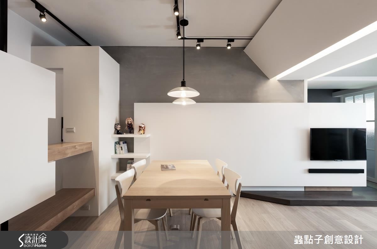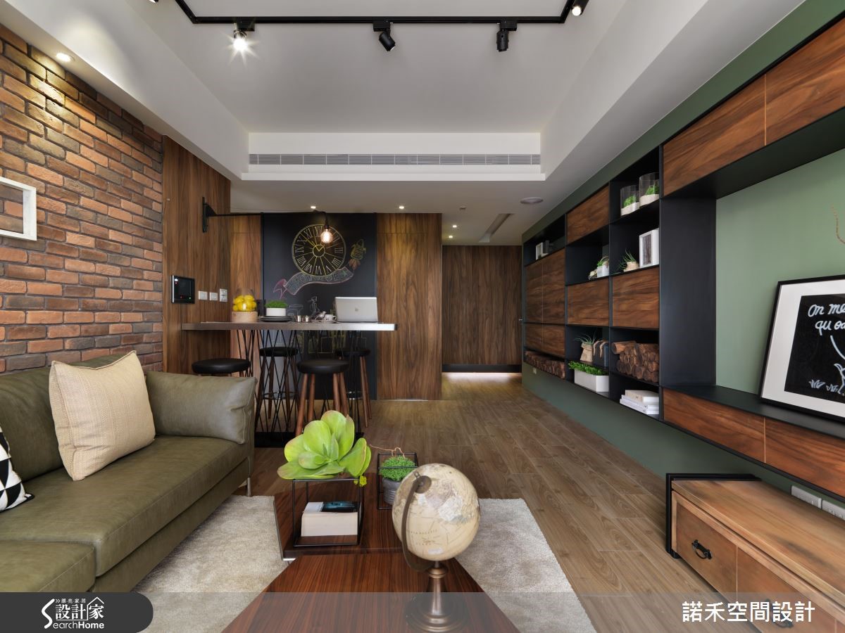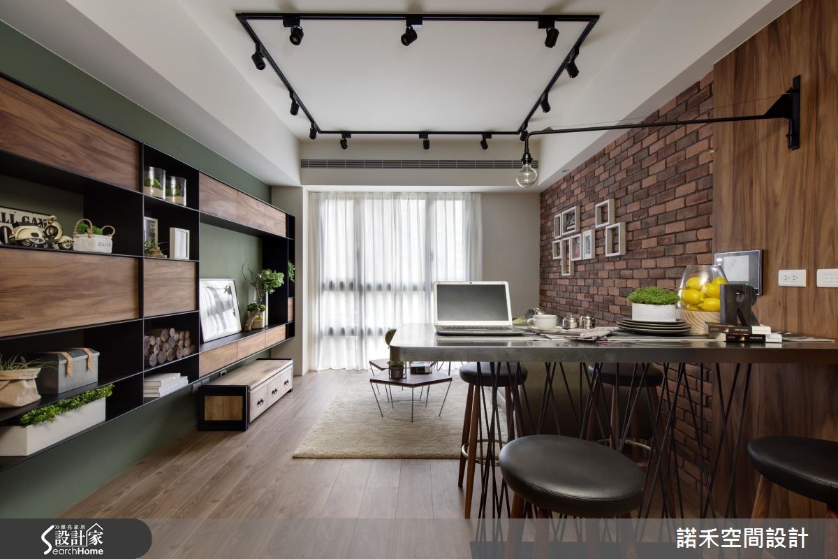 99平方米住宅,屋主为韩国华侨,相当着迷粗犷、自然的居家风格,于是设计师采以Loft风作为此案风格定调,把冰冷铁件揉合温润木纹,再搭衬充满复古韵味的红砖墙,创造出属于居者的生活温度。【以收藏品陈列,展现生活感】设计师让客厅电视墙结合展示意义,透过利落的艺术线条隐去量体感,搭配家饰收藏品的陈列,增添日常生活感,而与之对应的,是以红砖铺陈的沙发墙面、复古的质材色调,呼应Loft的经典元素。【沙发墙衔接吧台,型塑轻盈感】沙发墙旁衔接餐食吧台,形成轻巧的用餐地带,并藉由不锈钢桌面、手绘黑板墙等妆点;同时,也可见到门片线条的修饰隐形,不着痕迹地融入在木纹之中,展现干净的立面表情,卧房以木质搭配布面壁材,烘托舒适的放松氛围!
