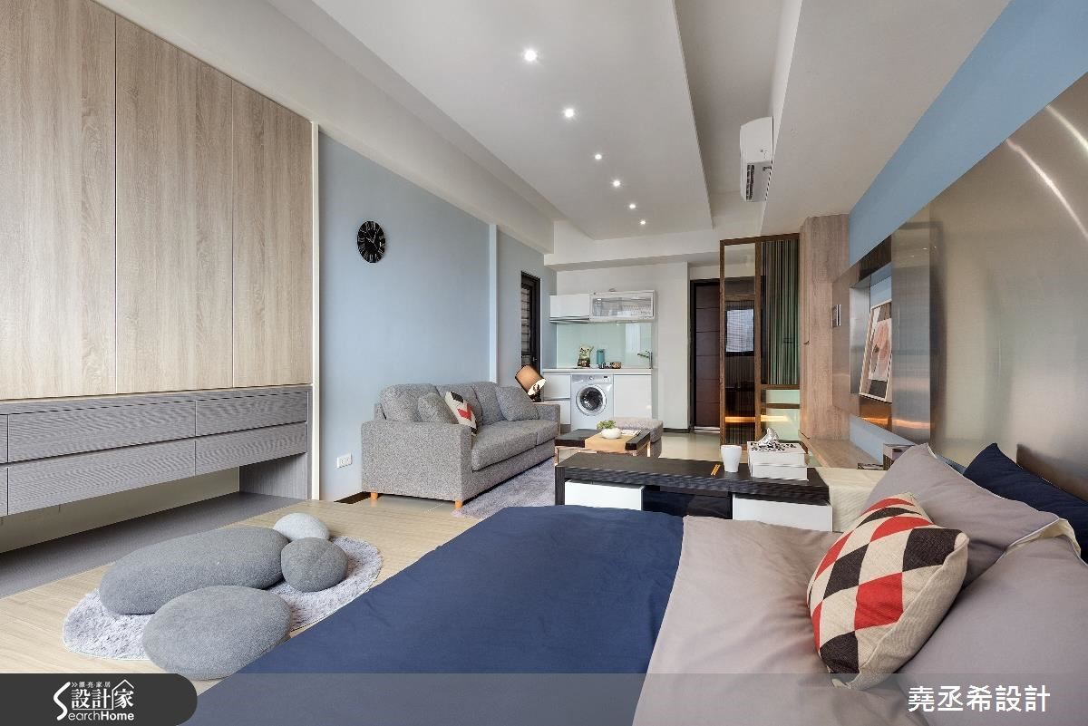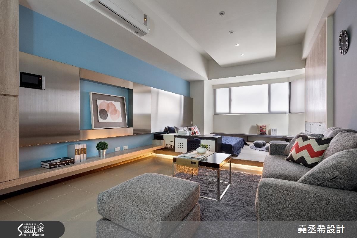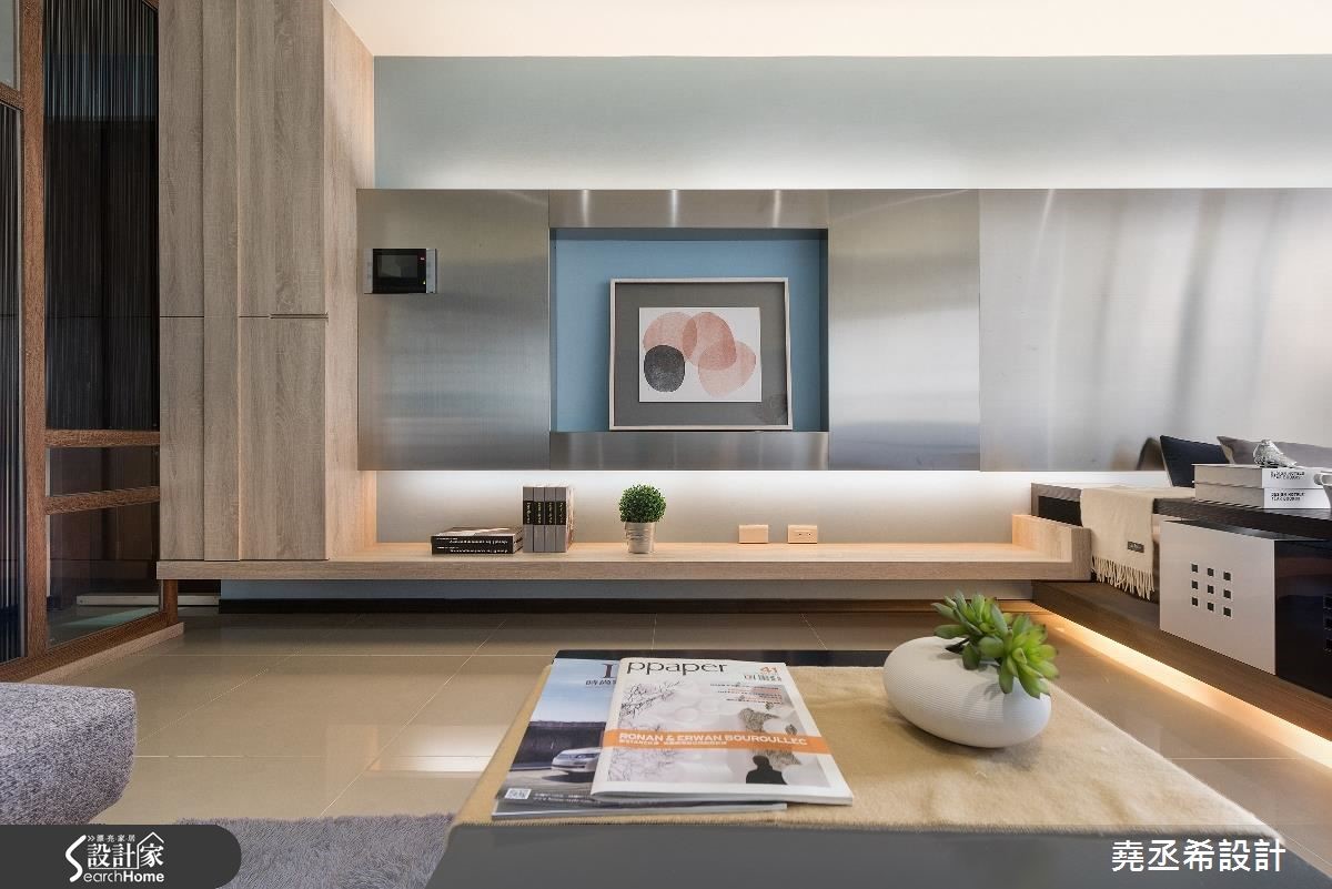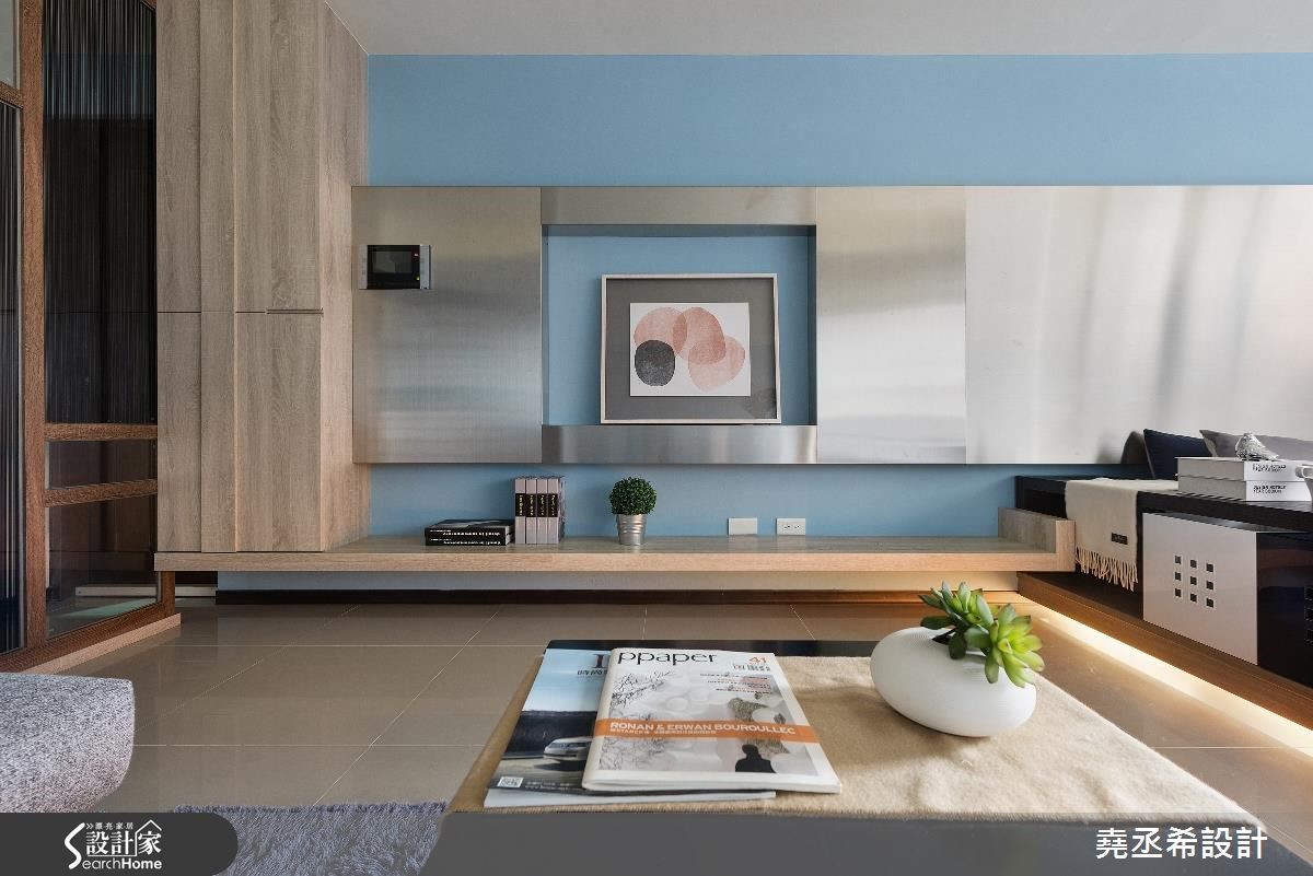 壁面以深浅两种色调的蓝铺叙,呈现柔美的渐层感受,一道金属板从电视墙延伸到卧室床头,闪耀着前卫金属质感的光芒,让科技风转为室内设计的一部分,并透过材质的延伸,拉阔视野,43平的空间自然更显宽敞。【木建材增添暖意,平衡金属冷调】木作与玻璃的材质创造一面穿透感的小隔屏,界定出玄关与室内公领域。而长型的空间里,更藉由架高木地板的方式,让客厅与卧室间彷佛形塑一道隐形隔断,将生活领域清楚划分。以金属板衬底的电视墙,周围搭配木作柜体与平台,挹注温暖的人文气息,并满足生活实用所需。针对原始格局采光不足的问题,设计师打造一面窗户迎接户外光线,并让空间对外敞开;沿窗规划一处飘窗区,成为屋主平日阅读、喝茶的休闲角落,好不惬意。