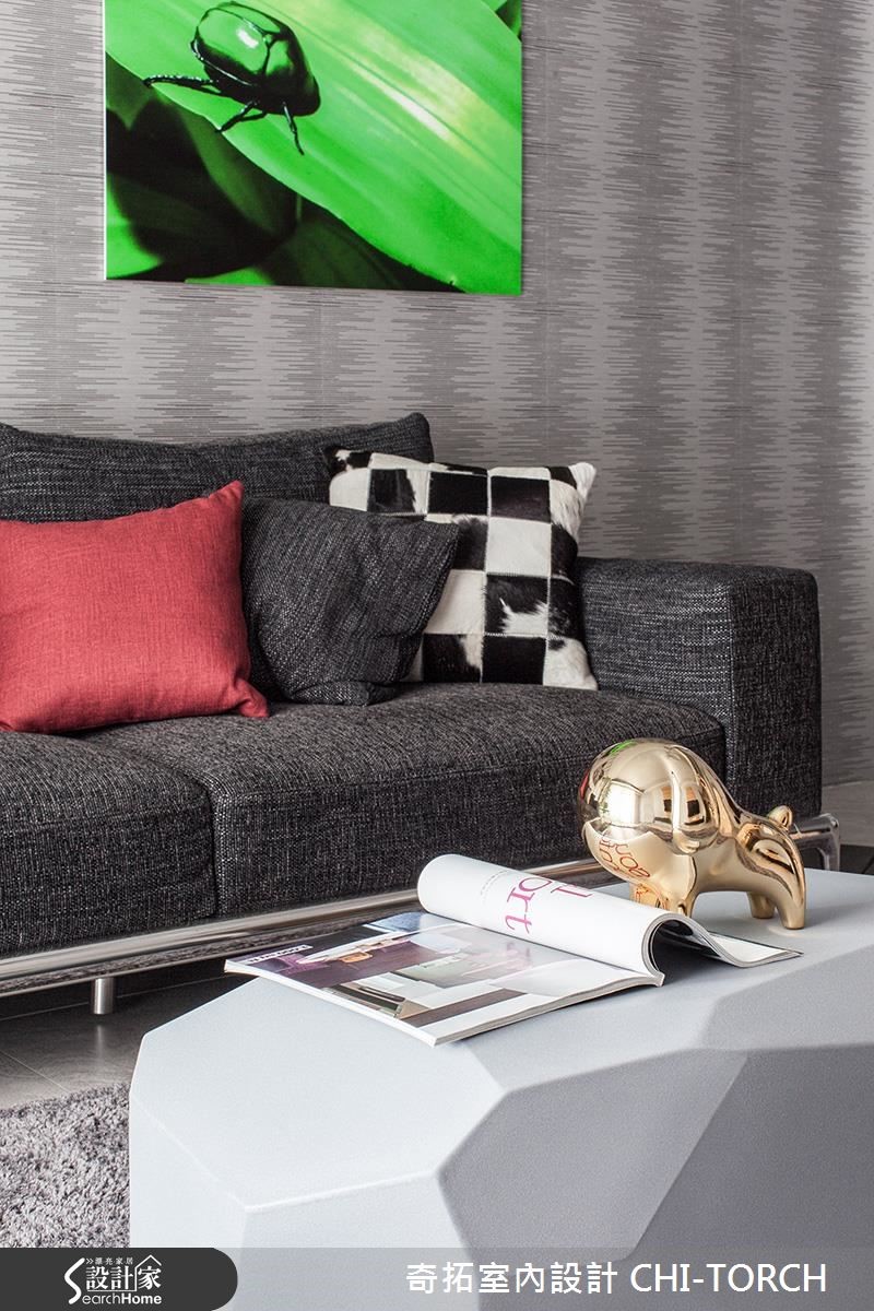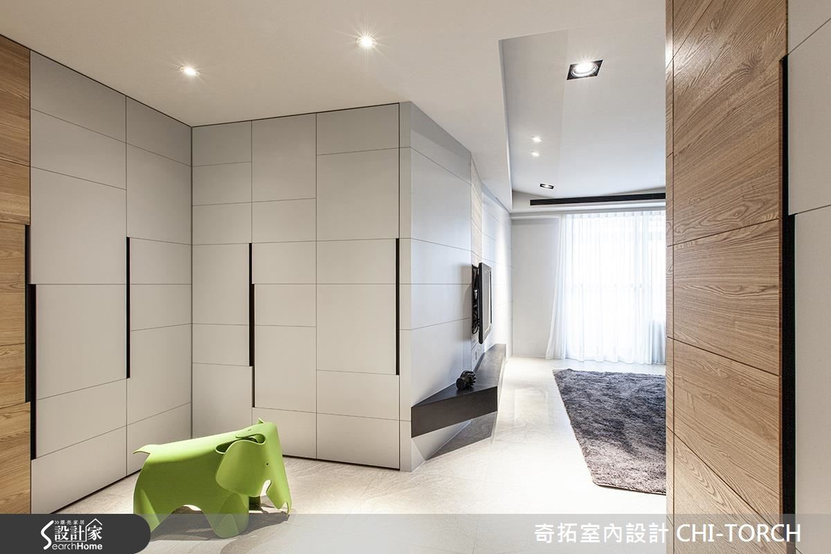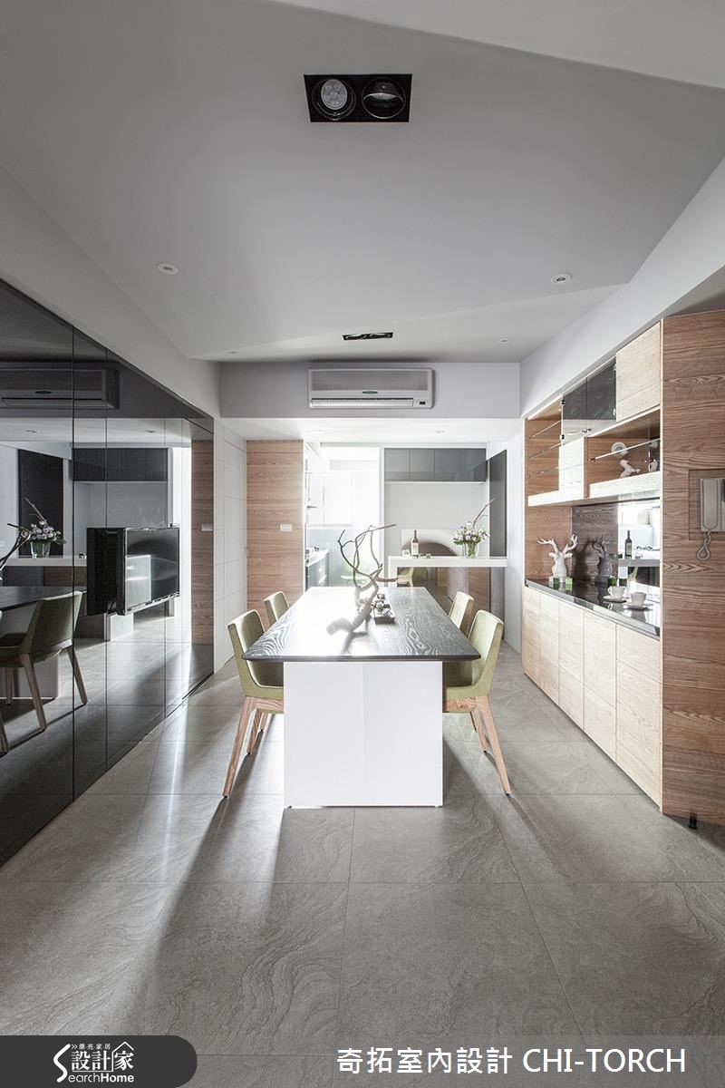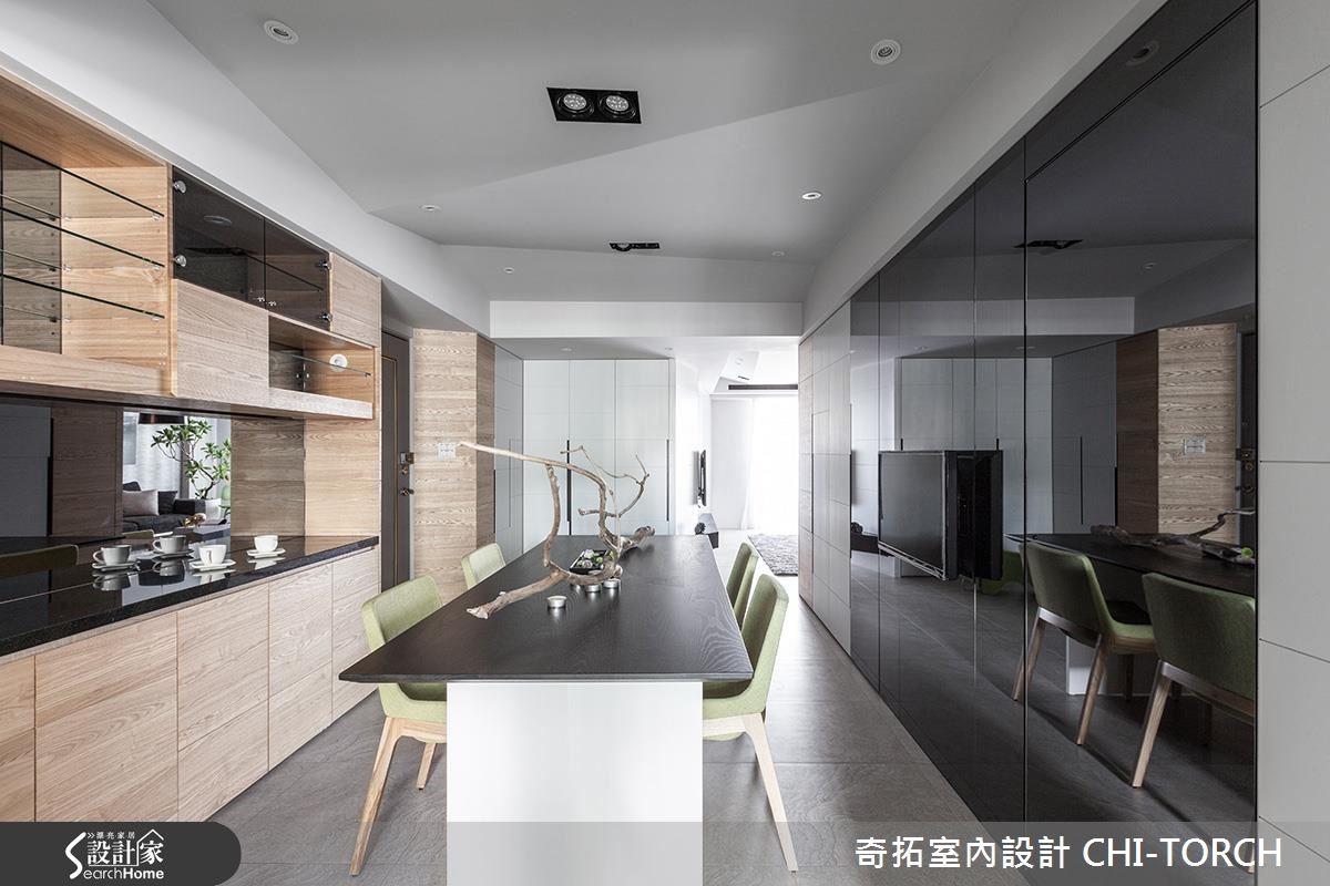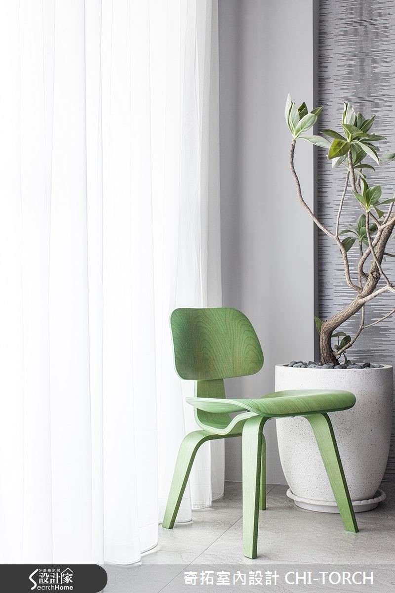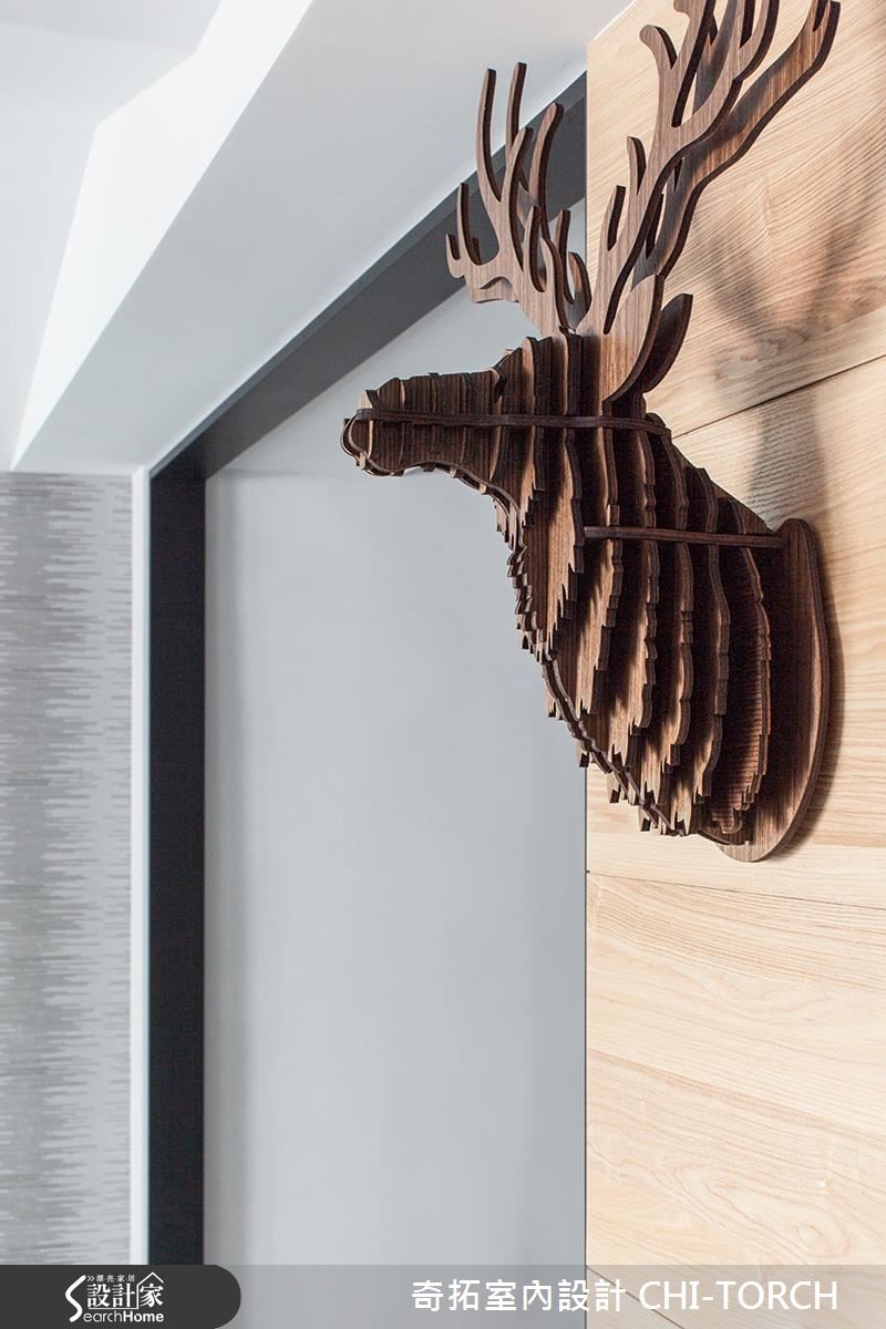 已届退休年龄的屋主夫妻,喜爱简约明亮的北欧风格,面对成家立业的儿女,贴心地想把拥有一家人共同回忆的老屋重新改造,让儿女孙子返家时,有着更舒适的生活空间。 【连贯式柜墙,确保实用与活动面积】平时106平居家内为3位成人,不定时拜访的会有4位大人与2个孩子,外加1只毛孩。为了因应人口结构改变,设计团队重整零碎格局并改善采光、通风问题,拓增公领域、打开视野,打造让家人们得以好好欢聚的时光。为了同时符合退休双亲与同住单身子女的喜好,设计团队同时结合绿意慢活与时尚简约两种风格,利用双斜设计的天花,象征绵延与两代连结的叶脉意象。玄关以延伸至电视墙的大面积柜体提供充裕的收纳机能,并为了维护儿童安全而简化把手,开放式客厅、书房与用餐空间串连一家9口的欢笑细语,无损各空间机能却没有隔阂。餐厅以镜面放大空间感受,并利用拉门阻隔油烟问题与维持儿童安全。针对北欧风格营造,设计师采用绿栽、缤纷家具与鹿头装饰,沐浴在清爽的木质色调与明亮阳光之下,显得温暖清新。
