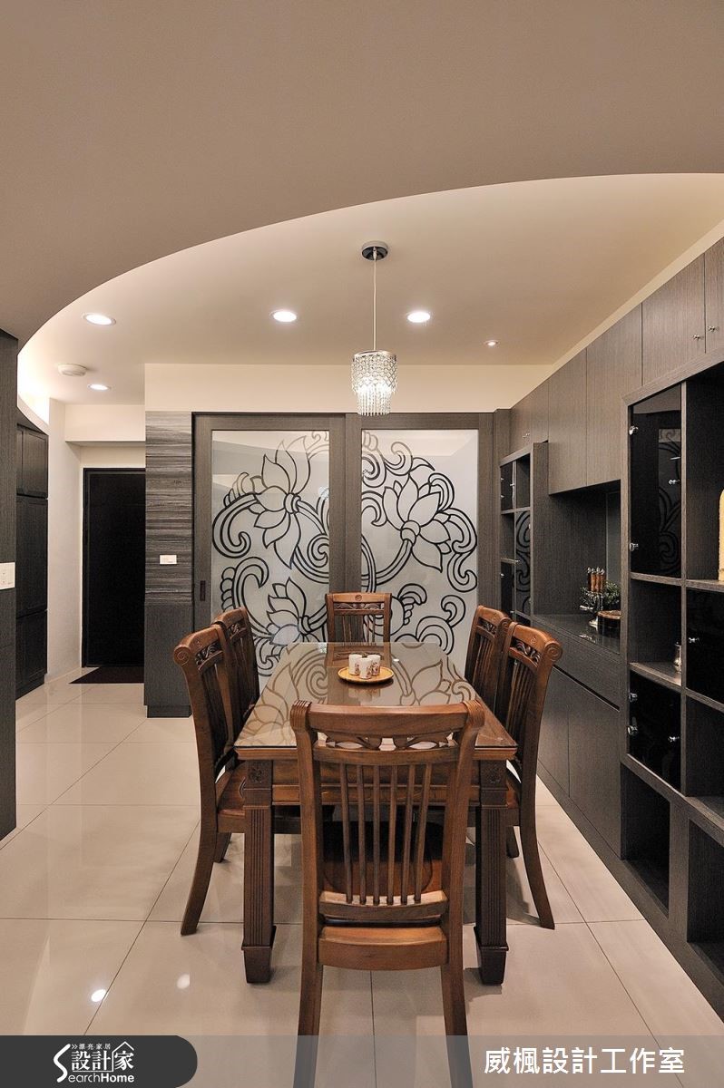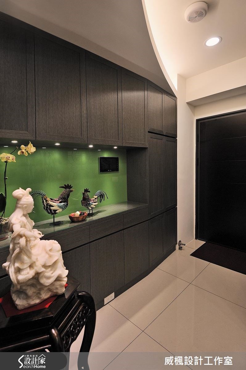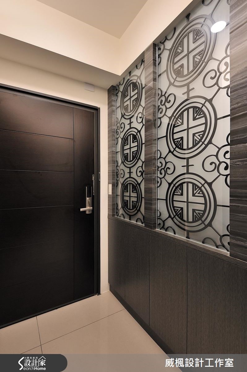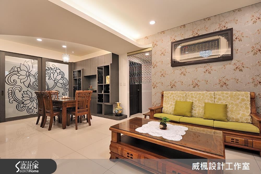 以东方风情作为室内调性,弧形的线条修饰天花板的大梁,展现和谐与圆满的意象,再藉由深色系的铺陈,调和安定、沉稳的空间氛围;并以中式家具作为摆设,加上屋主收藏多年的山水画作壁面妆点,交织出现代与复古相融的居家风尚。【玻璃隔断,引光入室更明亮】玄关处以深色木作打造鞋柜,搭配绿色烤漆壁面与风格艺品的摆设,展现活泼生动的领域气息;另一侧以木作结合玻璃材质的隔断技法,让光源得以局部透入,并在玻璃片上以中式窗花的意象描绘,客制化的独特设计,呼应整体风格走向。客厅里灰色壁面的电视墙,融入中式山水画作,营造出沉稳的优雅意境,沙发背墙以轻柔质感的花卉壁纸铺陈,替内敛的氛围注入自然生气;而厨房区则以玻璃拉门创造半开放式格局,整面门扇以莲花图腾的线条勾勒,描绘出雅致的东方色彩。