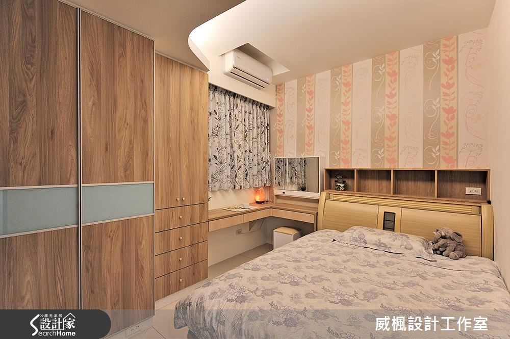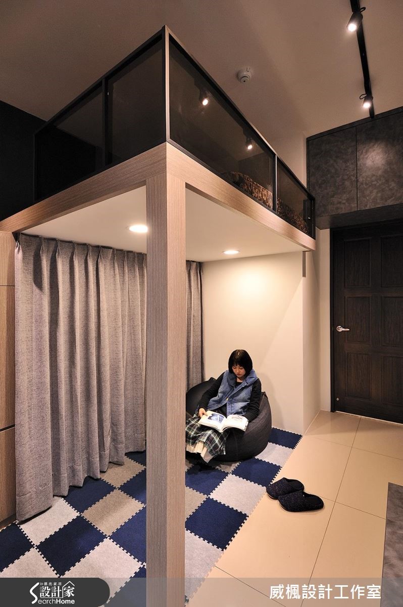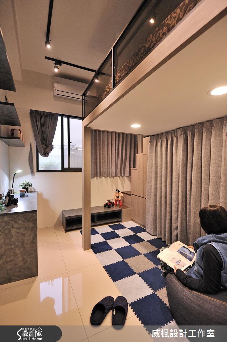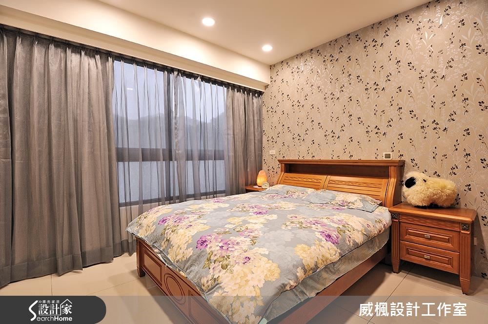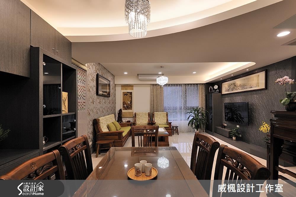 以东方风情作为室内调性,弧形的线条修饰天花板的大梁,展现和谐与圆满的意象,再藉由深色系的铺陈,调和安定、沉稳的空间氛围;并以中式家具作为摆设,加上屋主收藏多年的山水画作壁面妆点,交织出现代与复古相融的居家风尚。【玻璃隔断,引光入室更明亮】玄关处以深色木作打造鞋柜,搭配绿色烤漆壁面与风格艺品的摆设,展现活泼生动的领域气息;另一侧以木作结合玻璃材质的隔断技法,让光源得以局部透入,并在玻璃片上以中式窗花的意象描绘,客制化的独特设计,呼应整体风格走向。客厅里灰色壁面的电视墙,融入中式山水画作,营造出沉稳的优雅意境,沙发背墙以轻柔质感的花卉壁纸铺陈,替内敛的氛围注入自然生气;而厨房区则以玻璃拉门创造半开放式格局,整面门扇以莲花图腾的线条勾勒,描绘出雅致的东方色彩。