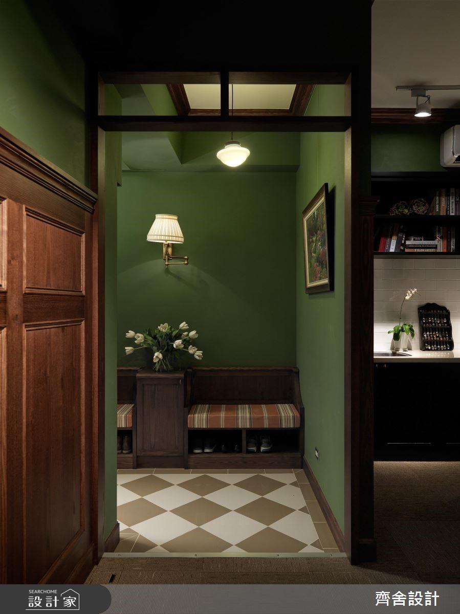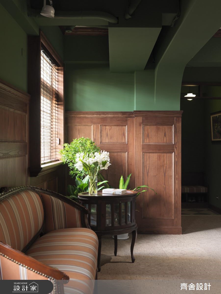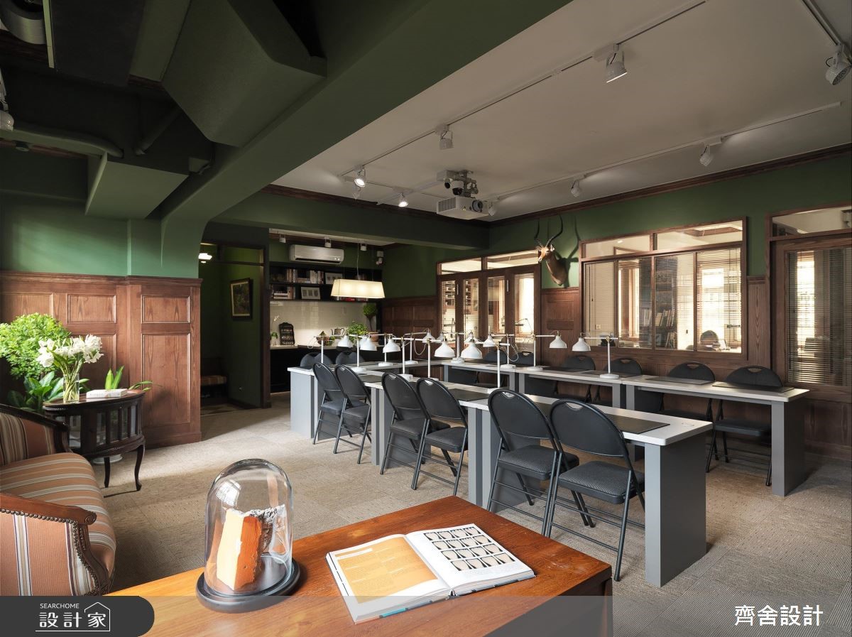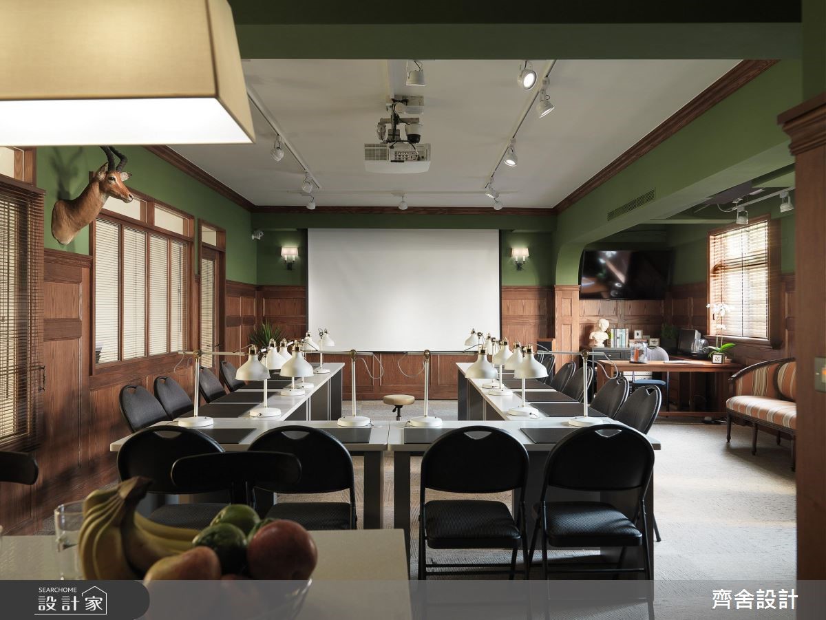 难以想像牙医诊所也可以这么美!牙医诊所的研讨中心,以墨绿色墙面、深色原木打造道地的美式风情境,有如将电影“王牌特工“办公室场景实地还原,巧合得连墙面上的鹿头装饰都如出一辙。【巧妙运用百叶窗,营造通透视觉】会议室整体以浓郁的绿色定调,搭配深色原木打造的壁板,围塑出温润的人文底蕴。同时结合不夸张的英式家具,以及含有历史感的鹿头装饰等,使空间更具艺术气质。中央则因应机能使用,规划带有现代感的会议桌椅、投影布幕等,但搭配具造型十足的复古台灯,巧妙中和了与周遭硬装的冲突感;空间之间则运用百叶窗区隔,营造开阔通透的视觉效果,藉由窗面的弹性开阖,赋予更多变的视野表现。