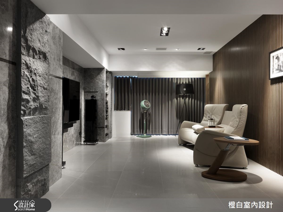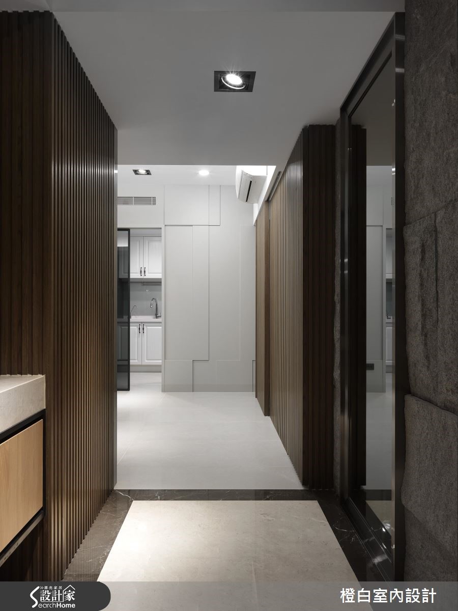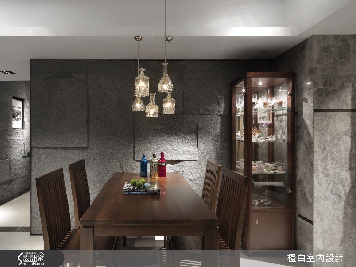 106平方米的老屋翻新后,具有酒店般优雅而精致的质感氛围,墙面上以深邃典雅的木质栅纹,搭配进退起伏的石壁层次,并打上柔和的灯光,更加凸显了材质的特殊肌理,营造出宁静舒适的空间感。 【自然材质造型墙,修饰空间风格】运用大量的木石元素,搭配简洁利落的线条和色调,构筑低调的人文质感,进入玄关即能感受舒适沉静。公领域以梁柱作为客厅与餐厅的分界,玄关与餐厅墙面覆上花岗板岩,堆砌出城堡石壁般的壮阔效果;并呼应厨房造型,透过不同材质的混搭串接,丰富视觉层次。客厅处以一整面大理石电视墙,带来利落大方的时尚现代感,并与沙发后方的木质背墙形成冷冽与温润的对比效果。私领域则强调温和舒眠的空间质感,加强木质色调的面积比,并绘上淡雅色彩,让居住者在居室好好放松。