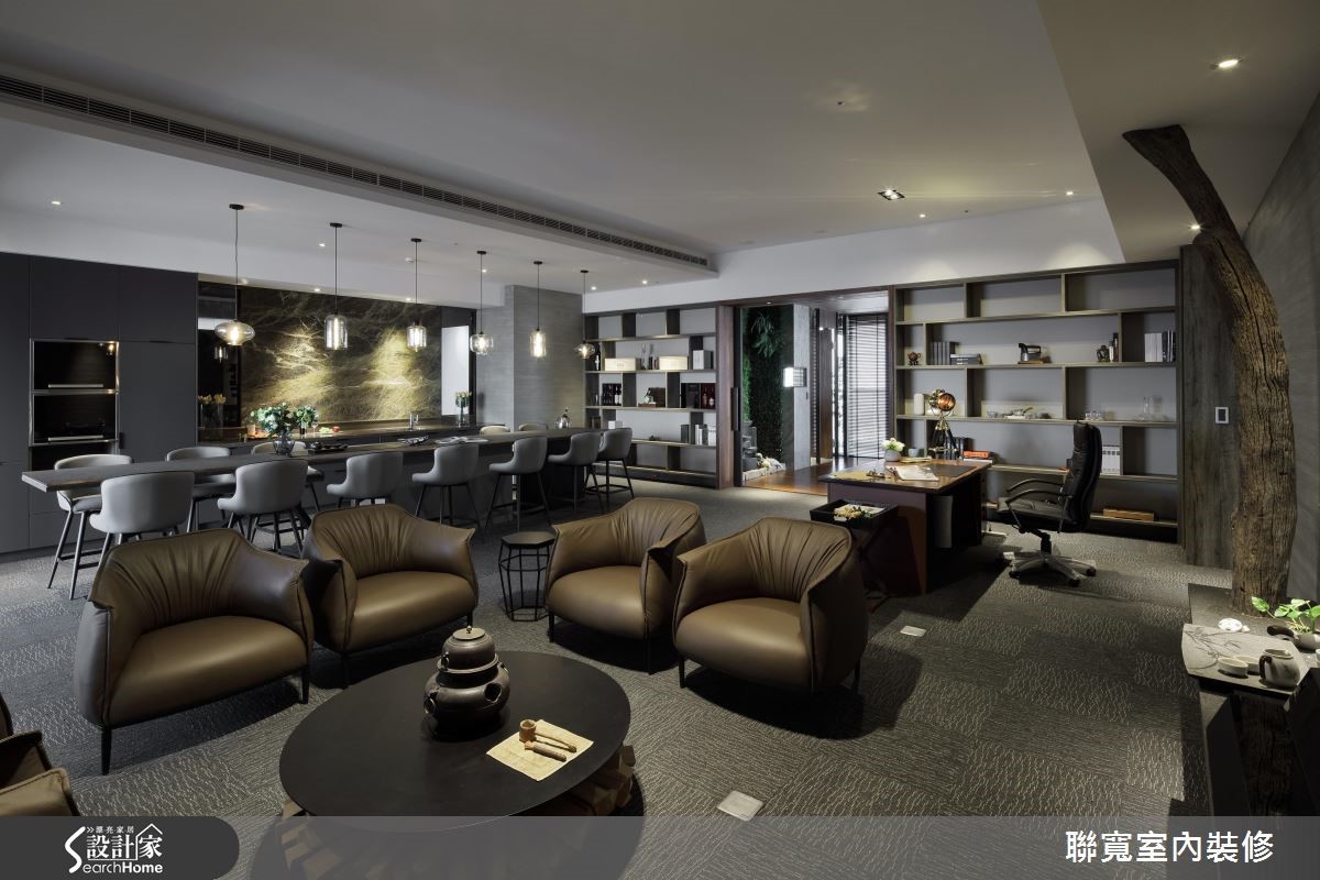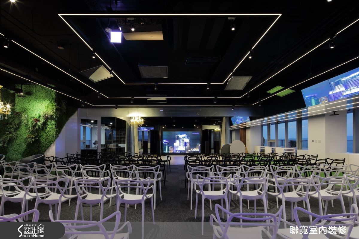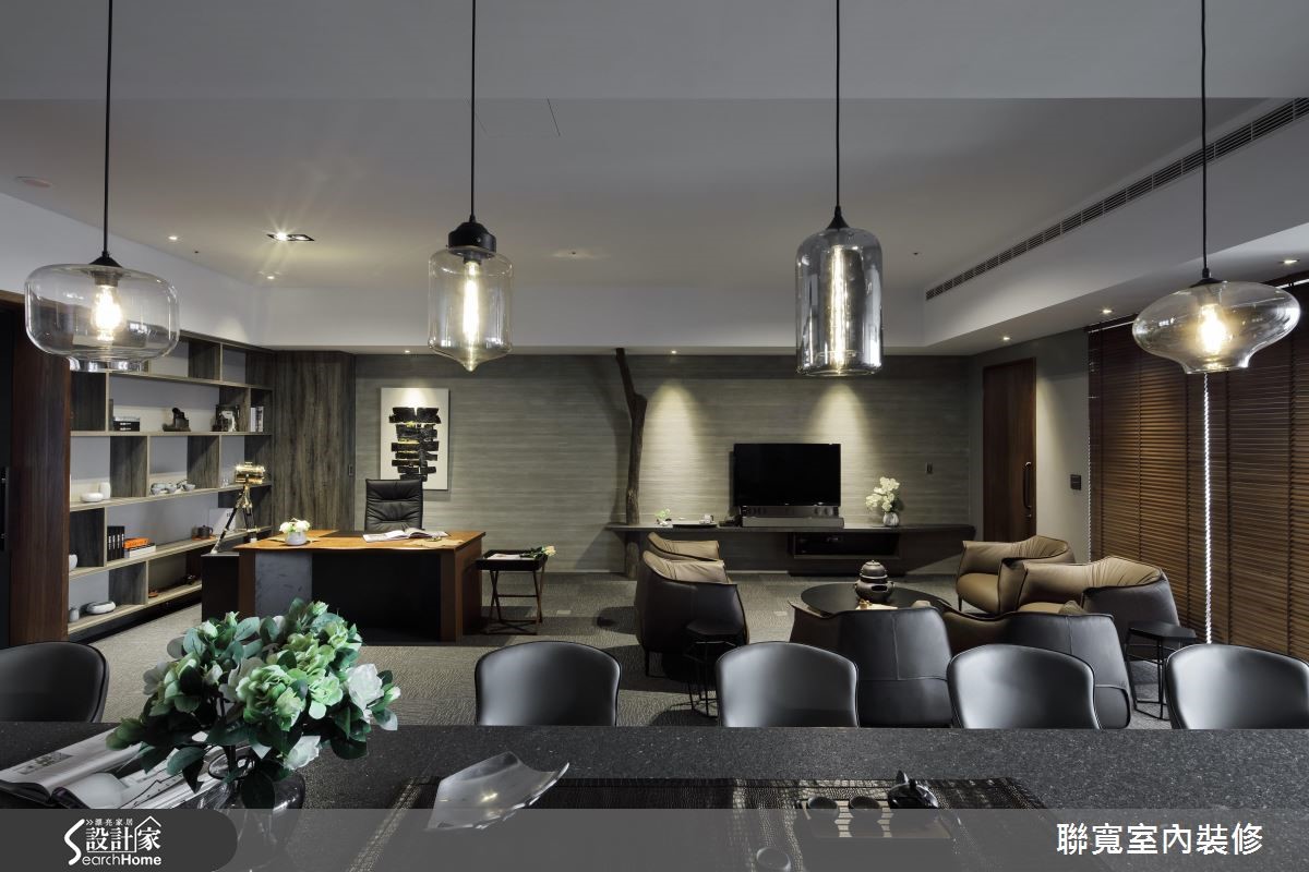 在462平方米的场域中,设计师运用完美的轴线布局,创造开放、延伸且多变的格局型态,使空间兼具工作室、会议室、迎宾等主题,呼应创新不设限的企业精神。 【跳脱工作思维,融入家装氛围】空间中,跳脱了方正的局限,可见大量不规则的线条语汇,不仅创造活泼感,更达到延伸尺度的作用,同时保有清晰的主要轴线,且巧妙采用黑白两种色调的座椅、轻松掌握现场人数,而块体、面体的几何切割,以及灯光的发散点缀,更制造了整体的动态活力。而通往接待办公场域,则采用大地色作为主调,藉由充满现代氛围的整体设计,烘托沉稳感受,再饰以点状灯光展现柔和气氛,让空间脱去商业空间的气息,充满着居家的舒适温暖!