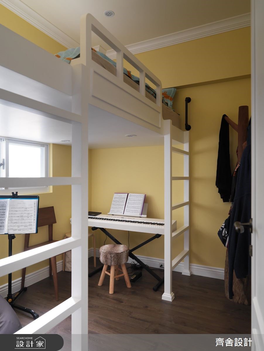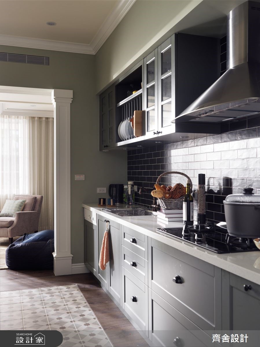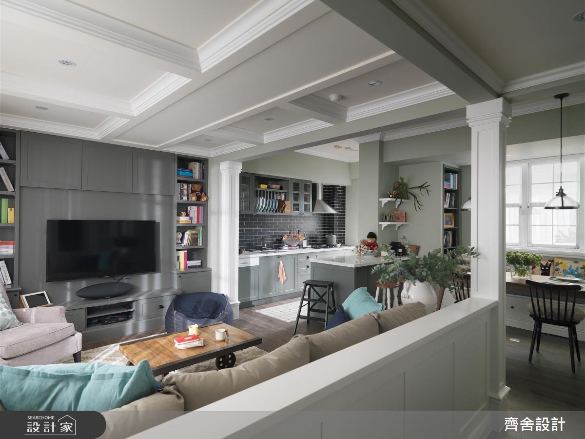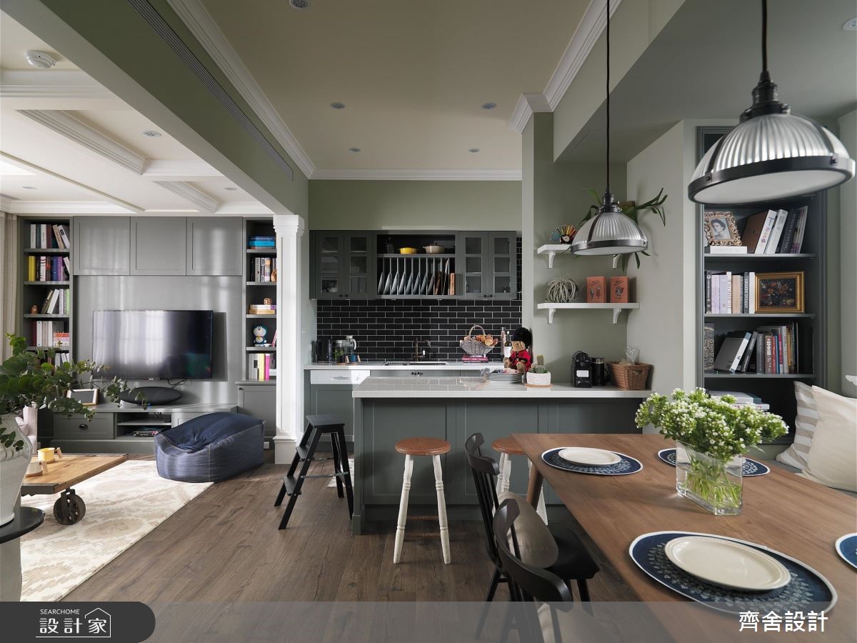 想串起与家人完整的连结,就用地道的美式设计。原先陈旧的二手房有着格局不良、老旧阴暗问题,重新佐温柔色调与日光,让空间氛围更为柔和,披上宛如童话般的梦幻新装。【开放设计,打造地道美式风情】为了植入地道美式风情,设计师以开放设计串连客厅与餐厨空间,维持家人间的高度互动性。入门巧妙以矮墙划分玄关位置,为百叶收纳柜提供充裕的应用空间。客厅天花以格状造型线板营造视觉层次、化解大梁问题,结合收纳柜机能的铁灰色电视墙搭配布织沙发、单椅与工业风桌几,呈现美式风格的经典休闲风情。餐厨空间的天花与壁面皆刷上绿阶色调,巧妙与客厅产生区隔,临窗而设的4人餐桌搭配飘窗,让用餐也能做场日光浴,双面电器柜与吧台结合,成为厨房与餐桌的连结,更能兼具备餐、休憩的机能。特意在厨房地坪加装进口砖,与木地板产生区隔,并维持料理区的整洁。