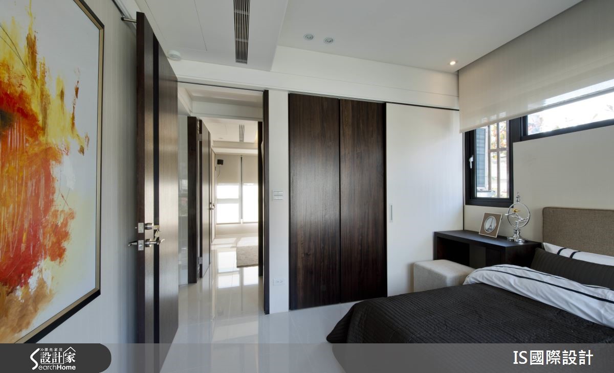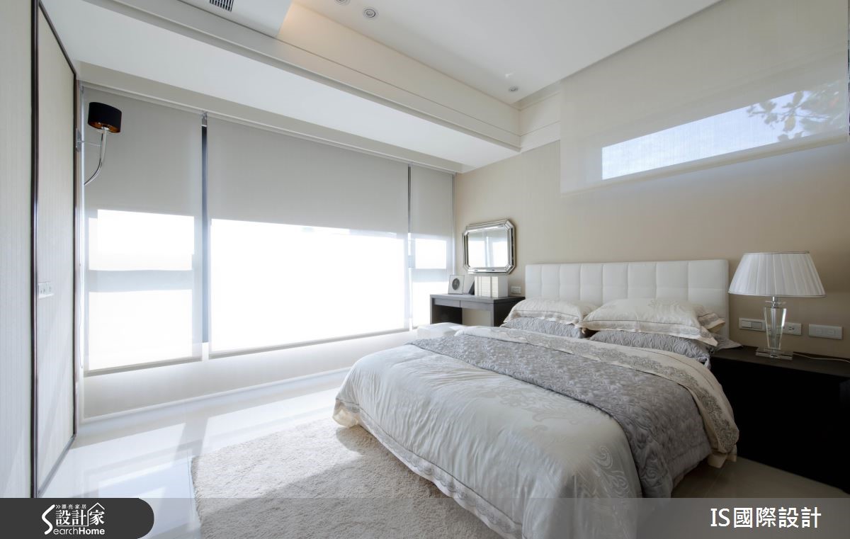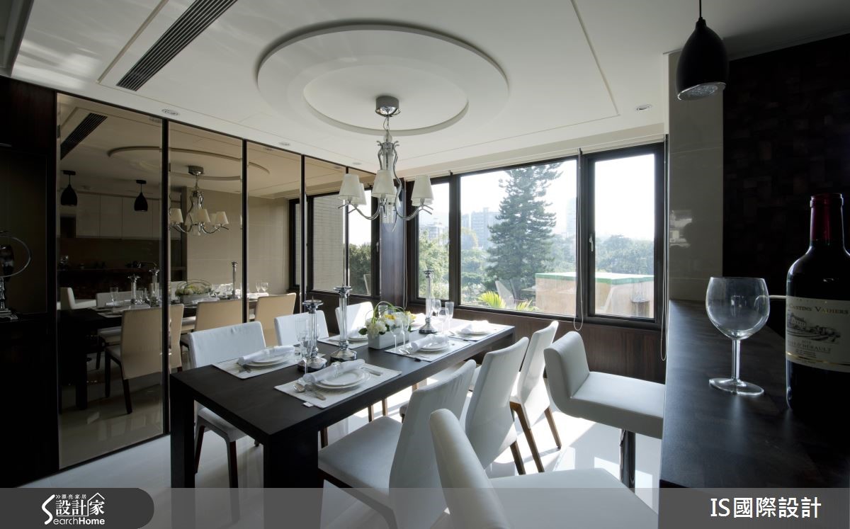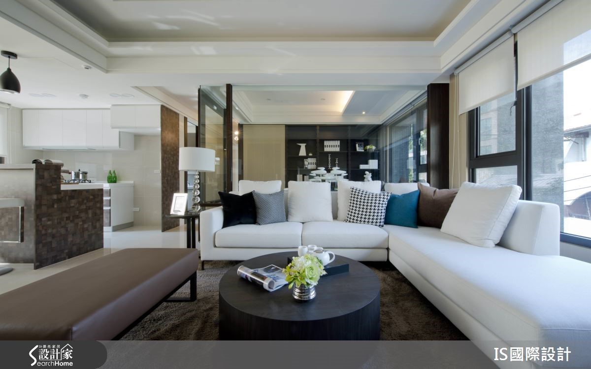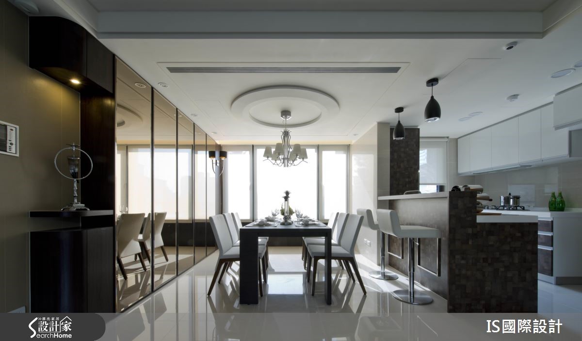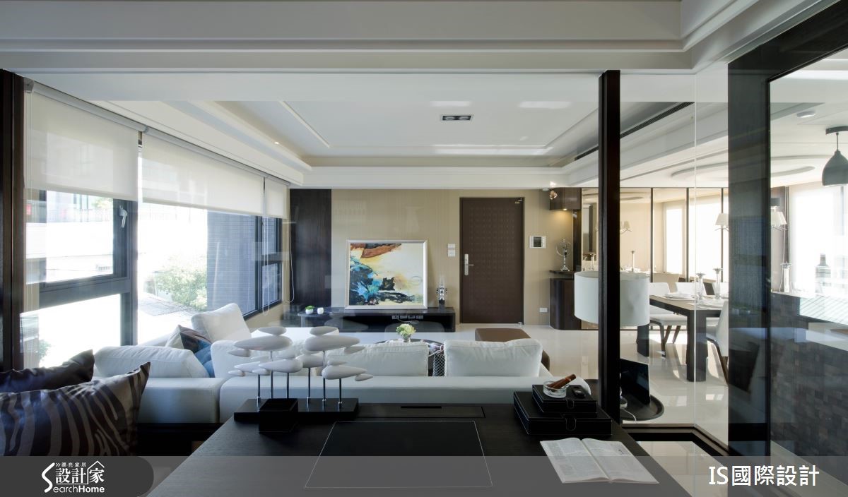 此案以清爽的白色作为主色调,公领域的两侧拥有得天独厚大面采光,日光游走在无隔断的开放环境里,加上镜面与玻璃材质的妆点,形塑明亮穿透的自由气息。【玻璃隔断,扩充空间通透感】室内采开放式设计,客、餐厅相融一室,中央以一条廊道自然划分,天花板以高低视觉勾勒出主从领域之分。黑白色调成为客厅的视觉用色,窗台将户外的自然绿意纳入视线,转化为室内空间的一面风景,并与茶几上的小盆植栽相互呼应,调和清新的自然气息。沙发后方以玻璃为隔断,区隔出书房领域,透视效果让视线直抵书柜,随著书本与展示品的陈列,流露人文之美。刻意营造低矮的弧形天花板,搭配华丽感的吊灯,凸显餐厅的视觉美感。生活需要的大量收纳归入整排茶镜立面里,而镜面的反射效果让视觉更为延伸。