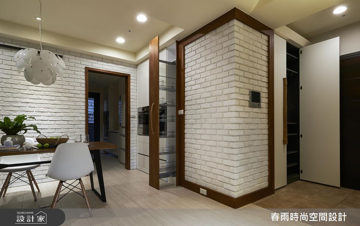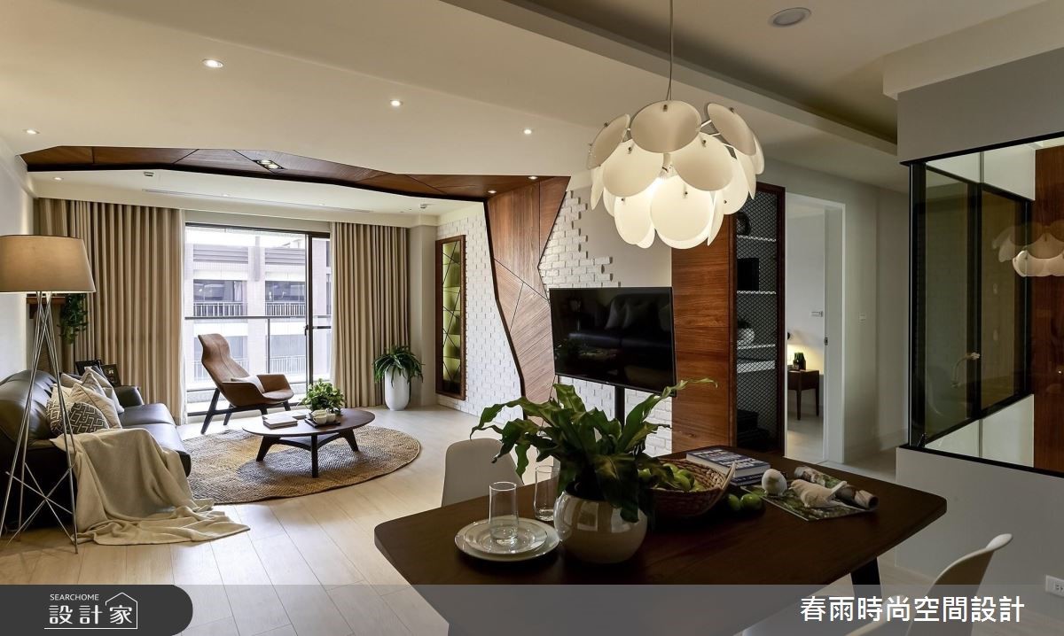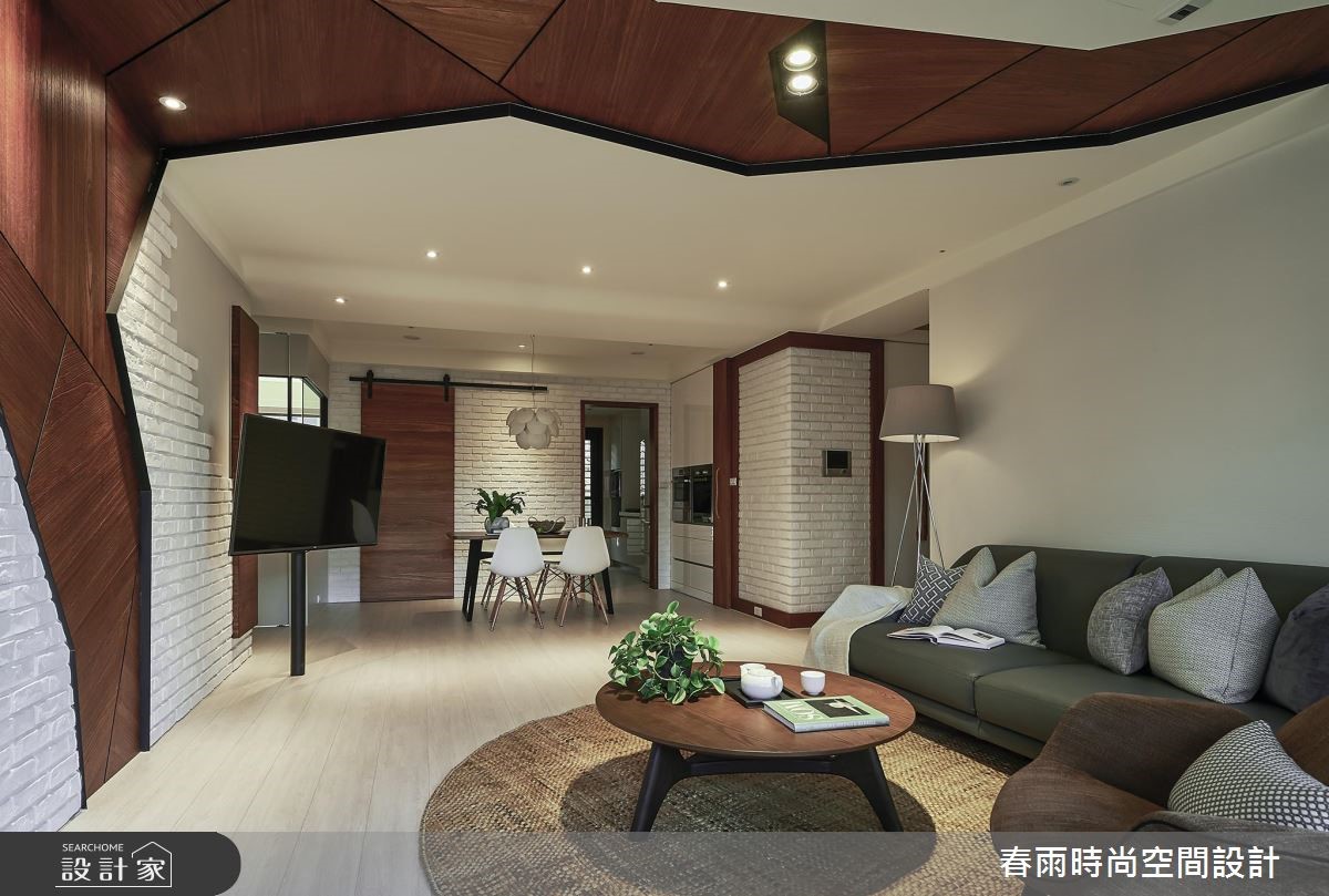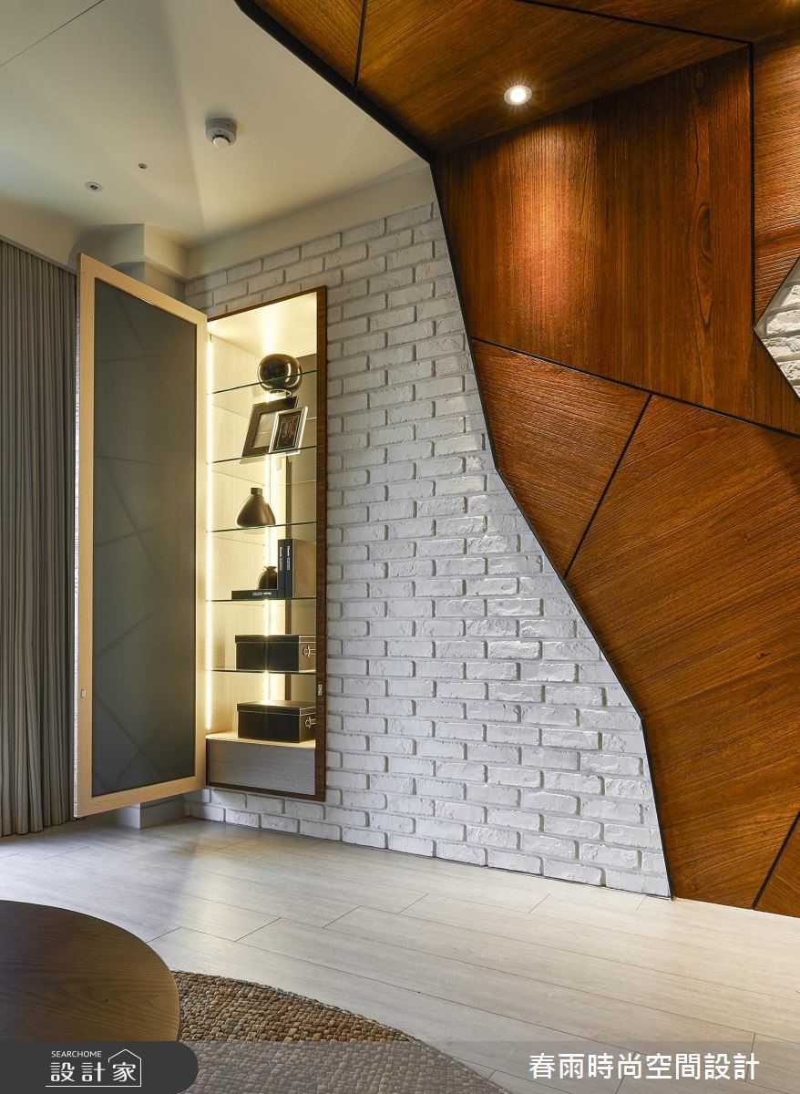 119平方米休闲风居宅,设计师采以树干做为象征,沿用木皮、文化石等天然感建材,透过独树一帜的几何线条擘划空间,展现出新颖兼具温度的住宅视野。其刻意突破制式化的居家样本,采用麻绳取代一般把手款式,从设计细节就得见创意心思。【木皮造型墙面型塑空间个性】公领域以白色、木色作为基底,采用木地坪铺陈全室,搭配落地窗的采光映照,烘托厅区的写意氛围,主墙则赋予独特表情,融入文化石为背景,巧妙给予局部留白,并以一道木皮造型延伸天花,透过延伸脉络及温暖木皮象征大树,赋予守护与庇荫的喻意。同时,将文化石延伸至餐厅领域,借由文化石的包覆修饰结构柱体,再借着墙面深度与木作掩饰,加入可抽拉式的收纳柜体,充分运用居宅坪效。来到寝卧则可见大容量的木质衣柜,两侧加入工业风铁网元素,在粗犷与温润之中,带入居住者的个性魅力。