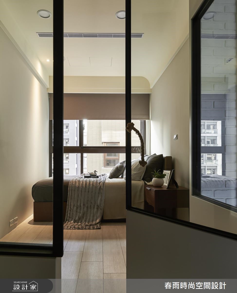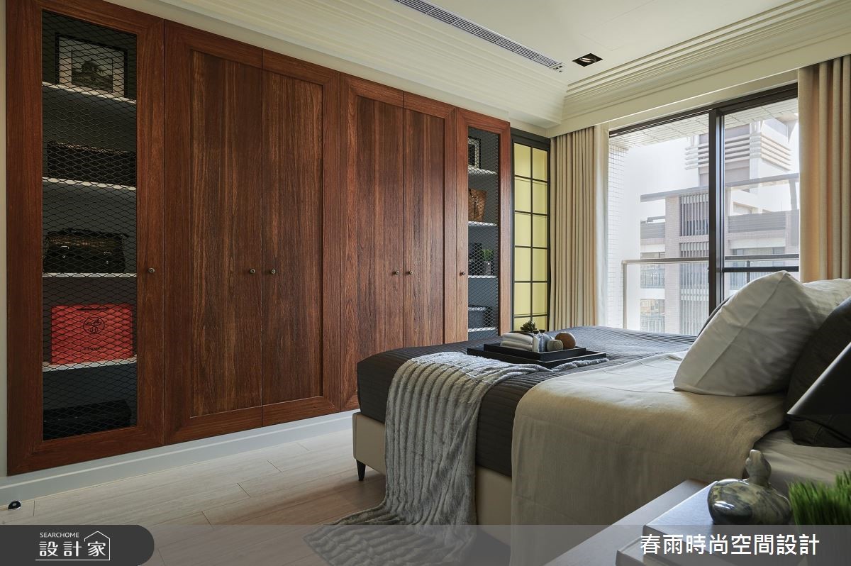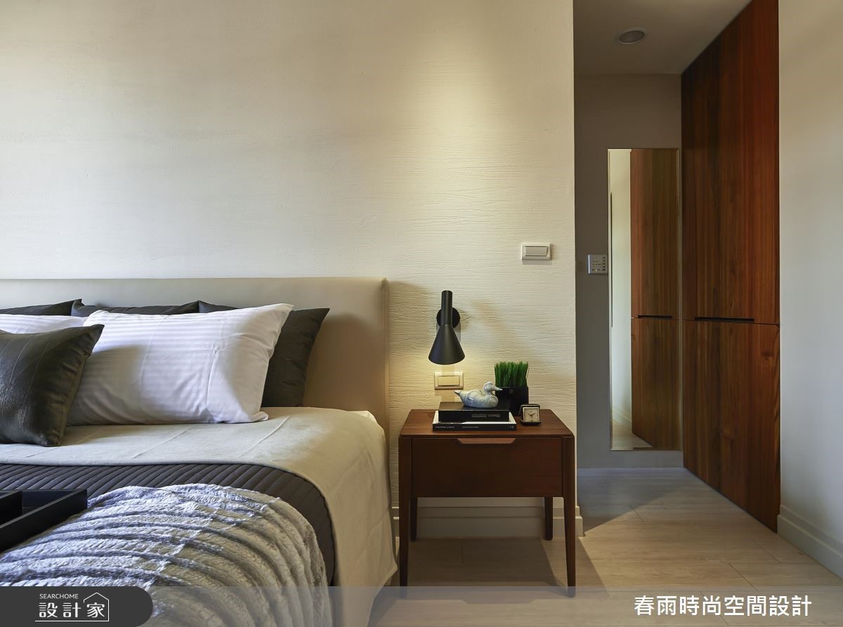 119平方米休闲风居宅,设计师采以树干做为象征,沿用木皮、文化石等天然感建材,透过独树一帜的几何线条擘划空间,展现出新颖兼具温度的住宅视野。其刻意突破制式化的居家样本,采用麻绳取代一般把手款式,从设计细节就得见创意心思。【木皮造型墙面型塑空间个性】公领域以白色、木色作为基底,采用木地坪铺陈全室,搭配落地窗的采光映照,烘托厅区的写意氛围,主墙则赋予独特表情,融入文化石为背景,巧妙给予局部留白,并以一道木皮造型延伸天花,透过延伸脉络及温暖木皮象征大树,赋予守护与庇荫的喻意。同时,将文化石延伸至餐厅领域,借由文化石的包覆修饰结构柱体,再借着墙面深度与木作掩饰,加入可抽拉式的收纳柜体,充分运用居宅坪效。来到寝卧则可见大容量的木质衣柜,两侧加入工业风铁网元素,在粗犷与温润之中,带入居住者的个性魅力。