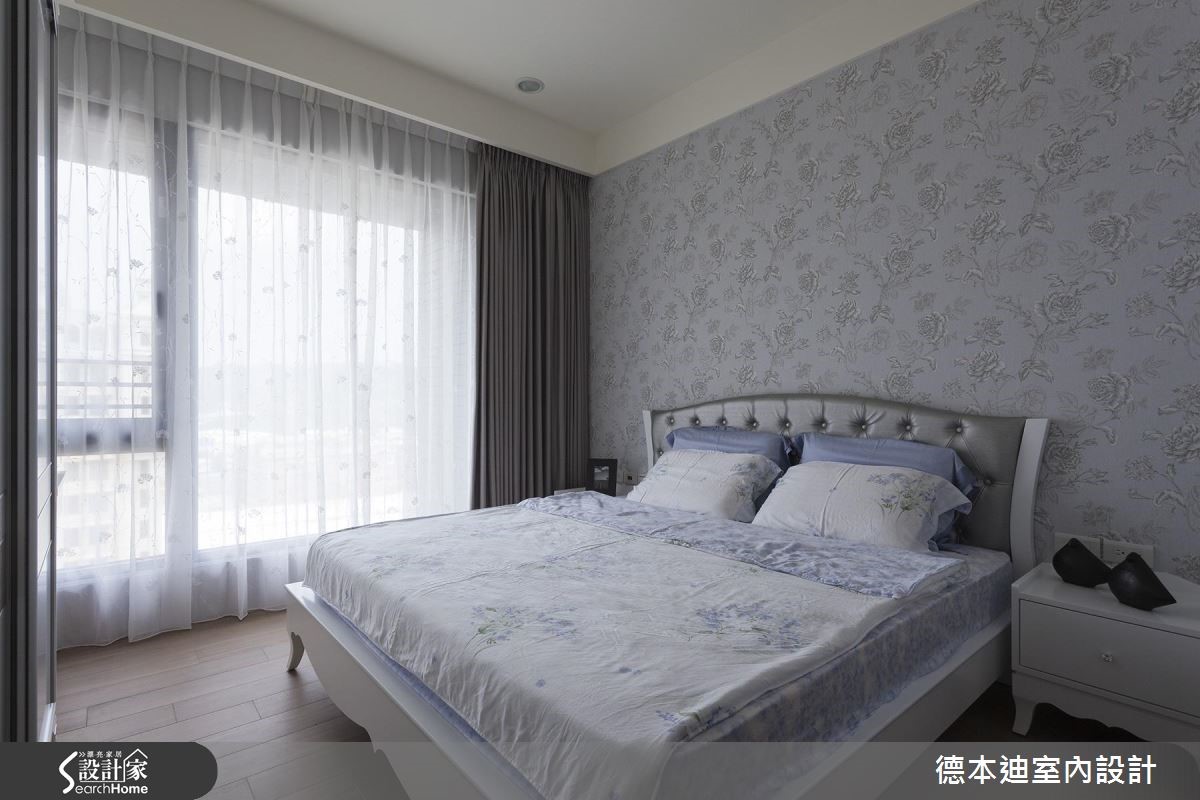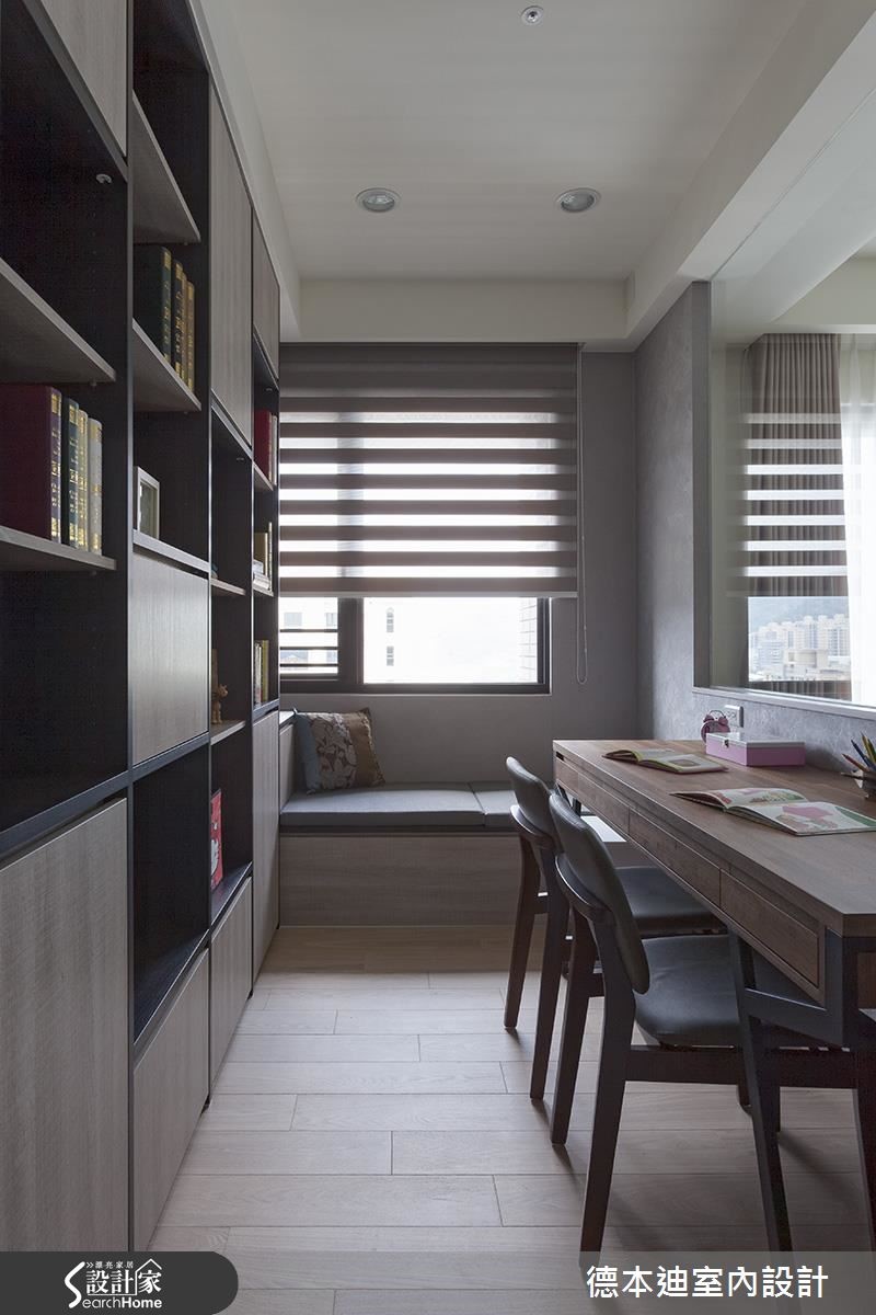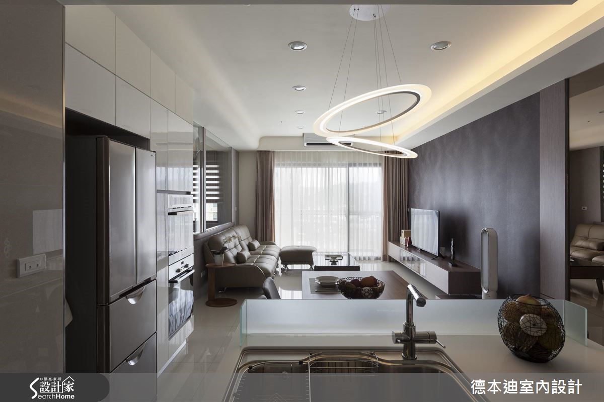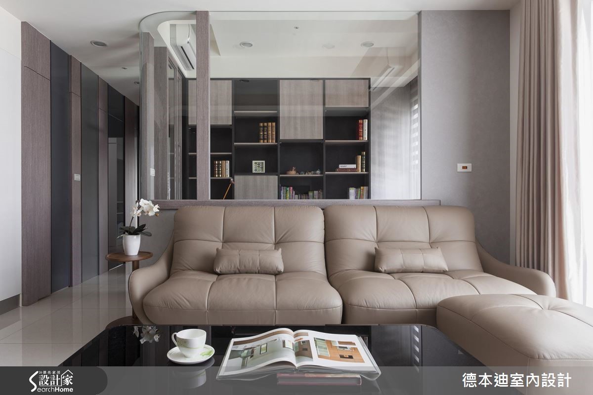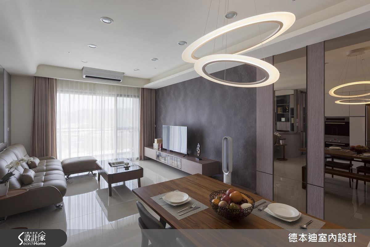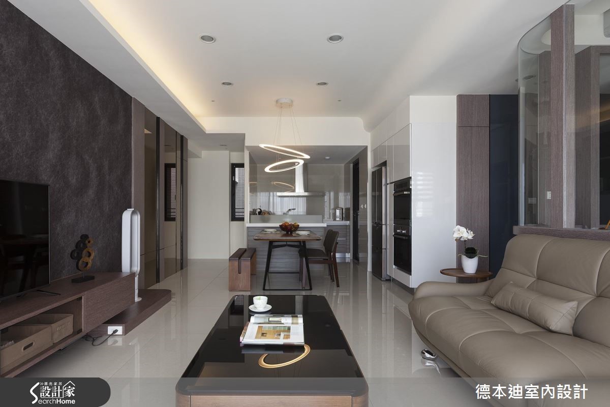 透亮自然光轻洒在深色调空间,一扫压迫的室内感受,加上镜面、玻璃与烤漆玻璃等材质的搭配,藉由穿透、折射光感的特性,全面提升视觉亮度,营造出气韵非凡的现代风尚宅。【格局微调,彰显空间舒适度】公共领域以开放式规划,客、餐厅相融一室,利用大面采光的优势,创造舒心、明亮的空间氛围。电视墙以内敛低调的壁纸为底,酝酿优雅的人文气息,一旁则以茶镜、木纹交织壁面,并延伸至廊道上的隐藏门设计,替简约的居家生活植入温润自然元素。设计师将客厅与书房间的隔断拆除,释出更多空间给客厅,让公共区域保有宽敞、开阔,并以玻璃塑造全新书房,透视的隔断手法,将兼具展示与收纳的书柜化作空间里的装饰;餐厨区则以原木餐桌椅搭配弧形设计吊灯,注入现代设计之美。