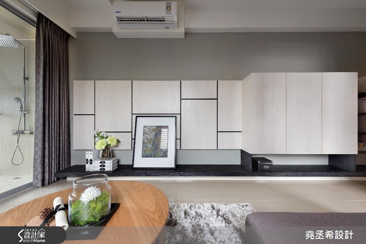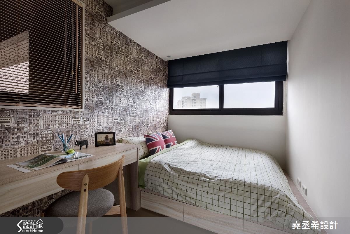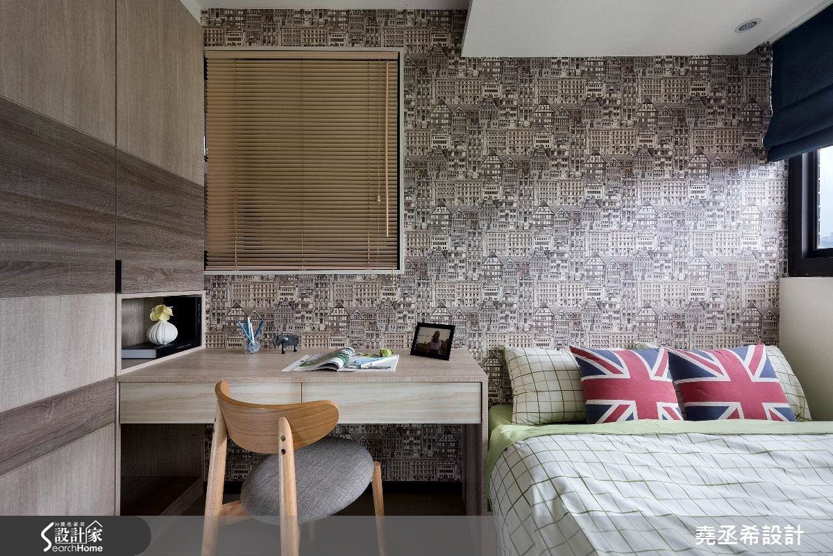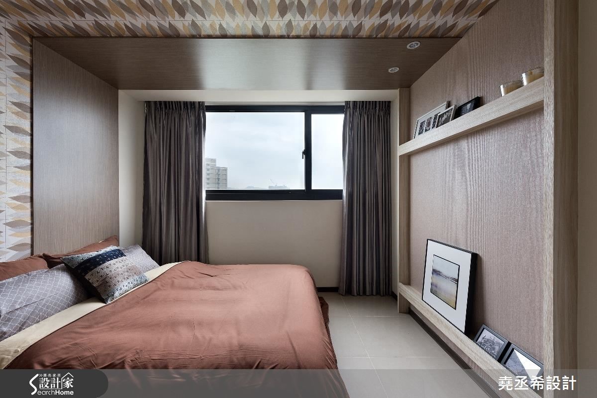 这是56平方米的新屋,虽然家庭人口简单,却有大量的物品需要收纳。因此从廊道延伸一整面的收纳柜,不仅赋予了充足的收纳量,大面积柜体也在视觉上拉阔了空间感受,让偏小的空间看起来更加宽敞舒适。【多层次格局安排,迎来扩容效果】面对狭长型的住宅空间,设计师透过多层次穿透格局安排,将卫浴的自然光源引进室内,获得充裕的采光。并加设双边窗帘,当需要洗浴时也不必担心隐私问题。为了解决一家3口的收纳问题,沿着廊道到客厅规划整面柜体,提供了大量收纳空间。进入私领域,主卧室与小孩房皆有床头压梁的问题,设计师在主卧室利用L型延伸造型板,搭配图腾牆纸分割,十分具有设计感。小孩房则是在天花处加入间接照明光带,有效抒解了沉重感。