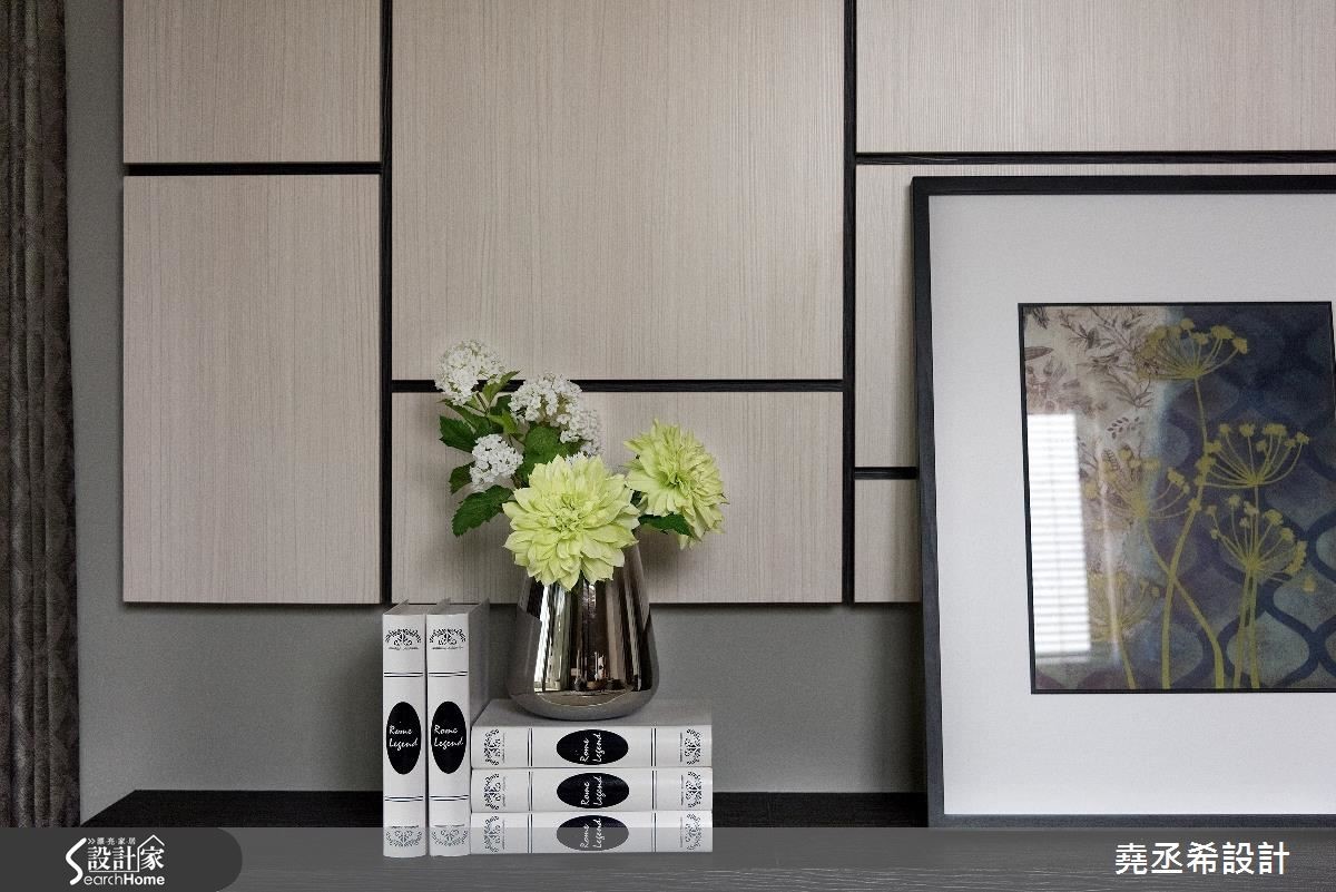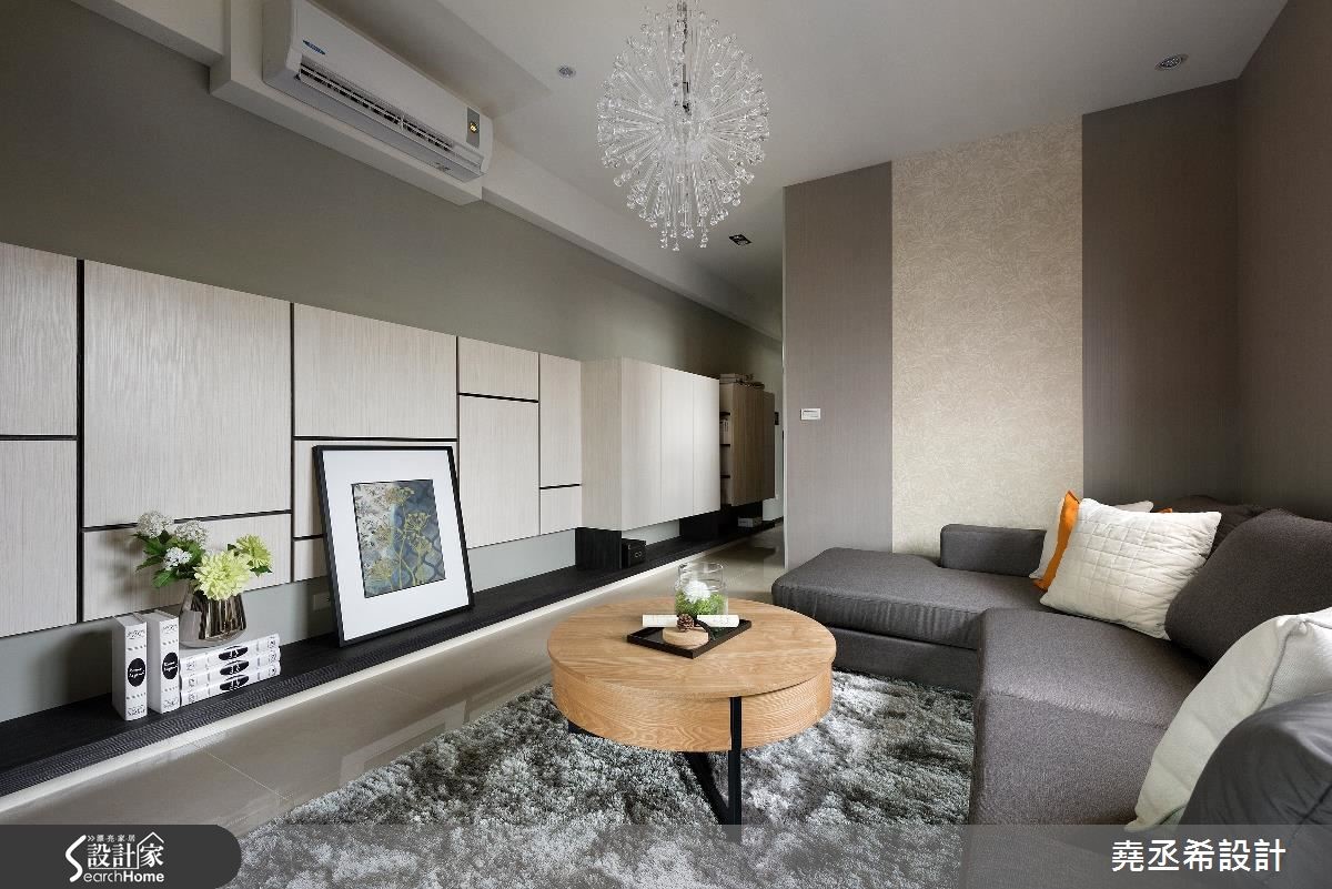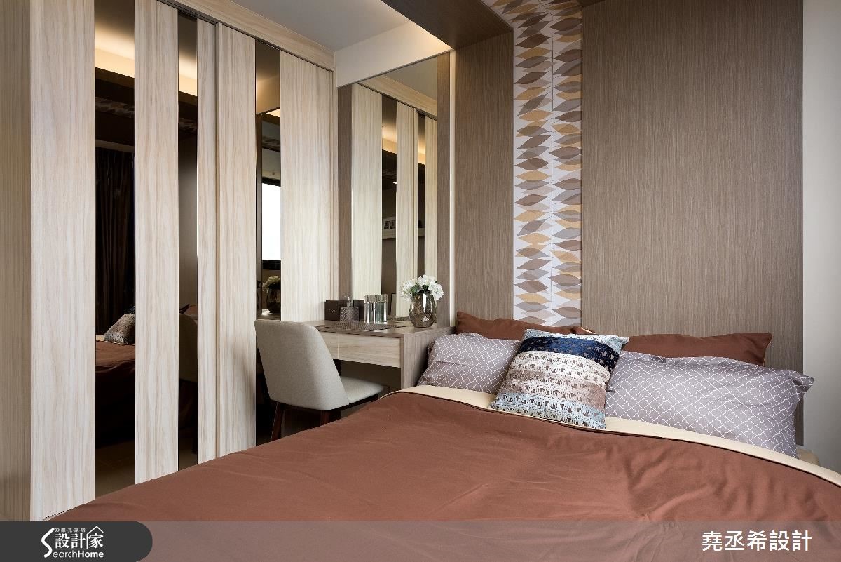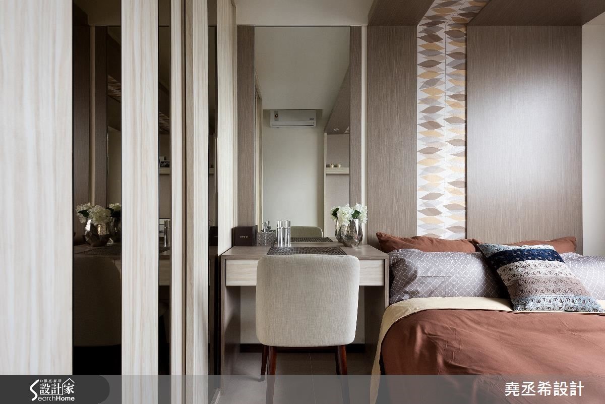 这是56平方米的新屋,虽然家庭人口简单,却有大量的物品需要收纳。因此从廊道延伸一整面的收纳柜,不仅赋予了充足的收纳量,大面积柜体也在视觉上拉阔了空间感受,让偏小的空间看起来更加宽敞舒适。【多层次格局安排,迎来扩容效果】面对狭长型的住宅空间,设计师透过多层次穿透格局安排,将卫浴的自然光源引进室内,获得充裕的采光。并加设双边窗帘,当需要洗浴时也不必担心隐私问题。为了解决一家3口的收纳问题,沿着廊道到客厅规划整面柜体,提供了大量收纳空间。进入私领域,主卧室与小孩房皆有床头压梁的问题,设计师在主卧室利用L型延伸造型板,搭配图腾牆纸分割,十分具有设计感。小孩房则是在天花处加入间接照明光带,有效抒解了沉重感。