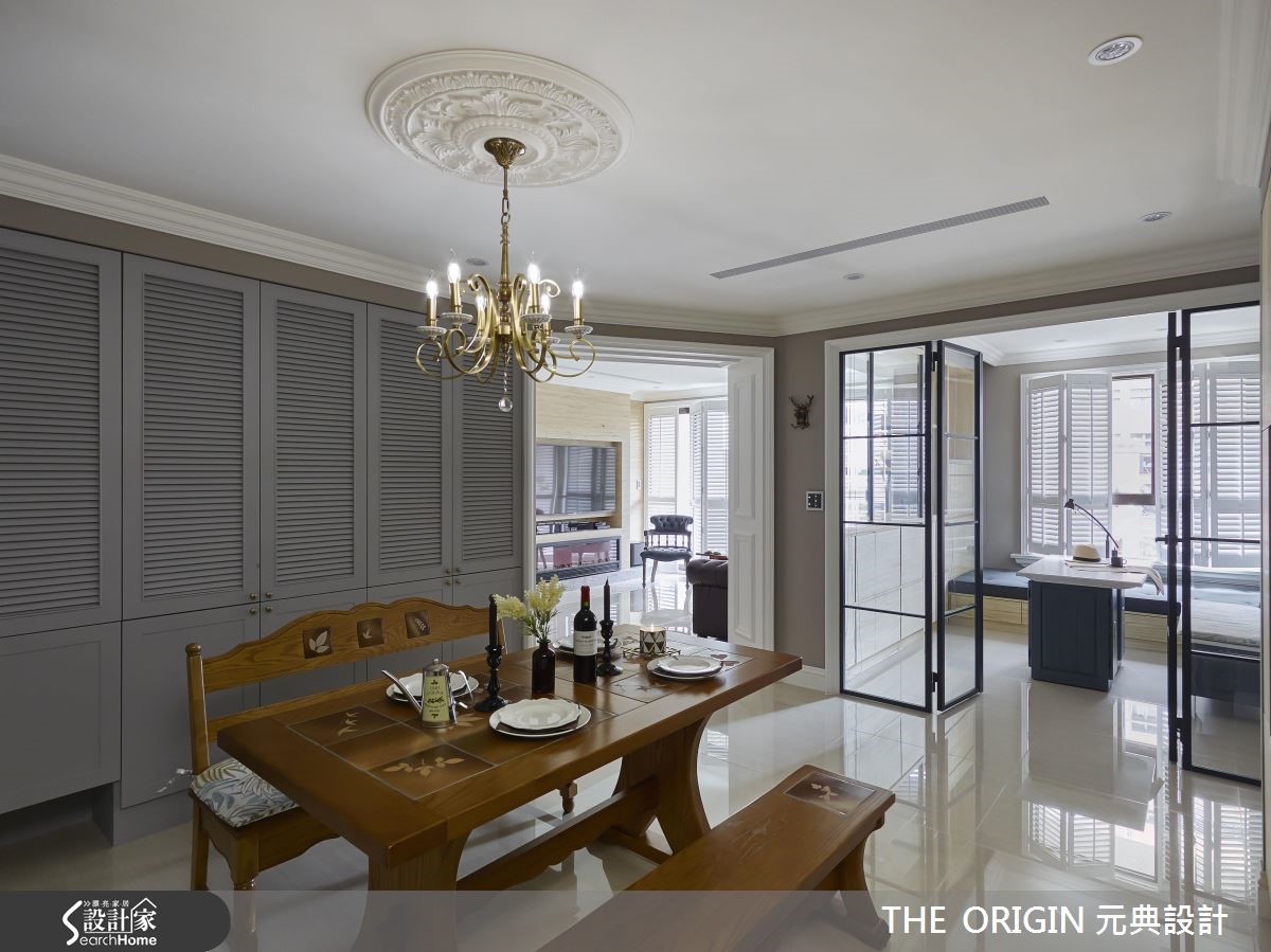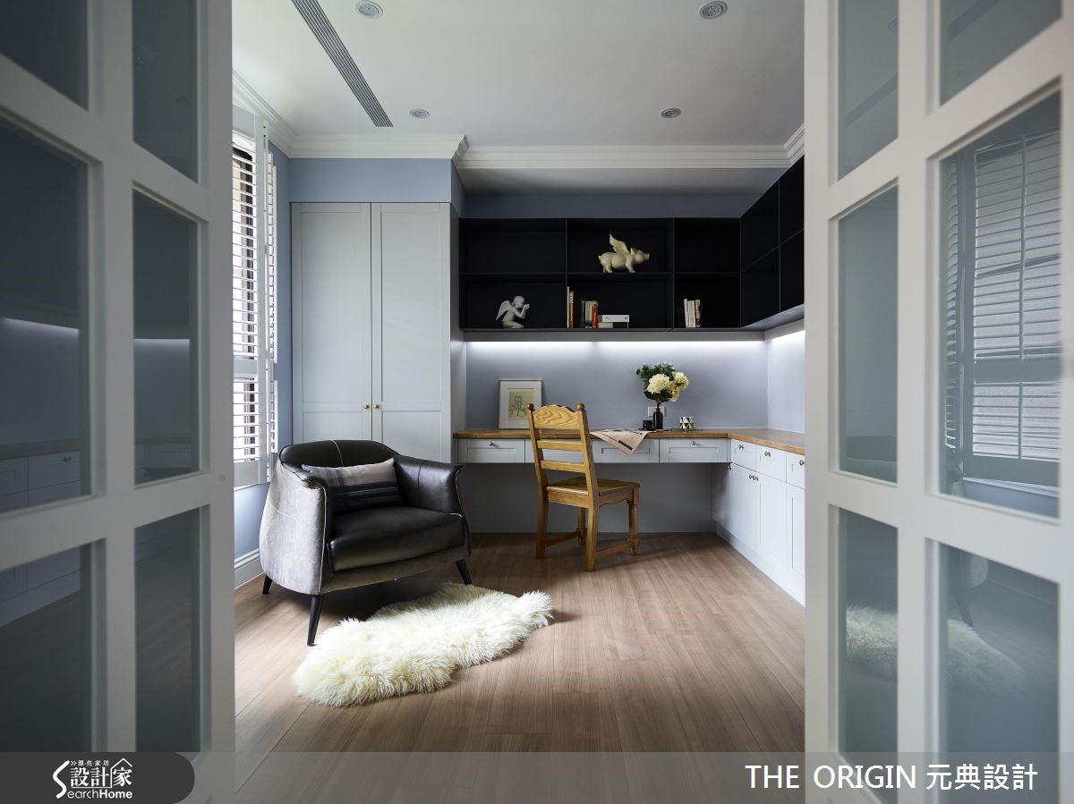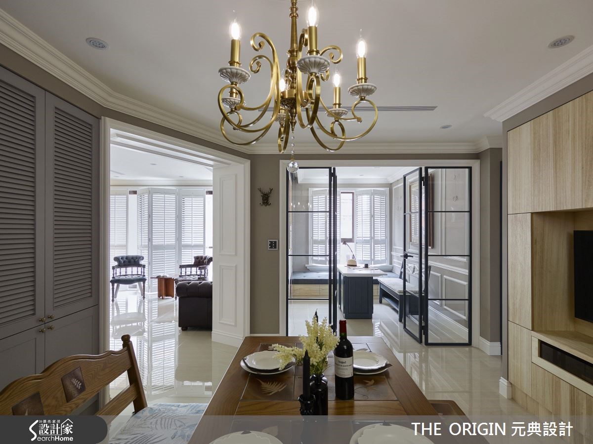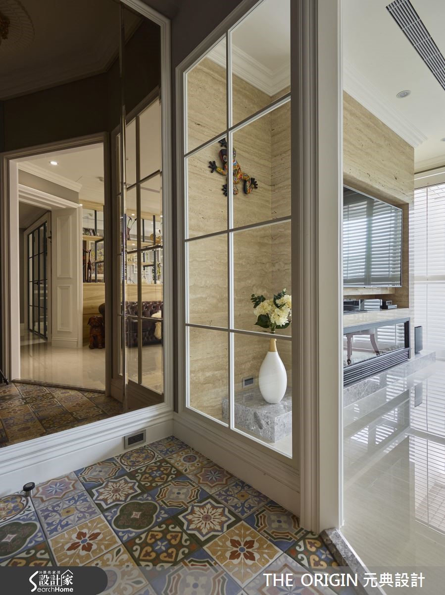 开放透亮的132平方米美式风住宅,为屋主夫妇俩退休后的居所,长期定居国外的他们,一起走遍世界各地,拥有许多具有纪念价值的珍藏品,因此设计师规划大量的展示空间,收藏来自各地的纪念品,更赋予优雅大器的美式风格,打造夫妻俩熟悉的生活风景。【掌握采光方向,让日光恣意涌入】玄关处绚丽多彩的花砖地坪,在进门时便带来惊艳焦点,搭配玻璃、镜面等材质,更放大了整体空间感。客厅则以简约的石材地坪,衬托拥有丰富视觉效果的展示墙,并与后方书房保留穿透度,营造宽敞大方的空间视野。设计师透过斜向通道和书房的玻璃拉门,让采光不足的餐厨区,可接收来自客厅和书房的光源,变得更加通透明亮,同时也提升了空间的互动感。而卧室部分,夫妻俩各自保有独立的空间,女主卧更具有阅读以及视听娱乐的多功能起居间,满足退休后的生活机能。