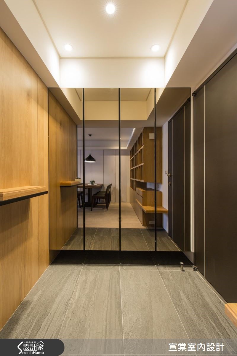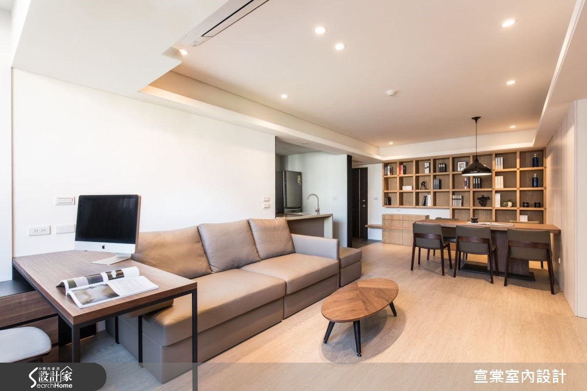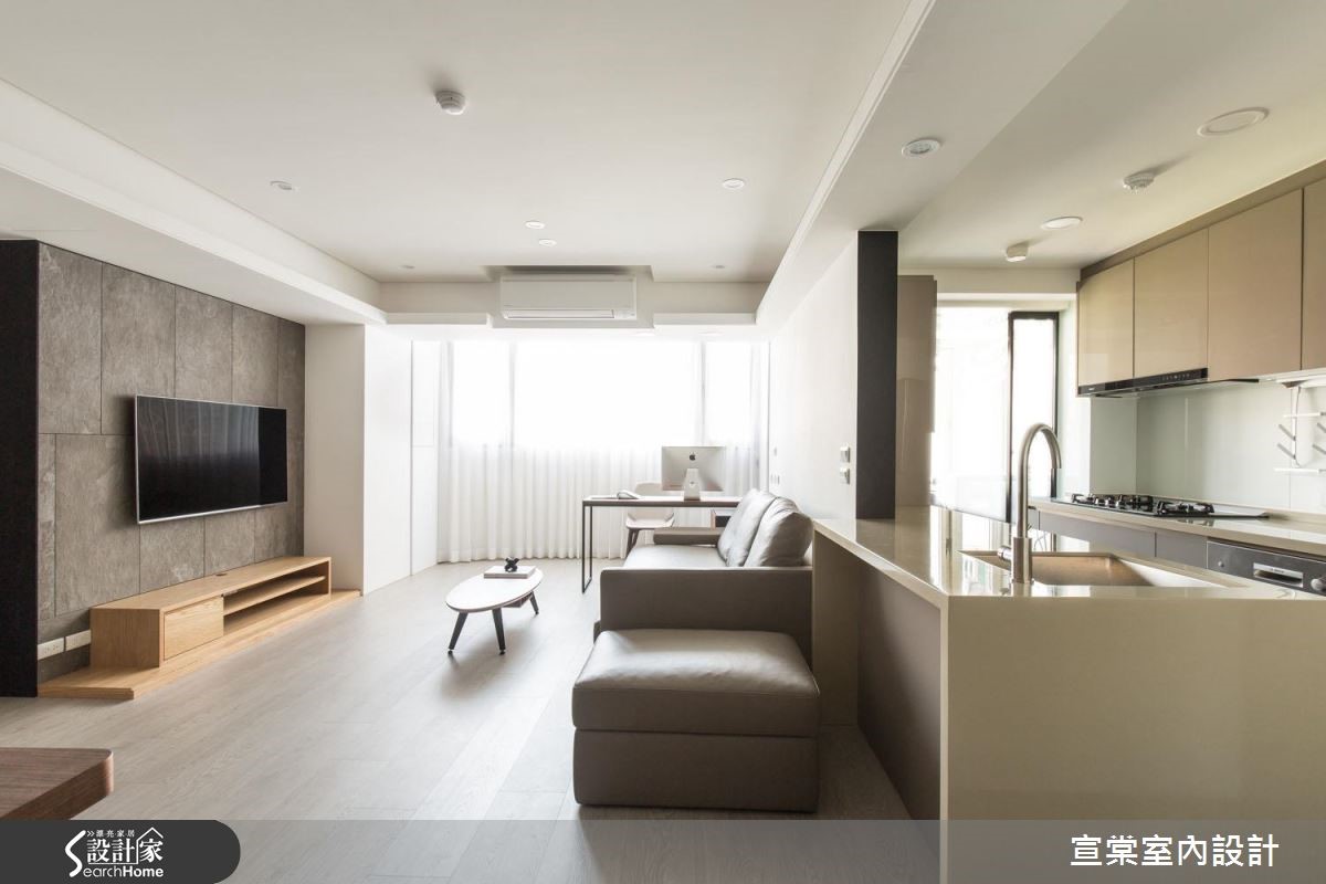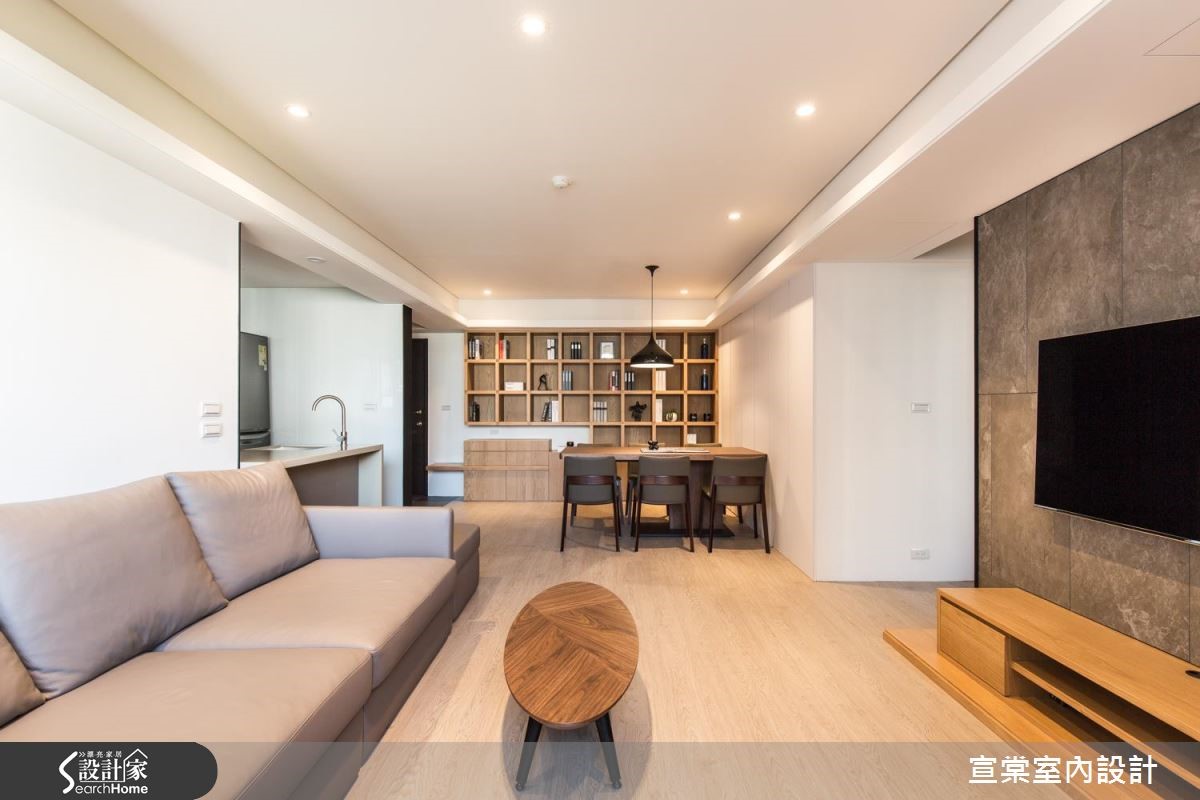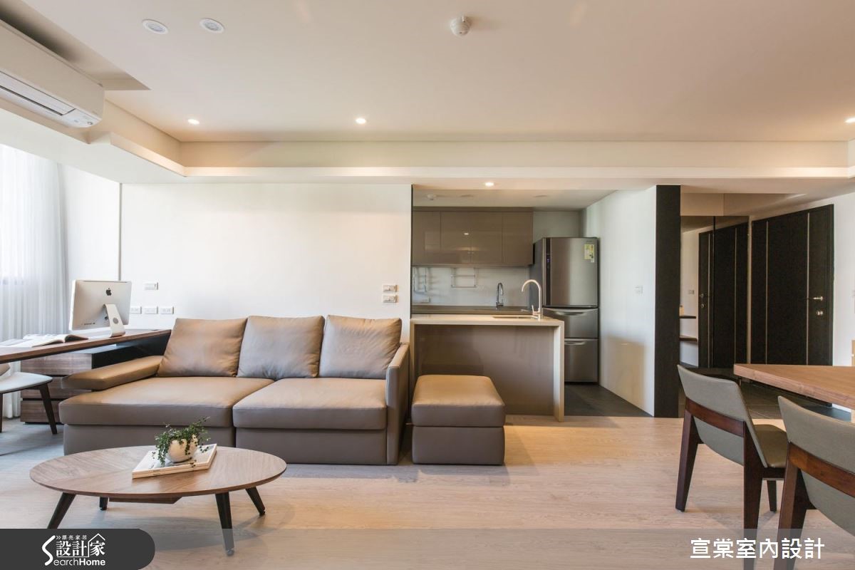 在89平的老屋中,由于空间本身采光不佳、设备老旧,因此设计师将原始一字型厨房改为双排厨具、增加中岛吧台,拓增收纳机能。客厅保留窗边一小处空间,揽进舒适采光,并搭配简约的书桌椅,打造阅读办公场景,透过清爽的设计,落实屋主心目中的理想生活!【半穿透隔断,有效扩容空间】玄关规划不落地柜体,采用镜面打造柜门,营造通透视感,瞬间提亮开门地带的层次感。公领域内则让各空间形成开放互动关系,运用石材妆点电视主墙,并摆设灰色沙发与之形成灰阶呼应,提升稳重的格调。餐厅沿着墙构筑整排书柜,营造机能及美感兼具的墙面表情;开放的餐厨规划是公领域的一大重点,在沙发后融入半穿透式隔断设定,让吧台成为客厅一部分,串联出流畅的使用动线,同时亦能明确划分使用范围。