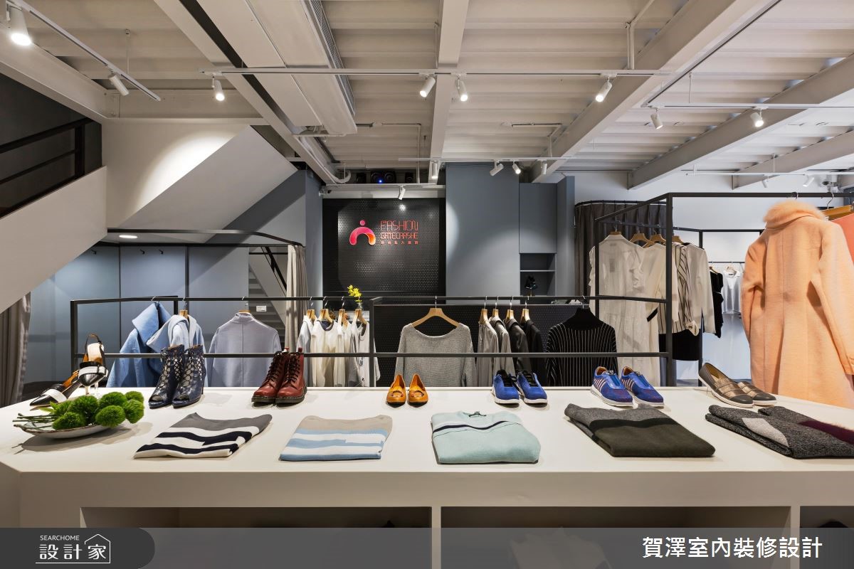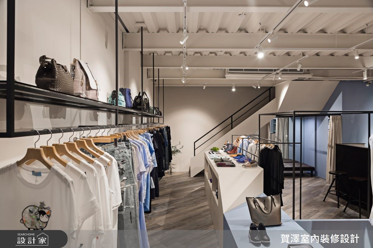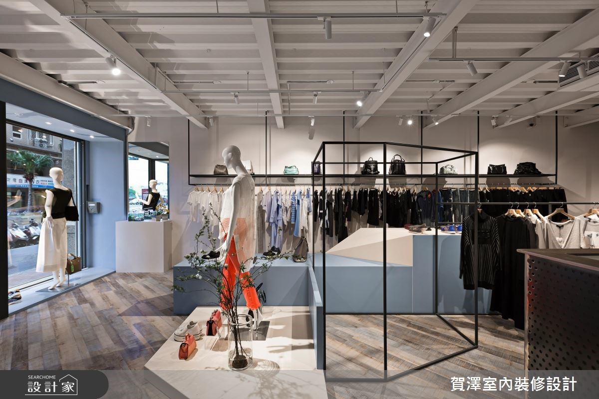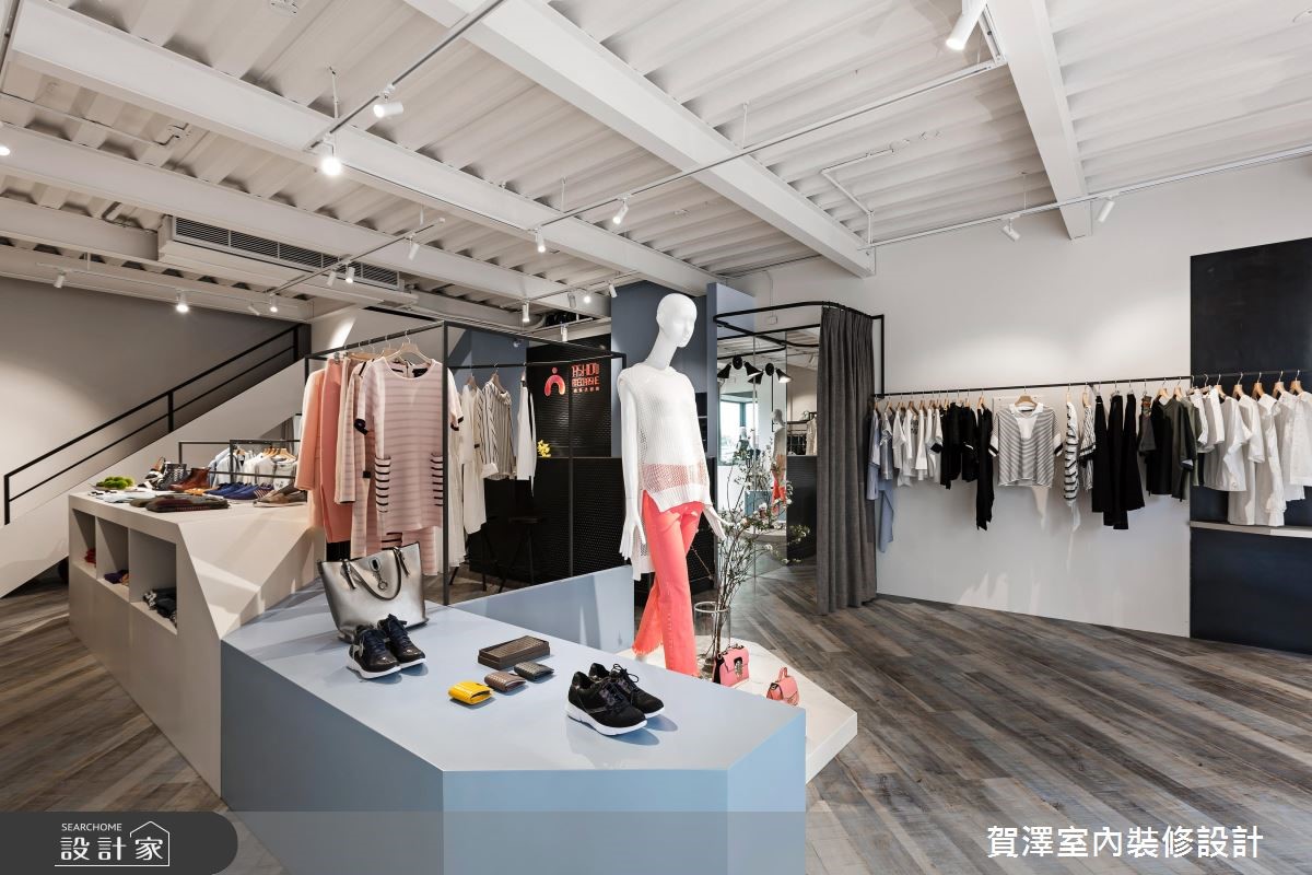 年轻的男业主厌倦工程师生活,决心追求美的生活事物,经历10年的蜕变,终于成为3间服饰店的老闆。为了让女性离美丽更加接近,更援请有着多年默契的专业设计师打造店容。【清爽明亮的空间感受】由于高楼风切效应,于是设计师将大门略为退缩,店内更依照区域进行颜色分配,区分出各机能性。為了赋予优雅、俐落的空间感受,在建材选择上,採富有刚硬线条的铁件框设独立区域并身兼衣架展示。清新淡雅的色调佐简约俐落的展示区域,无论是哪一个季节的服饰配件,皆能被完美衬托,提供宛如置身自家衣柜中般舒适的感受。利用高低错落创造立体度,仿旧木地板则以温润质地平衡金属的冷调感受。针对色彩搭配,设计师以天蓝与纯白的不规则几何量体做为独立展示柜,并以同色系的油漆框设橱窗并塗刷柜台壁面,营造优雅的视觉层次,阳光透进落地窗,更为整体空间增添温柔雅緻的氛围。