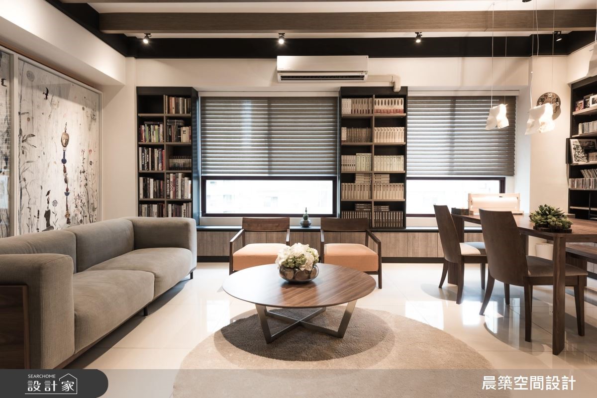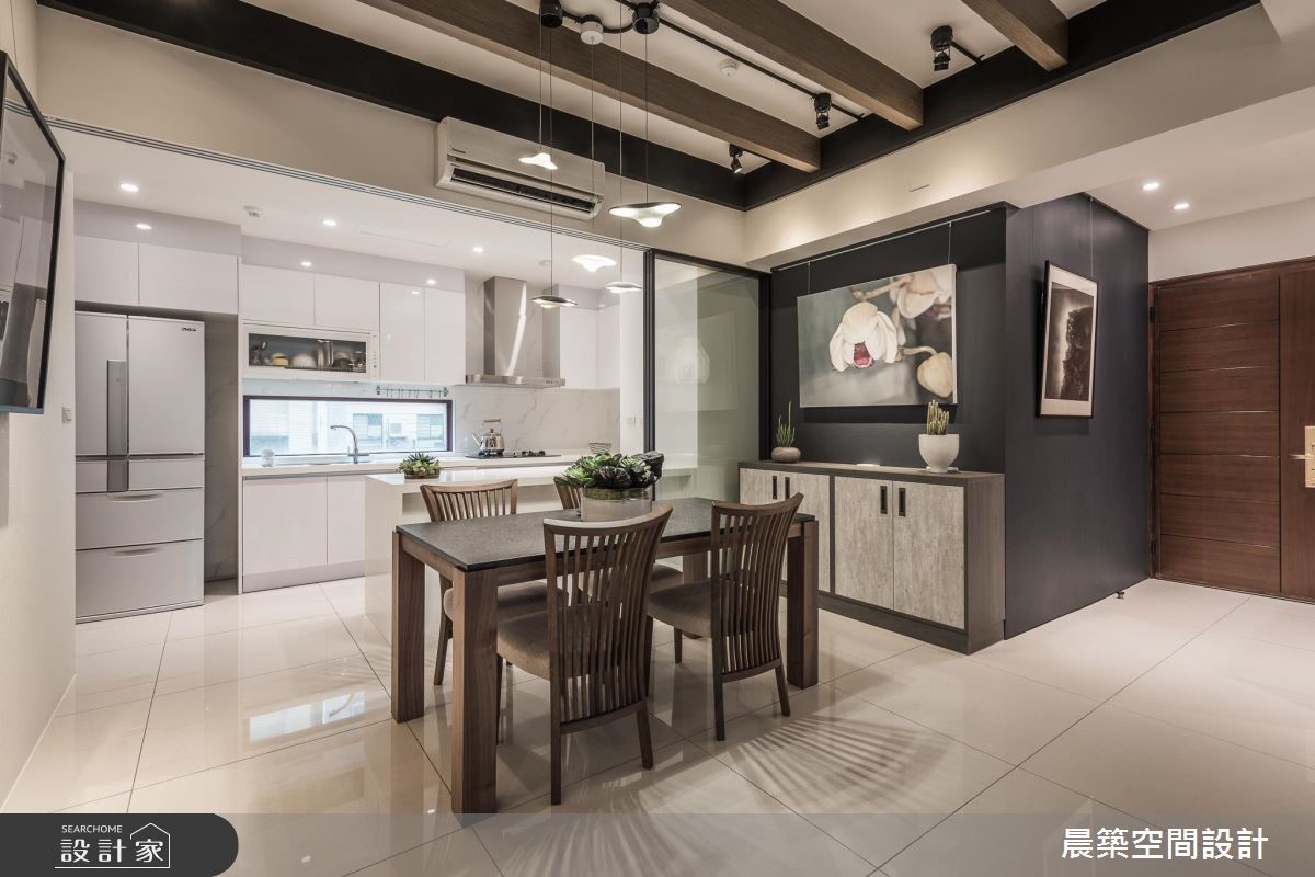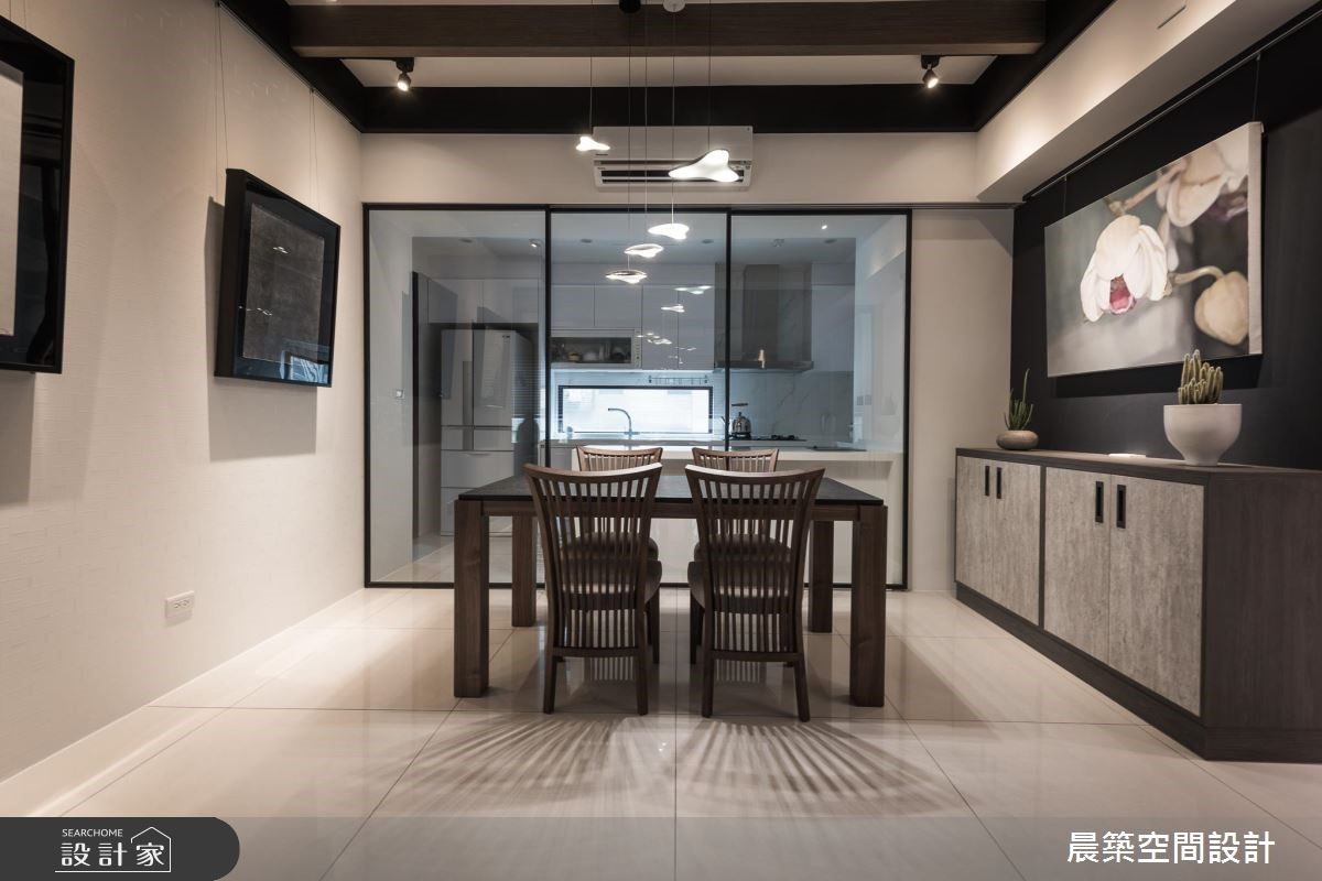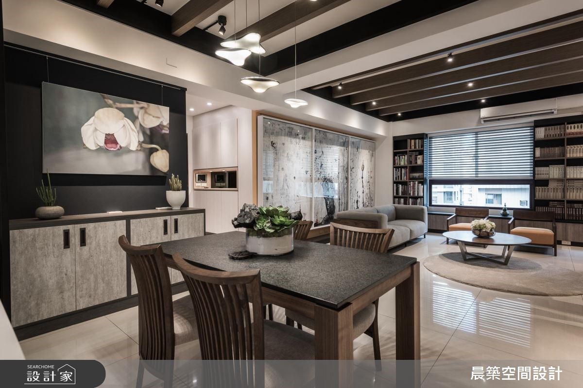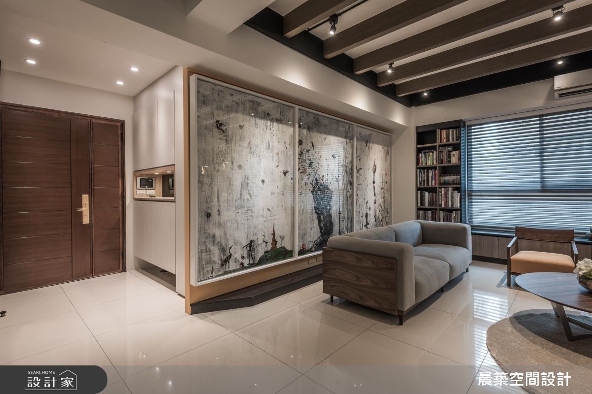 屋主有收藏画作的喜好,加上夫妻俩浓厚的阅读兴趣藏书颇多,需要足够的展示与收藏空间。因此设计师将艺术特性融入装修,创造宛如艺廊的居家空间,【巧用推拉门,隔绝厨房油烟】针对格局变更,虽是采光优良的新成屋,屋主却担心开放厨房容易产生油烟问题。因此设计师改以灰玻推拉门阻隔,且不影响采光。将客用淋浴房改为带有隐藏门的储藏室,拓增收纳机能,同时将储藏室与次浴之间增加一道门保留淋浴机能。打破客厅与开放书房的隔阂并置于同一动线,利用窗墙面镶嵌书柜,并在公领域壁面放上屋主收藏的大幅画作,提升居家质感。风格规划以简约易整理为原则,以格栅保留原始高度、增添利落造型,并利用天花黑色边框降低大梁压迫感,兼具挂画轨道的预埋处。