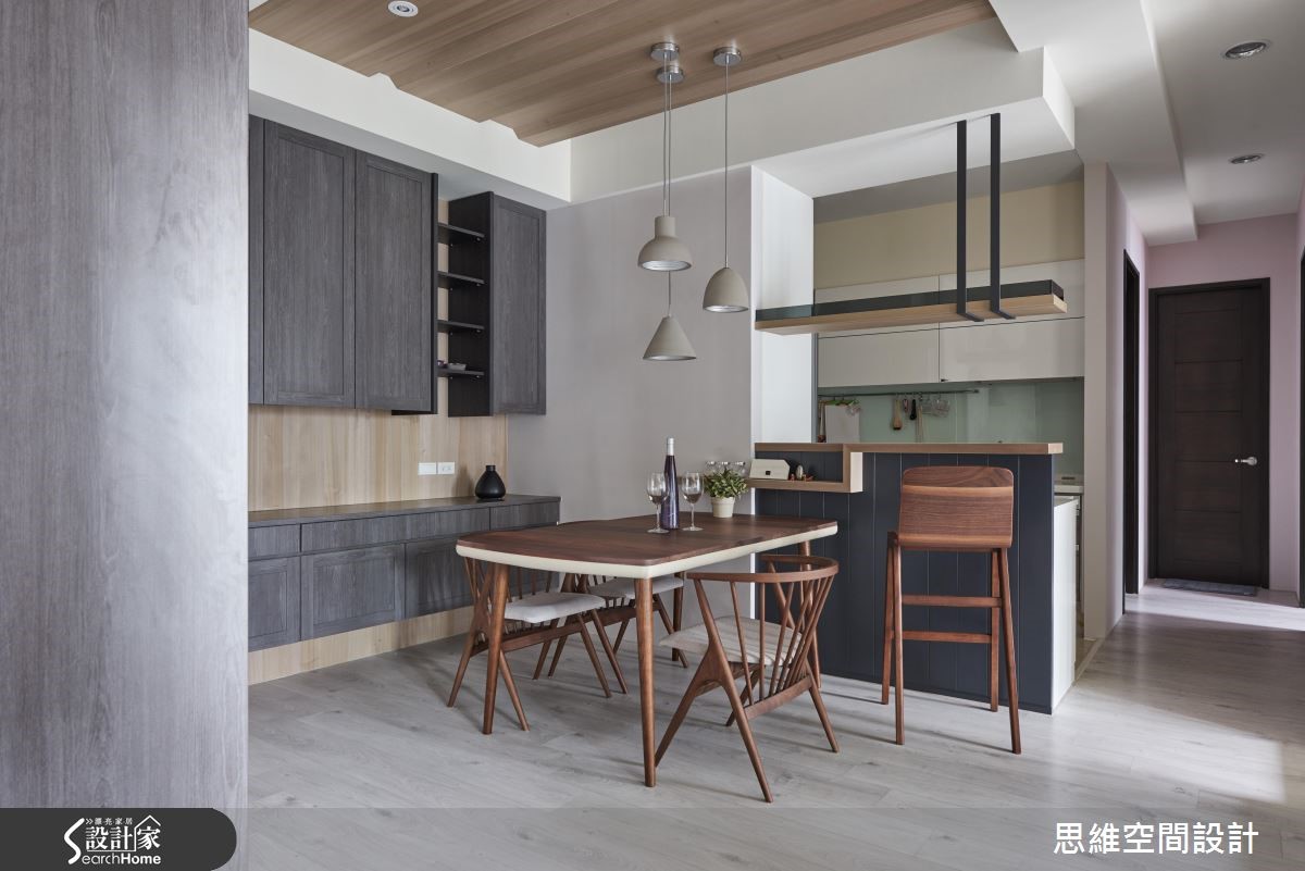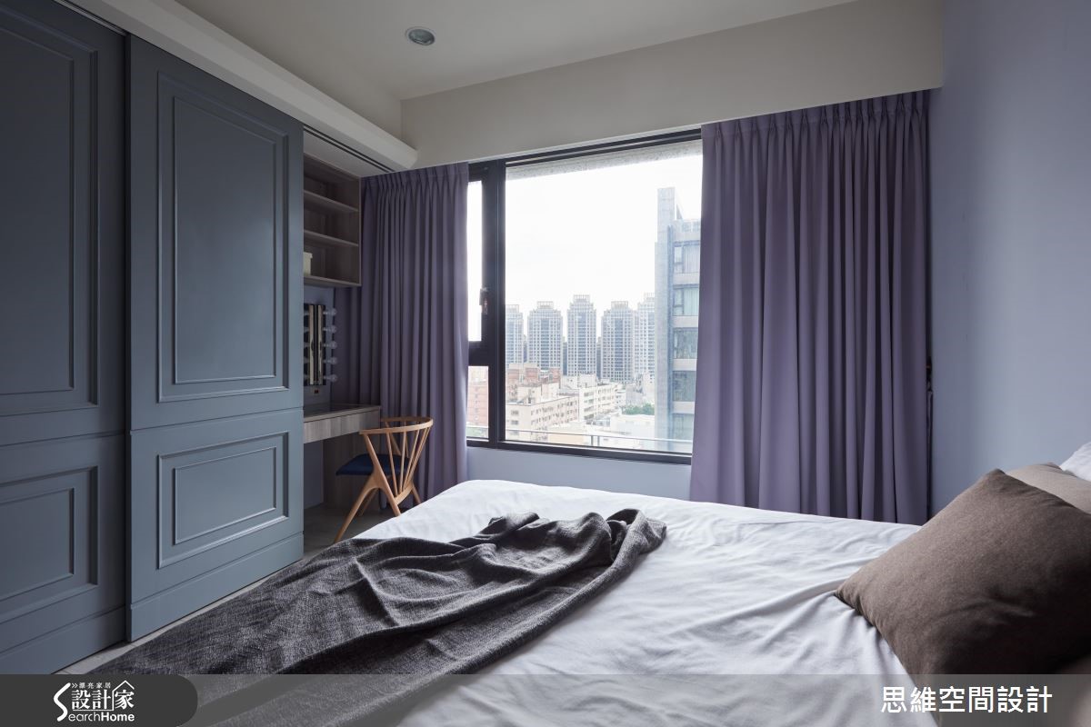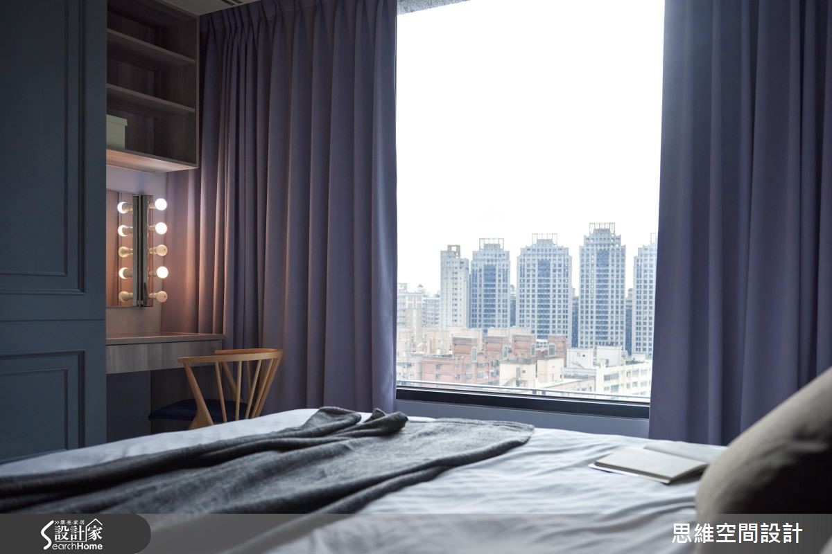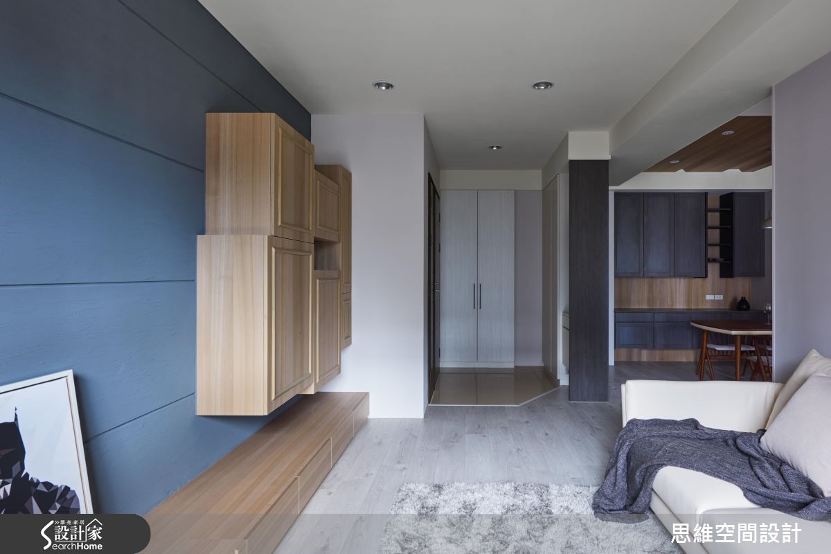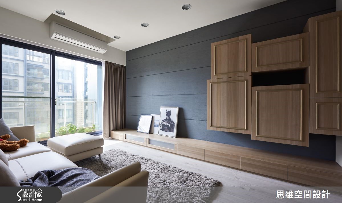 99平方米新婚宅,设计师因循屋主需求,加入唯美的灰蓝色调,营造典雅而清爽的居家氛围。并将一间居室改造作为书房使用,透过量身打造的生活机能,完美贴合小夫妻想望的新婚生活,快跟着小编一起来看看吧! 【错落叠砌的木柜,型构主墙风景】设计师拆除书房隔断,改以通透的门片配置,将采光引进餐厨领域。而客厅主墙则选用深色硅璪泥铺陈,一旁嵌上木作收纳柜,以不规则的错落形式赋予机能和美感。整体采以灰色、蓝色、灰蓝色的交织变换,演绎清爽宁静的的视觉观感。餐厅柜体以染色木皮,呼应全室的温润质感,且让用餐区、吧台呈半开放设定,增进生活中的交流互动。主卧床尾处规划一整面滑门设计,将衣柜、化妆桌等隐于立面之中,并挥洒深蓝色调,且藉由窗户导入城市美景。