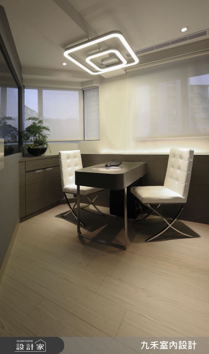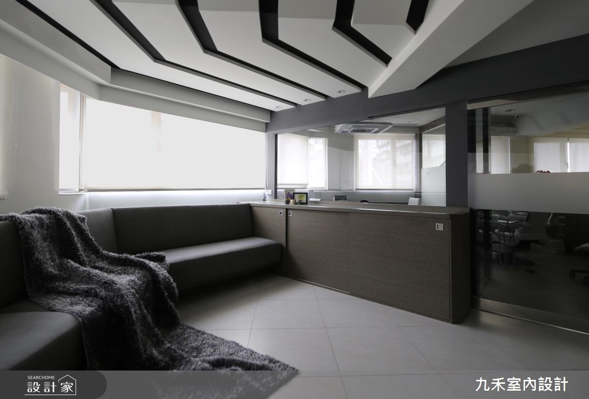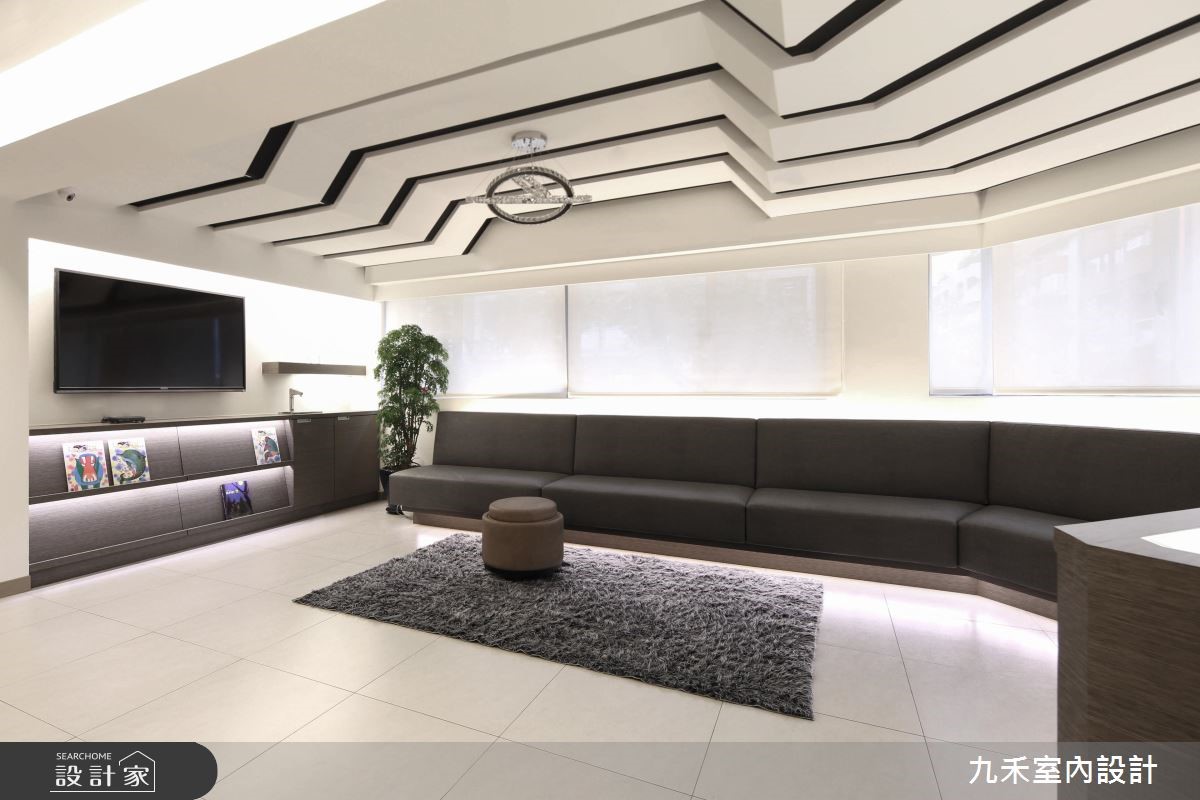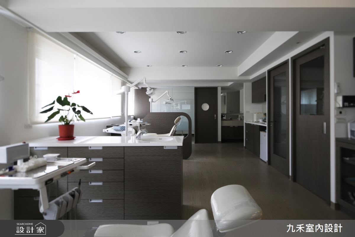 由于本身格局为多边形,为了抚平不方正的视觉感受,天花运用线条顺应形状,展现空间的开阔大器。结合玻璃、亮面质感的点缀,诠释明亮时尚的牙医诊所。揉合咖啡、米、黄色系所交织的温暖空间,抚平看牙时的紧张感受。 【高冷黑白对比,木质铺陈温暖】木作壁面以宽度不一的沟缝刻划,并连接到局部天花板,贯穿牙医诊所的LOGO设计,藉由层次感的立面造型传递自然的简约设计。天花板利用渐层的阶梯状美化大梁,并结合黑色沟缝线条,形成黑白的冷硬对比。深色线条从电视墙蔓延到迎宾柜台,替空间带来延伸之效,随着户外明亮光源的引入,使空间更形宽敞。深咖啡色系的沙发成为客人等候休憩处,下方结合间接照明,营造出柔和的室内情境。周围的展示书柜、柜台及局部墙壁以大地棕色饰底,共同创造出安定沉稳的气息。