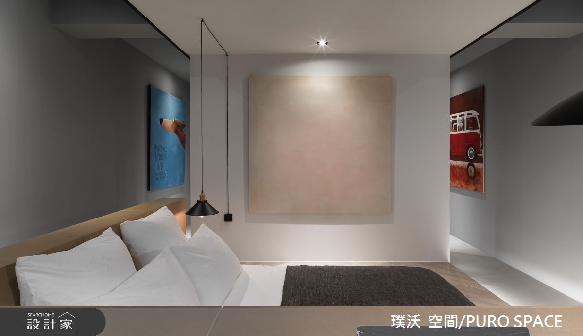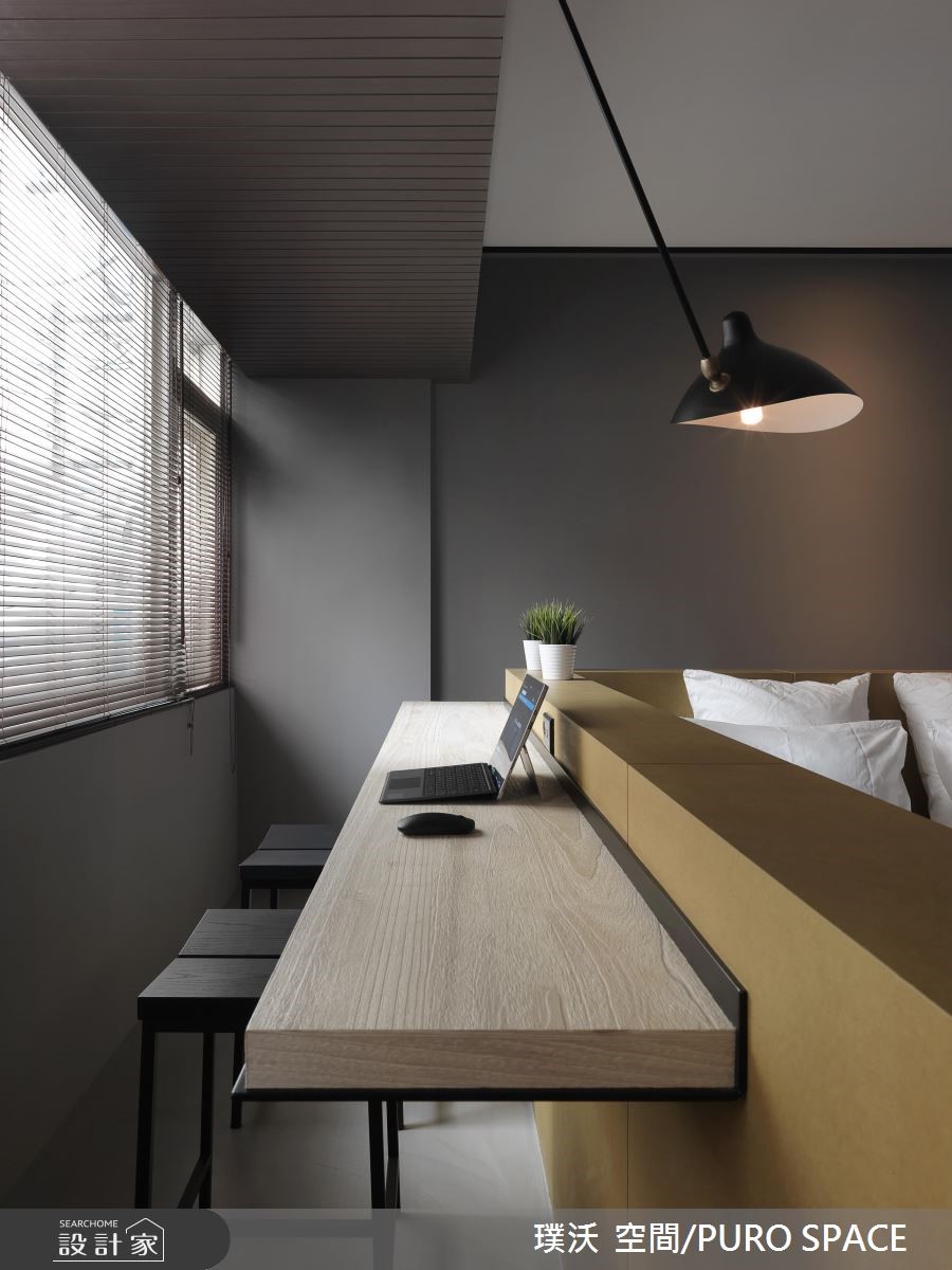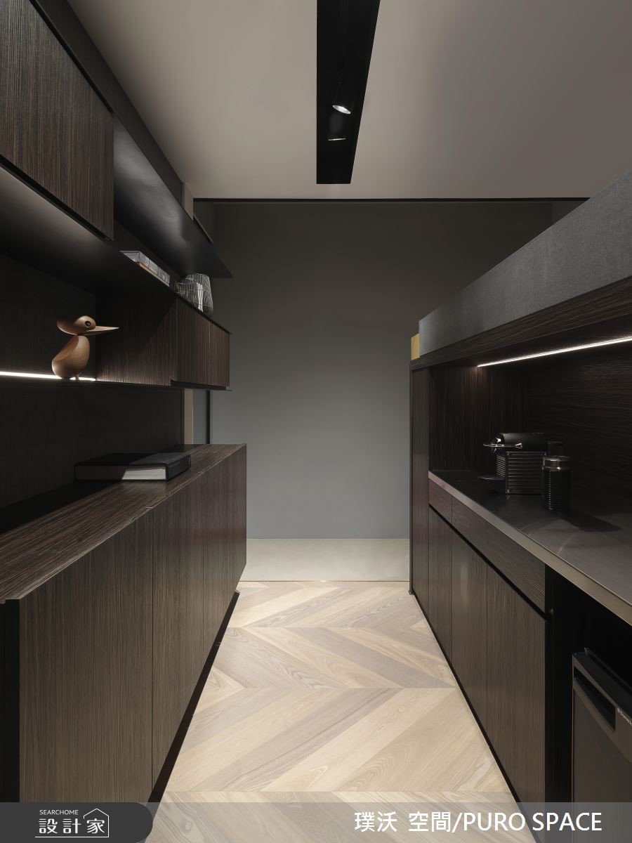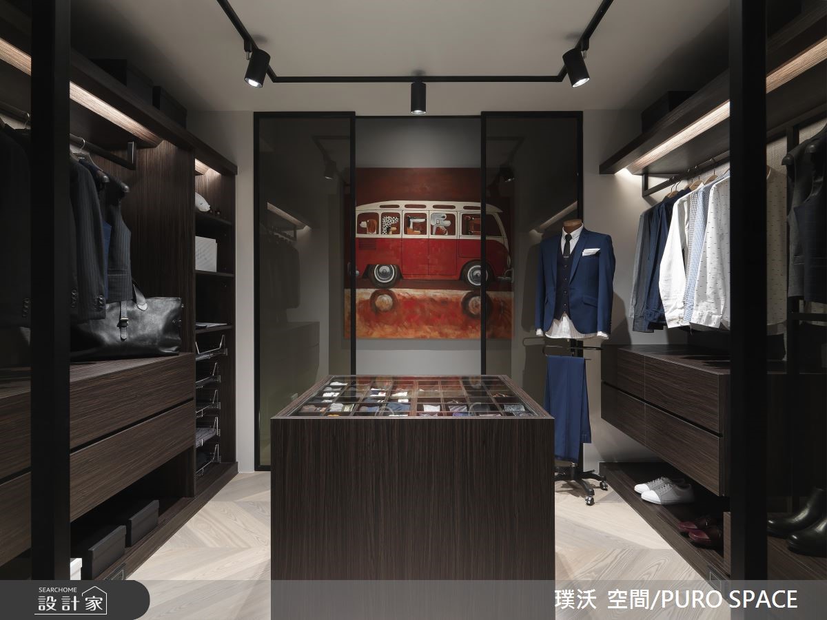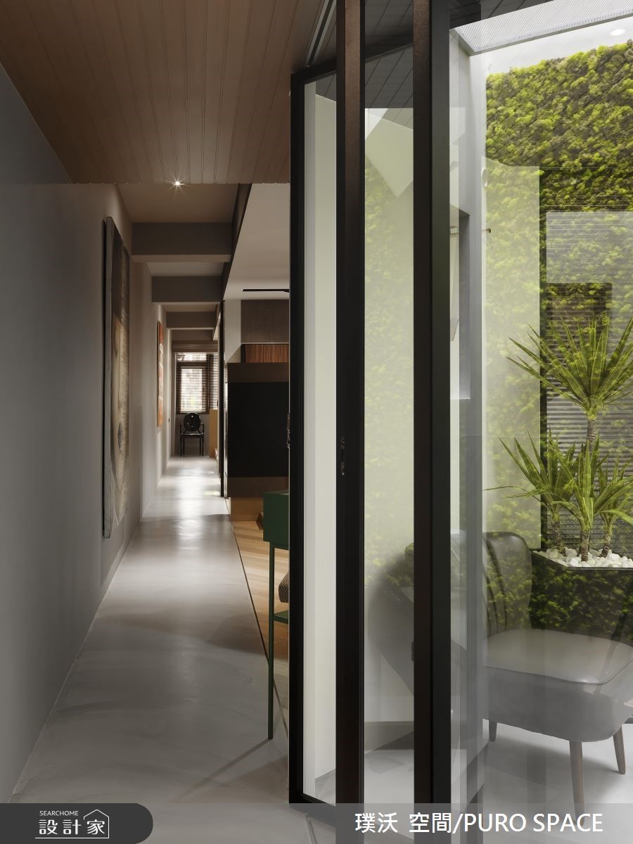 99平米的单身住宅,在时尚利落中也洋溢着清新的艺文气息,但如果不说,你一定很难想象这是男屋主居住了超过30年的屋子,不仅屋型狭长、没有足够的日光,加上老旧过时的装潢设计,也让屋主十分苦恼!且看设计师如何化腐朽为神奇!【天井引光,解决采光不足问题】为了解决采光不足的问题,藉由中庭天井引进自然光,搭配玻璃折叠门,使日光可以更流畅地进入室内空间。客厅采用双走道设计,并以人字拼木地板搭配优蒂岗石作为地坪的铺叙,不但添注了时尚人文感受,更有效修饰了狭长格局的宽度比例。【双面电视墙,让光源毫无阻碍】具有双面用途的电视墙,另一面为简易的茶水区和收纳展示空间,左右两侧引进来自卧室大窗处的自然光线,并透过玻璃拉门设计为私领域保留良好的隐私性。室内的中后段分别规划更衣室和卧室,深沉的木色与精品级的柜体设计,为屋主打造专属的时尚换装空间;而卧室则将床头墙加高做出L型延伸,再沿着窗边规划桌面平台,赋予阅读机能性。