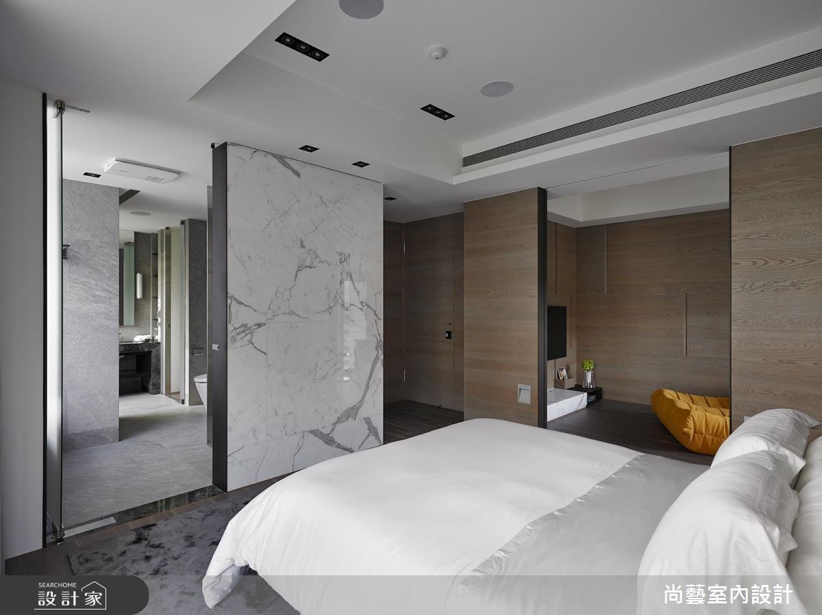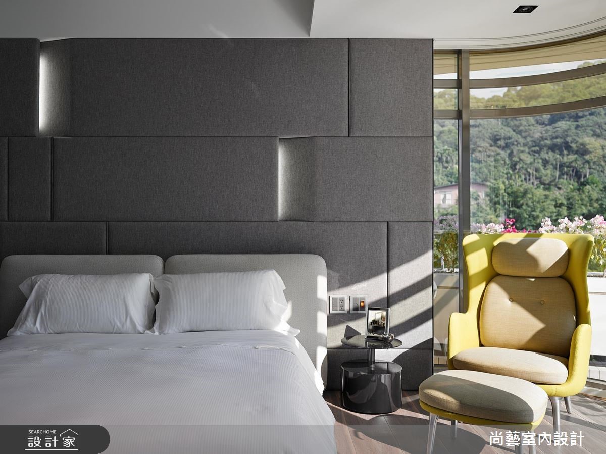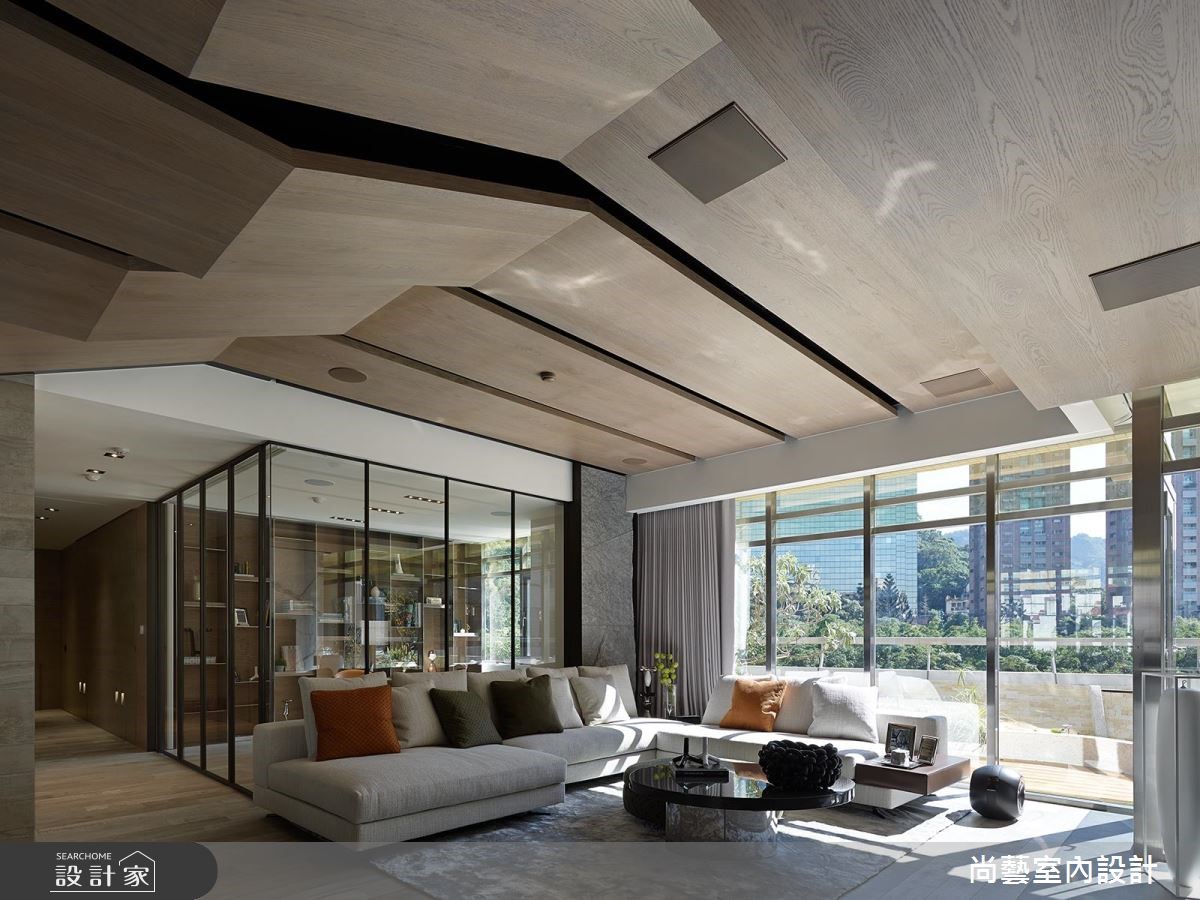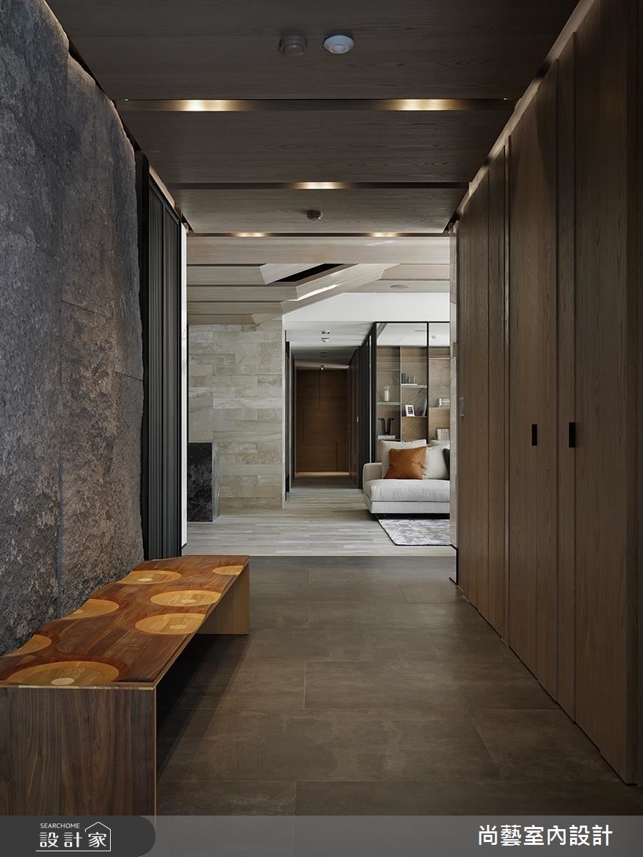 以奢华风定义的221平方米大宅,没有刻板印象中繁丽富郁的装饰和色彩,而是将周围绿意、地景延伸入室,且用层层迭错的天花棱线,描摹如户外高低伏起的山峰棱脊,并透过木质、石材隐隐显露的脉纹肌理,赋予隐敛大器的奢华意含。 【曲线天花,呼应山峦棱线】走进这处大宅,设计师以灰质石皮铺述朴犷前景,再由玄关廊道向前延伸,串连所有的空间机能,成为室内的对称中轴。层迭起伏的天花造型也特别引人注目,不但隐埋了突兀的梁体,搭配大幅的窗景,更一并收融屋外的绿意和山峰绵延。公共领域保有明亮敞朗的视域,大块石墙分跨两侧,石质的细腻脉理恣意蔓延,低调隐露奢华文艺的涵蕴。灰色调的地坪面材延续至墙面,在堆砌交错的平衡间,自然而然地稳定了空间的气场。卧室涵括盥洗、更衣、娱乐休憩等功能,墙体以木、石等不同材质区分,各自分据独立领域。更藉由床边窗景引入连绵起伏的青山绿树,在简约舒适中,也能感受大自然的气息。