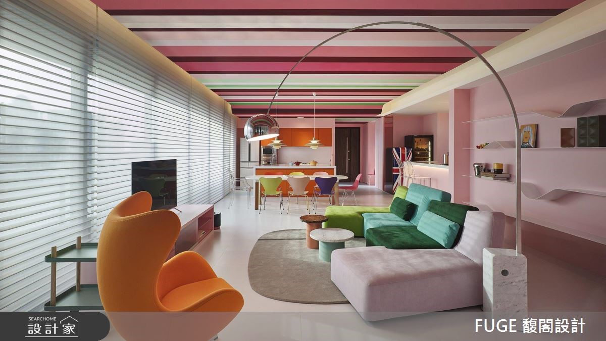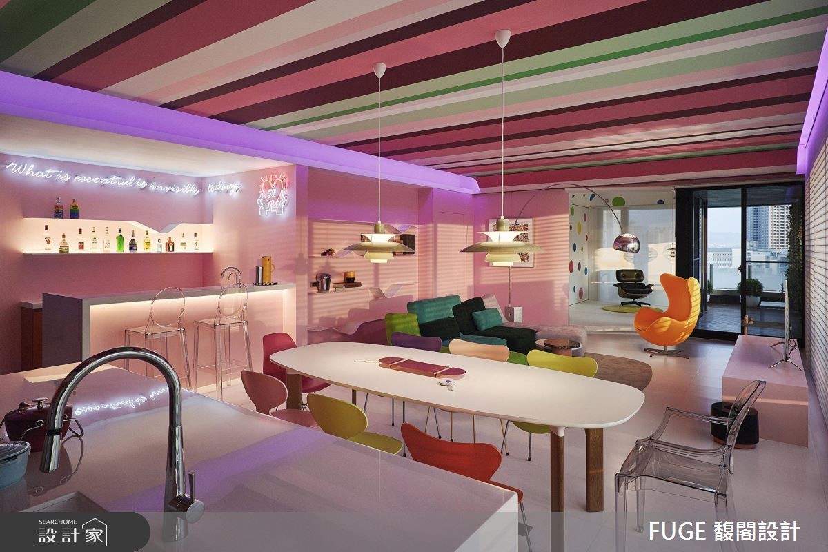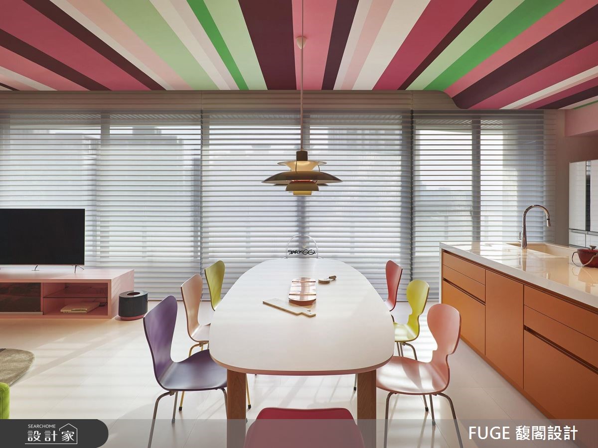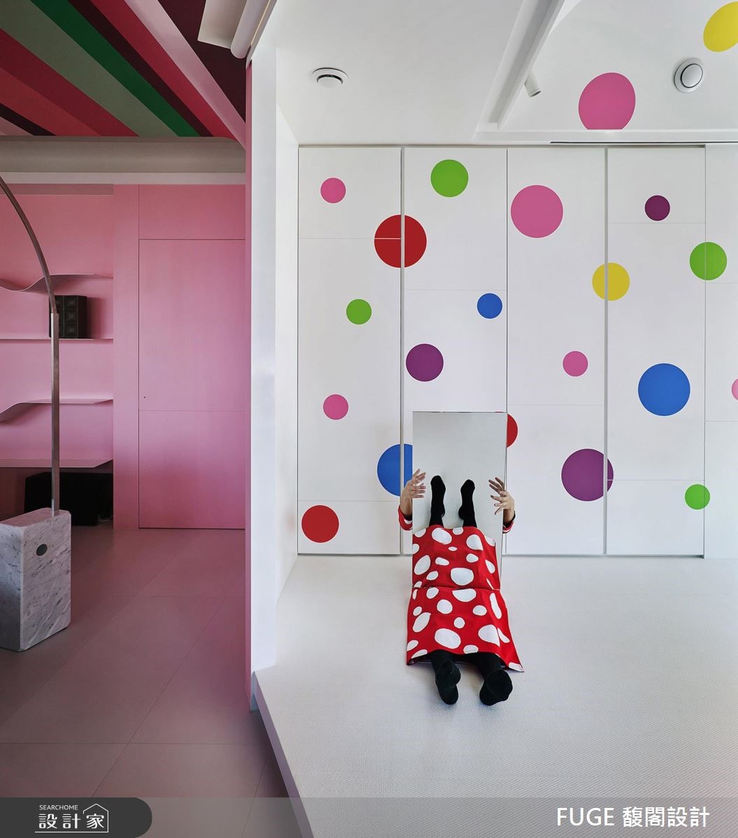 此次作品不仅藉由动线连结空间情感,亦与法国艺术家傅自华(François Fléché)合作,透过墙面壁画与天花彩绘,让整个居宅有如艺术品般生动有趣,超越住宅的制式风貌。 【多彩直条天花,缤纷生动】利用直条彩绘天花从入口一路延伸入内,创造惊艳视觉,且搭配开放式的格局分布,融合各项实用生活机能;并运用茱萸粉色调作为基底,带入甜美的氛围,让少女心不断迸发。穿插着经典波点,以及丰富的横条色块、自然光影的明暗层次等,共同型塑缤纷活泼的多彩画面,成为烘托家具的背景,让居所不再拘泥于传统面貌,而是与艺术相结合,替生活带来更多的想象。