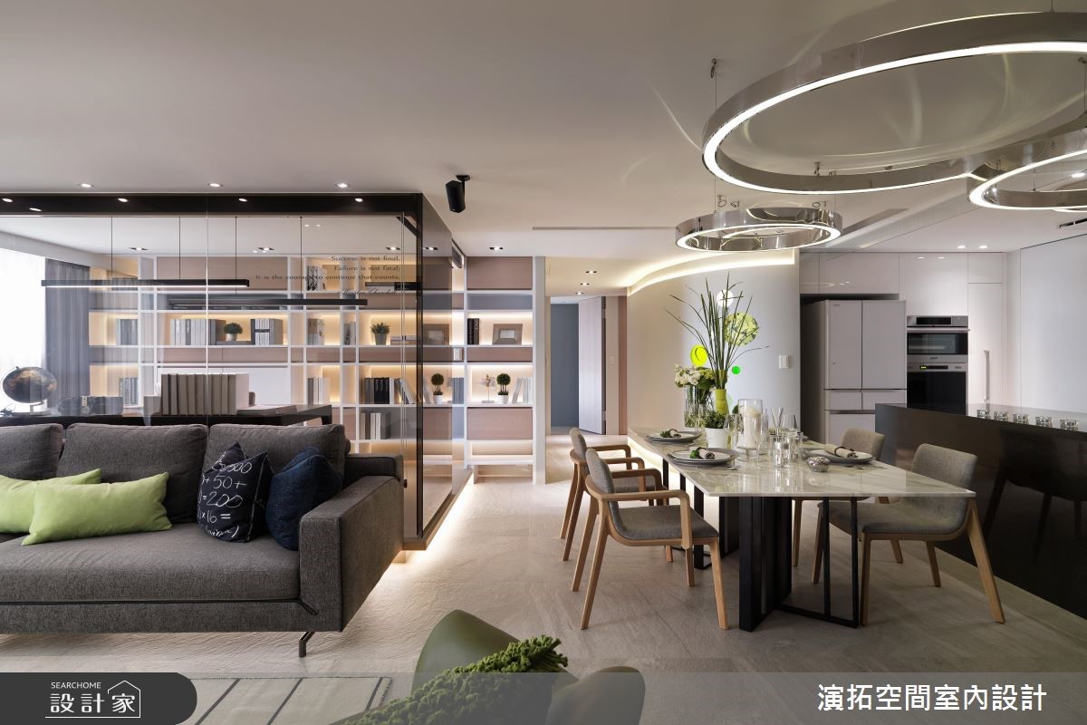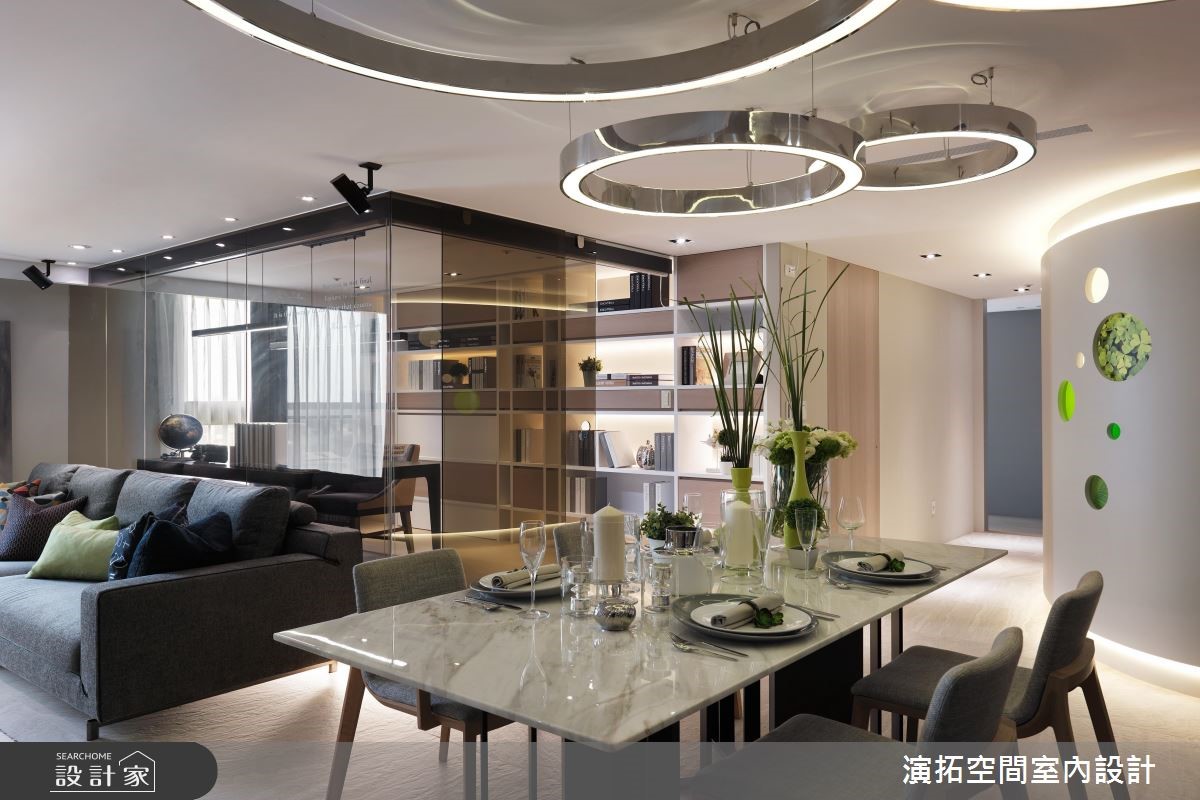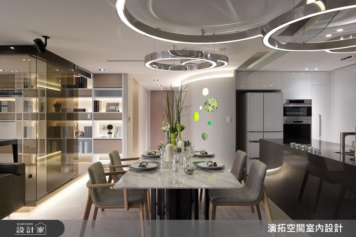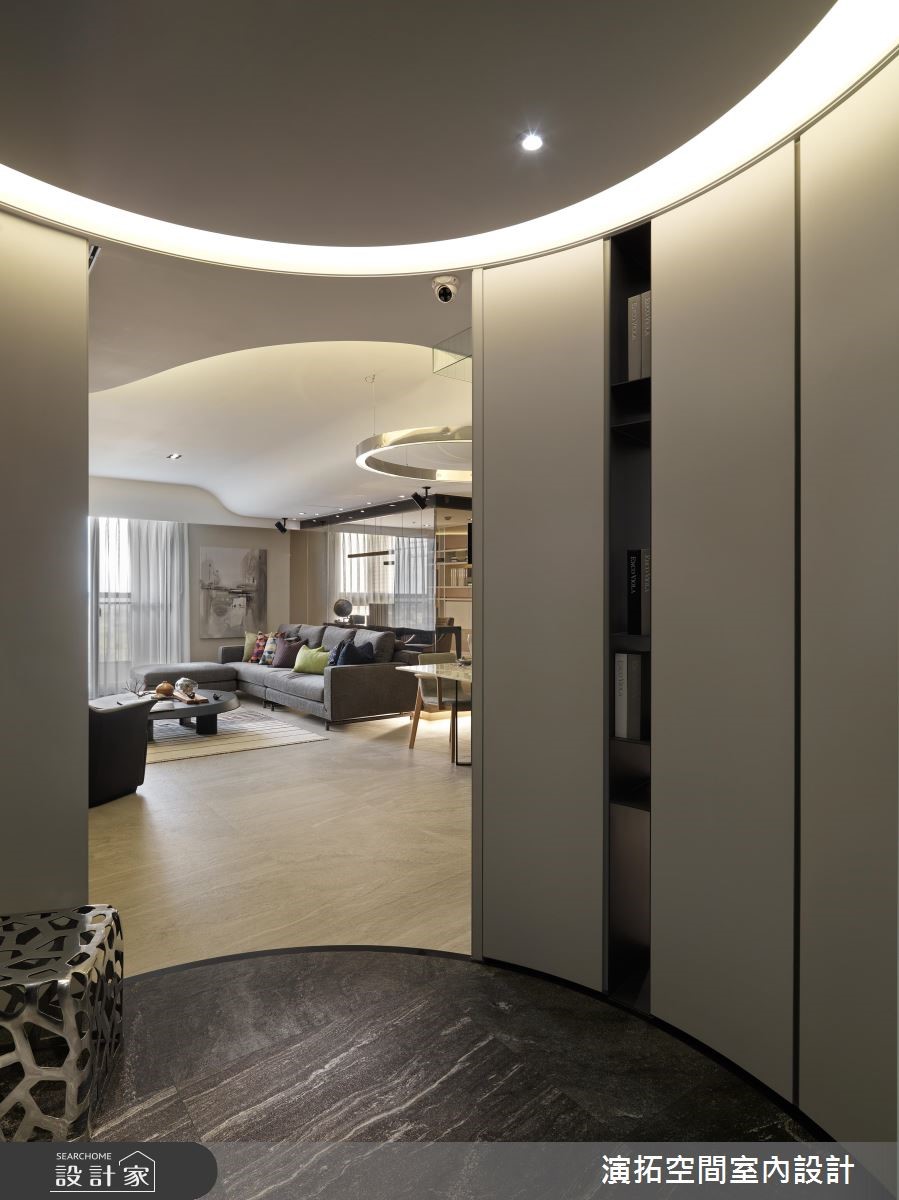 142平方米现代风居宅,设计师在施工前就发现,壁面、阳台有反潮现象,工程格外着重防潮措施,规划防潮柜用以放置皮件、皮衣等等,更量身打造厨房操作台面,且考虑到孩童安全,于细节处加入弧型收边等,照顾全家人的便利与安全。【格局与灯具造型,结合圆融意象】居宅运用圆弧语汇,取代常见的制式方正格局,从玄关起始,即以圆型场域搭配天花灯带,并沿着墙面置入收纳机能,营造出温润的入门画面;公共空间内,则可见天花、墙面转角、装饰软件,皆以圆弧图腾互相呼应,成就整个家的核心标志。【依照使用身高,调整台面高度】餐厅透过开放式布局,与厨房形成密切互动,操作台面高度特别加高,让身高较高的屋主使用更便利;书房给予玻璃围塑,营通透无碍的明亮视野,再结合嵌灯与间接灯光映衬,让内部书墙瞬间成为聚焦立面,勾勒隽永而美好的风景!