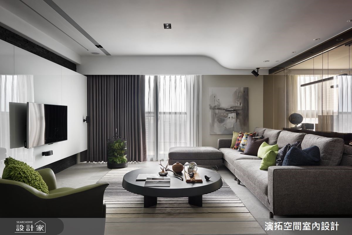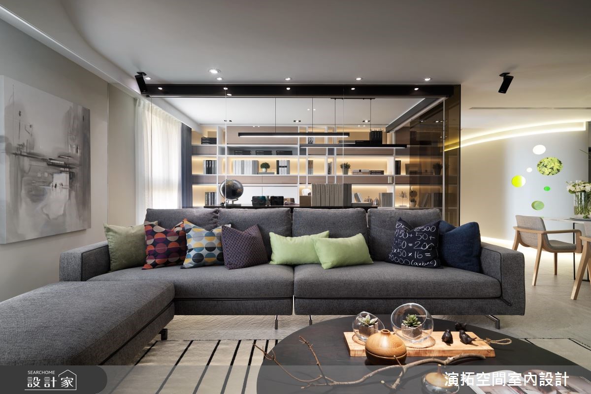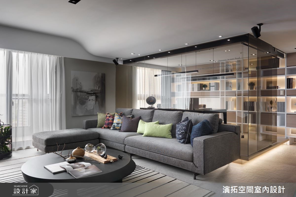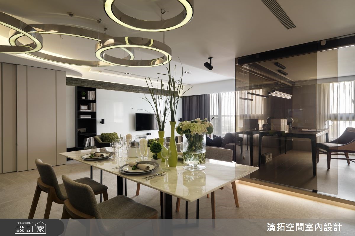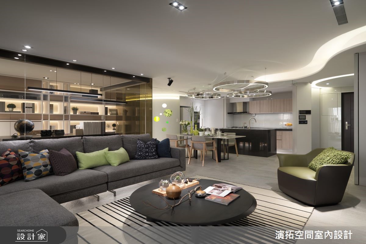 142平方米现代风居宅,设计师在施工前就发现,壁面、阳台有反潮现象,工程格外着重防潮措施,规划防潮柜用以放置皮件、皮衣等等,更量身打造厨房操作台面,且考虑到孩童安全,于细节处加入弧型收边等,照顾全家人的便利与安全。【格局与灯具造型,结合圆融意象】居宅运用圆弧语汇,取代常见的制式方正格局,从玄关起始,即以圆型场域搭配天花灯带,并沿着墙面置入收纳机能,营造出温润的入门画面;公共空间内,则可见天花、墙面转角、装饰软件,皆以圆弧图腾互相呼应,成就整个家的核心标志。【依照使用身高,调整台面高度】餐厅透过开放式布局,与厨房形成密切互动,操作台面高度特别加高,让身高较高的屋主使用更便利;书房给予玻璃围塑,营通透无碍的明亮视野,再结合嵌灯与间接灯光映衬,让内部书墙瞬间成为聚焦立面,勾勒隽永而美好的风景!