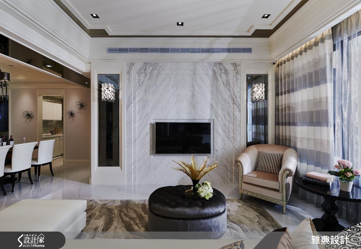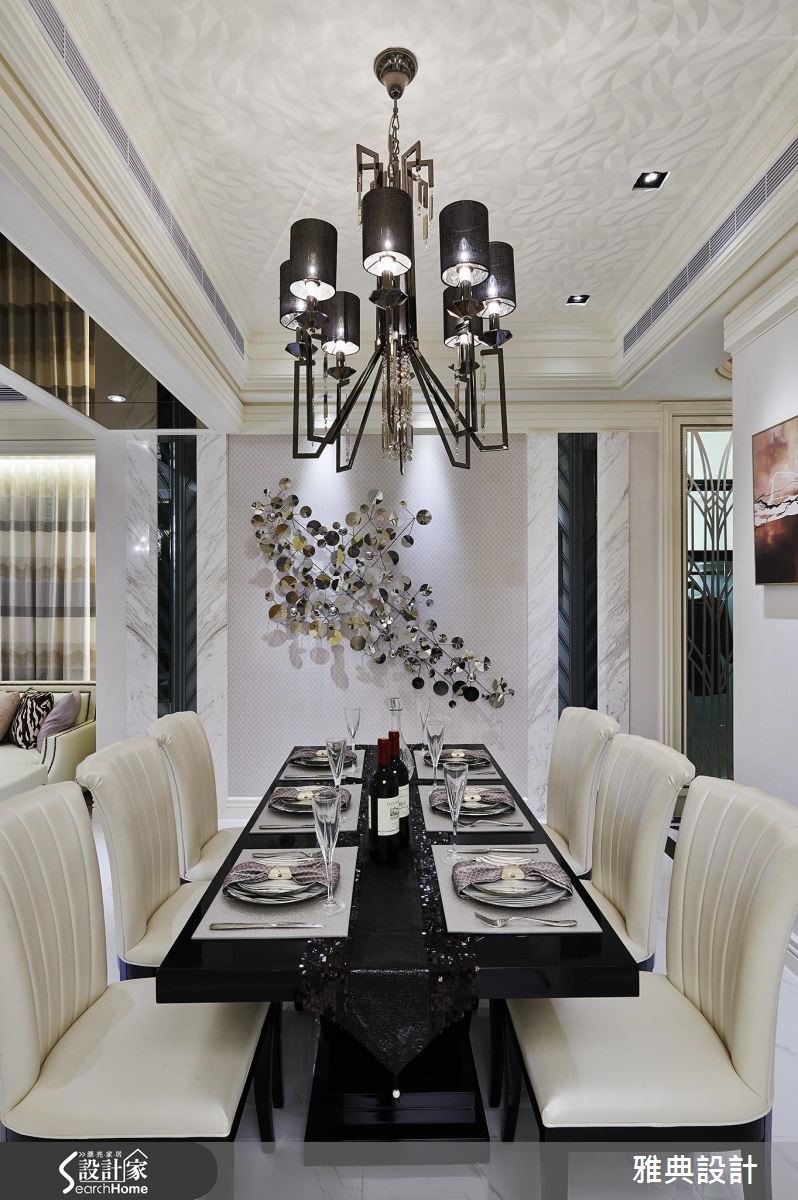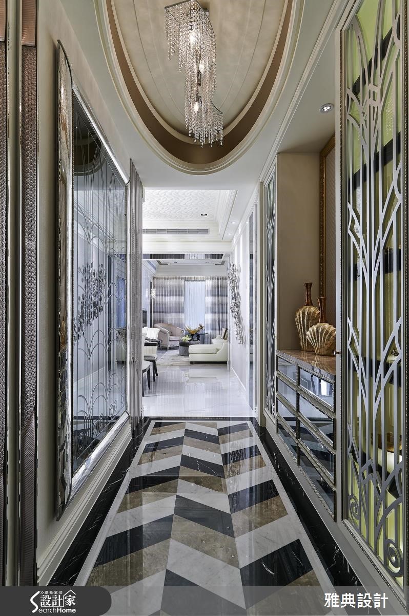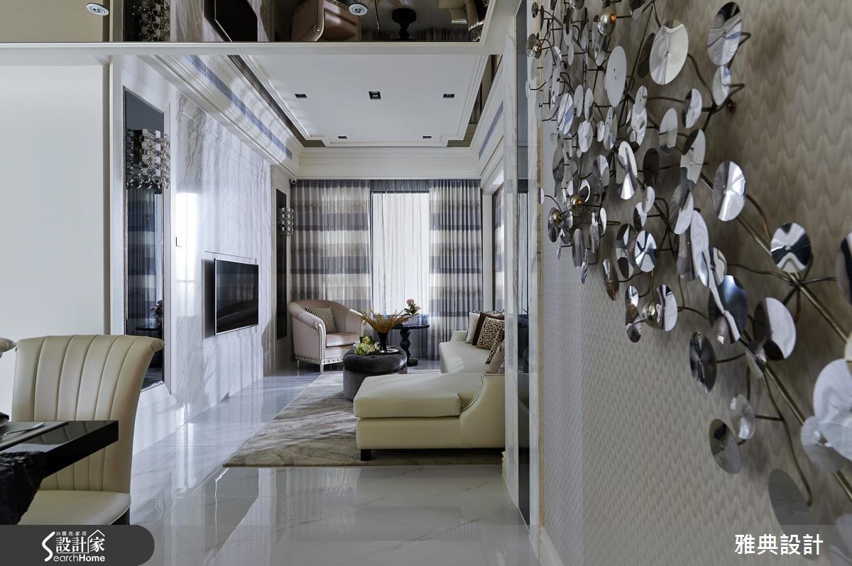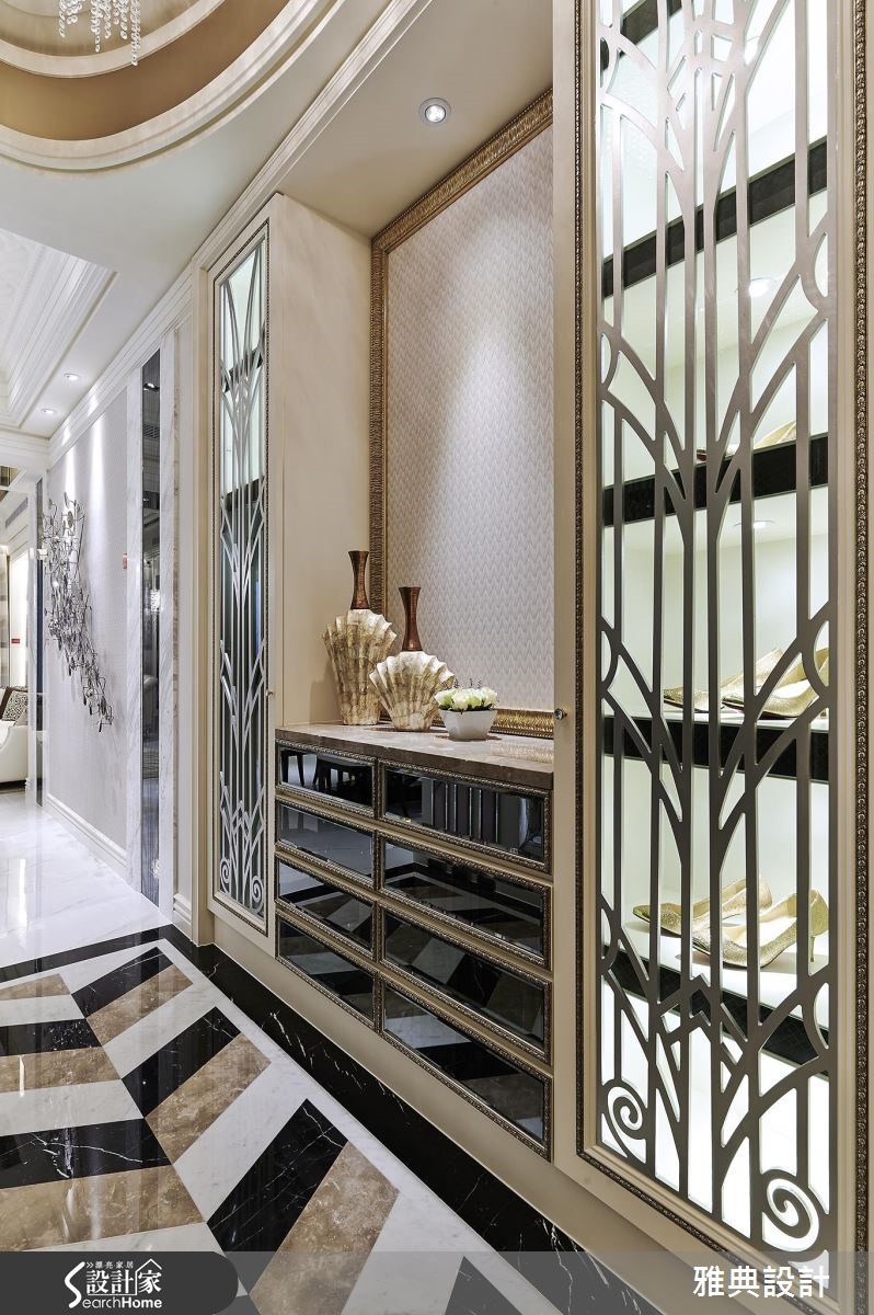 伴随空间里镜面、水晶等透亮材质的配搭,让光线恣意游走空间里,无论是停留在石材表面,彰显非凡气势,还是乘着镜面的折射效果,让炫目的明亮视觉持续蔓延,织就一片华美实境。 【石材的雅致拼贴,造大器质感】狭长的玄关领域,藉由三色石材拼接出几何地面,右侧以对称的镂空展示鞋柜作为安排,间接光源洒落在美鞋上,让人彷若来到时尚精品店。左侧墙面以精致的钻雕玻璃铺陈,展开华丽的风格序曲。L型窗景设置,让光毫无保留的流淌于室内,照亮精彩的美学细节。电视墙以层次边框的石材打造,两侧以对称灰镜、水晶壁灯配搭,加上绒布质感的茶几与时尚摆设,装饰艺术结合华丽的材质,激荡创作灵感。悬浮感的不锈钢艺术装饰延续壁面,诠释出餐厅主墙,天花板以立体视感的龙纹板为底,随着光源洒落,彷佛湖水岸波光粼粼,一旁的大梁则以茶镜铺贴,藉此消弭厚重感,让空间更显明亮宽敞。