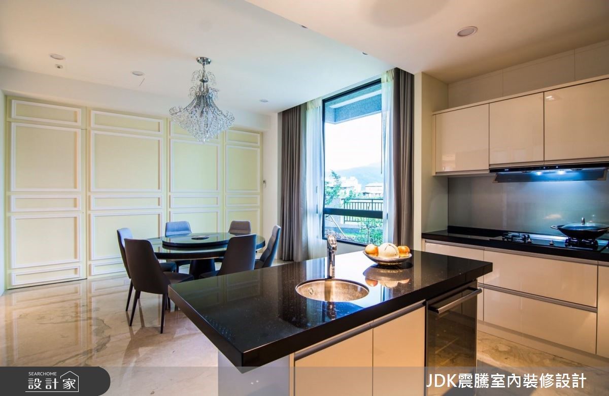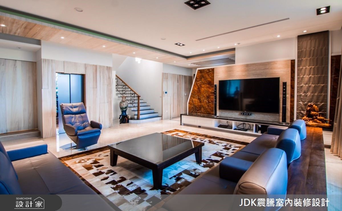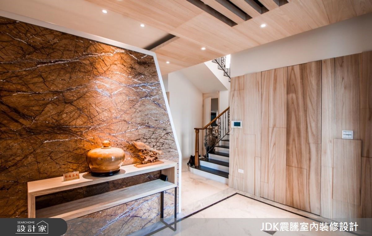 496平方米的自地自建现代风别墅,设计师依循着楼层规划,给予不同的机能属性主题。同时延揽低调奢华、沉稳内敛两种风格,满足每位家庭成员对空间的期待,快跟着小编一起来看看吧! 【黑白调与木元素,营造对比情境】一楼采用木纹石大理石结合梧桐木元素,型塑低调奢华的氛围。并藉由洞石大理石打造电视墙,融入琥珀玻璃与斜面切割线条,衍生独特而大器的表情,搭配沙发背墙进口墙布与马鞍皮地毯等,提点整体的温馨气氛。二楼给予截然不同的氛围,保有低调沉稳的内敛风格,善用深具高低层次的天花线条,呼应红色的镂空柜体,架构出利落有型的现代风范。独立于后方的书房领域,则有充裕采光相伴,形成舒适宜人的阅读领域。