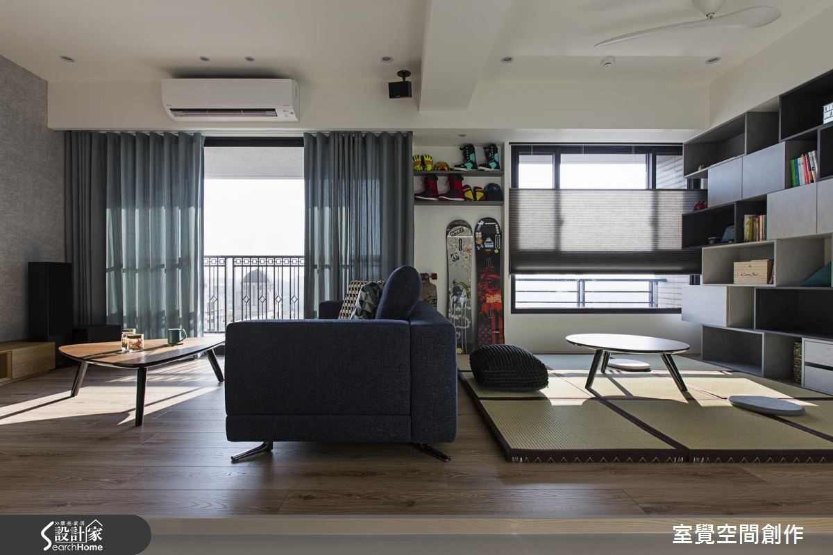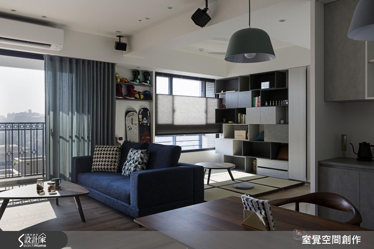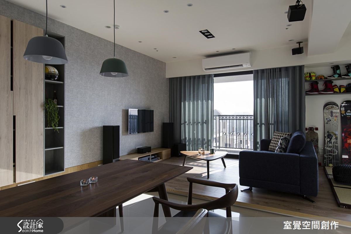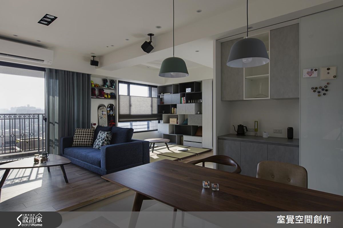 男女屋主皆为上班族,拥有独特品味的两人,期待拥有一处简约温暖又融入个性的雅居。经设计师操刀后,开放式的公领域让视觉无碍,还可将休闲娱乐的滑板妆点室内,完成宽敞无拘束感的生活风格。 【架高地板,划分空间机能】旋开大门,视野随即能与阳台外的都市风景接轨。餐厅区以大地色系的原木餐桌椅,替空间注入自然之美。客厅与后方的休憩区以架高木地板整合,并以划分出公领域的机能区隔。大门旁的柜体以门片与开放层架穿插配置,可兼具收纳与美感展示。电视墙以灰色系调和,带来简约中性的现代风格;顺着梁下位子,客厅里挑选深蓝色沙发摆设,彰显核心领域更呼应屋主独特的性格。女屋主希望打造一处不受椅子限制的休憩区,沙发后方以日系的榻榻米铺陈并摆放一张矮桌满足需求。后方壁面配置开放、封闭交错的柜体造型,提供书籍收纳与风格对象摆设,虚实相兼的设计手法,也让墙面更显活泼。