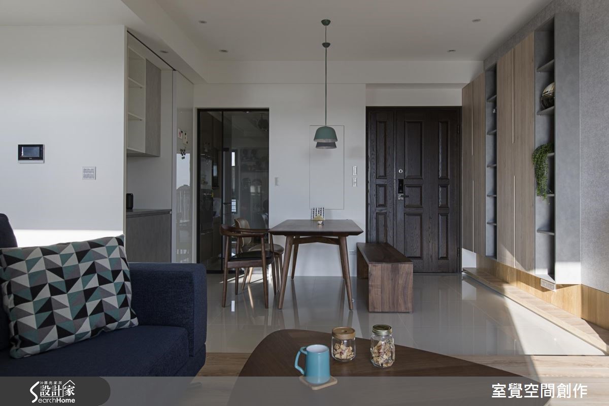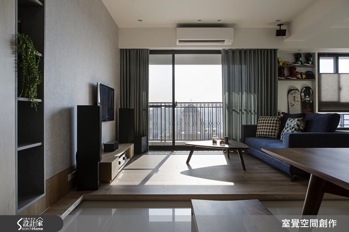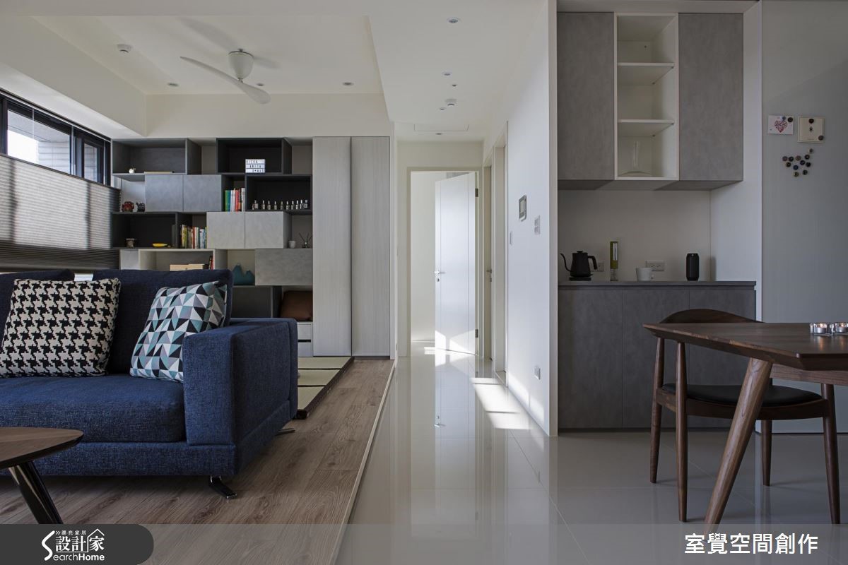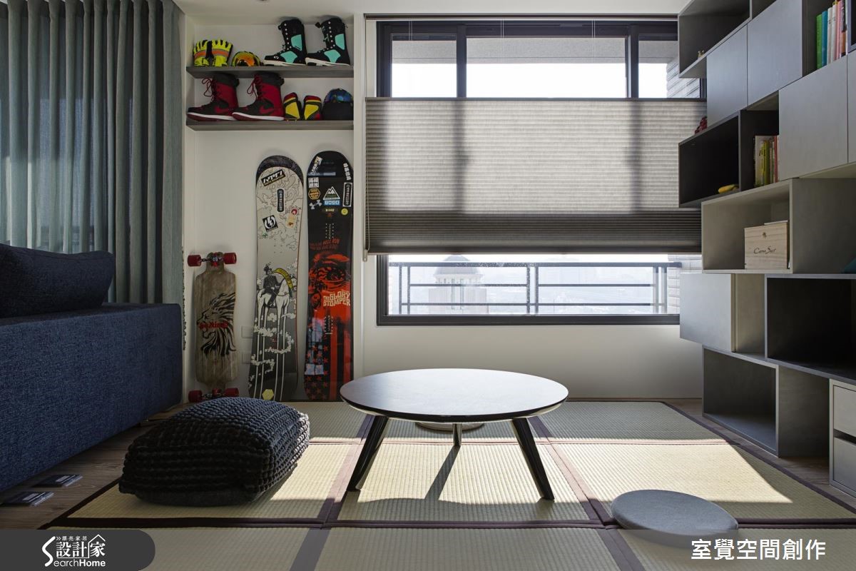男女屋主皆为上班族,拥有独特品味的两人,期待拥有一处简约温暖又融入个性的雅居。经设计师操刀后,开放式的公领域让视觉无碍,还可将休闲娱乐的滑板妆点室内,完成宽敞无拘束感的生活风格。 【架高地板,划分空间机能】旋开大门,视野随即能与阳台外的都市风景接轨。餐厅区以大地色系的原木餐桌椅,替空间注入自然之美。客厅与后方的休憩区以架高木地板整合,并以划分出公领域的机能区隔。大门旁的柜体以门片与开放层架穿插配置,可兼具收纳与美感展示。电视墙以灰色系调和,带来简约中性的现代风格;顺着梁下位子,客厅里挑选深蓝色沙发摆设,彰显核心领域更呼应屋主独特的性格。女屋主希望打造一处不受椅子限制的休憩区,沙发后方以日系的榻榻米铺陈并摆放一张矮桌满足需求。后方壁面配置开放、封闭交错的柜体造型,提供书籍收纳与风格对象摆设,虚实相兼的设计手法,也让墙面更显活泼。