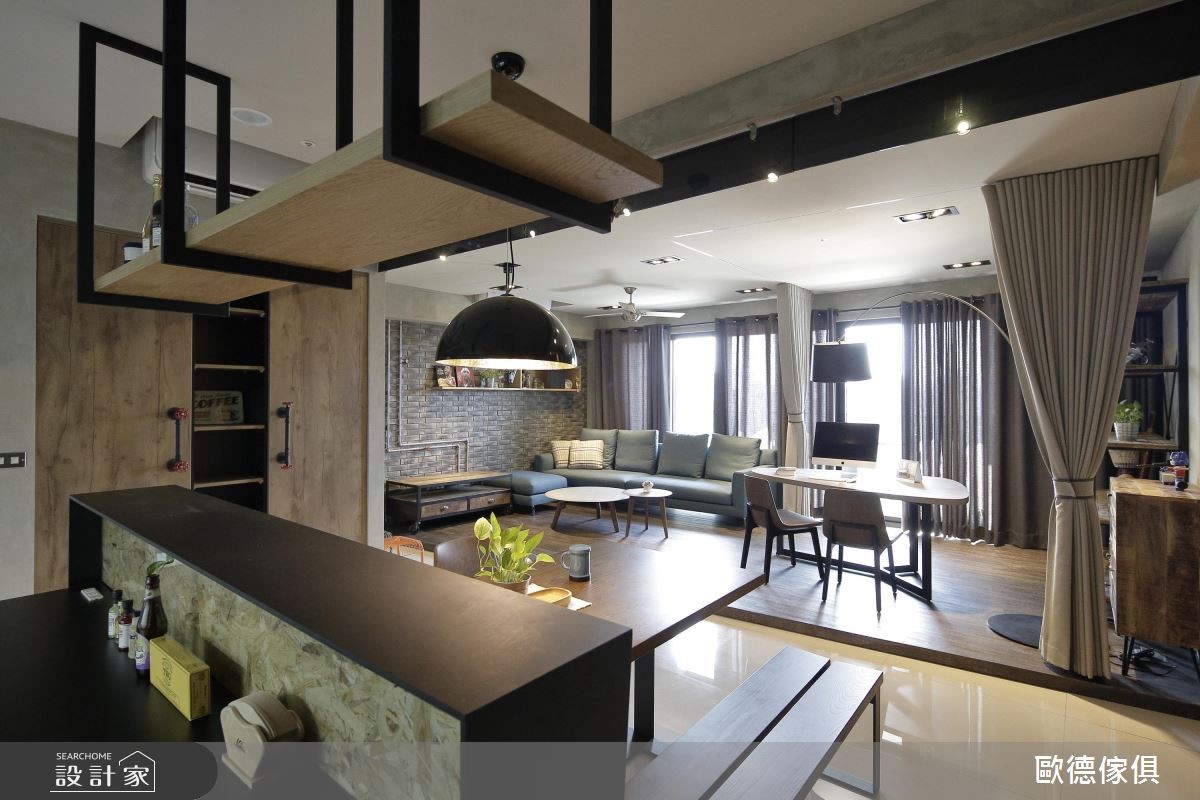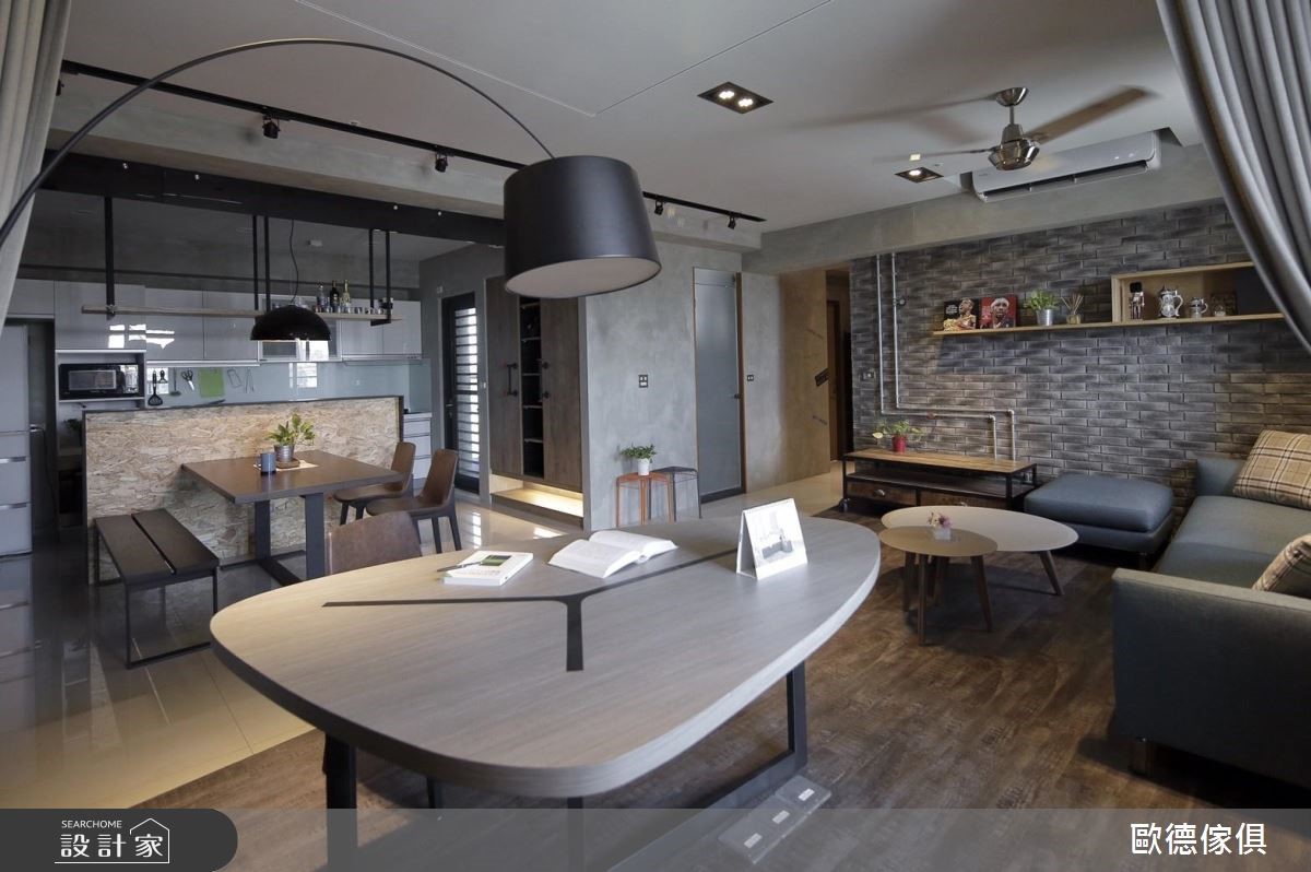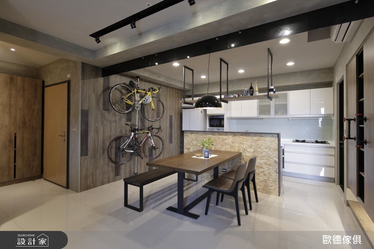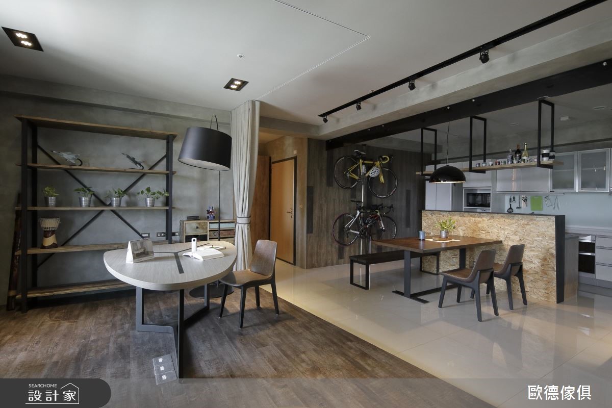 屋主独钟工业风的魅力,同时喜好咖啡厅的悠闲氛围,期望自己的新家也能结合二者魅力,于是设计师采以系统家具统整收纳,搭配铁件、文化石、乐土矿物涂料等素材,勾勒出年轻带有个人色彩的住宅表情。【木材质混搭,中和空间温度】客厅,选用灰色文化石与木地板奠定温润基调,搭衬裸露管线、水龙头把手等工业元素,瞬间提升整体风格,并采用带有北欧质感的书桌及沙发,替粗犷基底加入些许宜人的暖意。餐厨配置咖啡红豆杉板材打造的电器柜及客制化中岛吧台,成为屋主专属的料理场域,一旁则在墙面装置脚踏车悬挂架,塑造出美感、机能兼具的展示立面;主卧墙面采沉稳灰色为主调,加入不落地的床头柜设计,呈现利落的空间风貌!