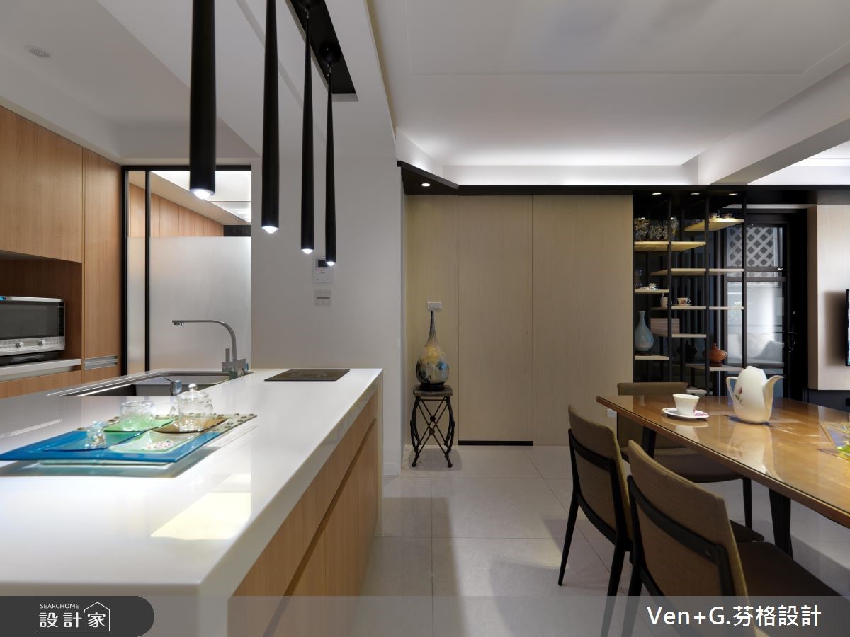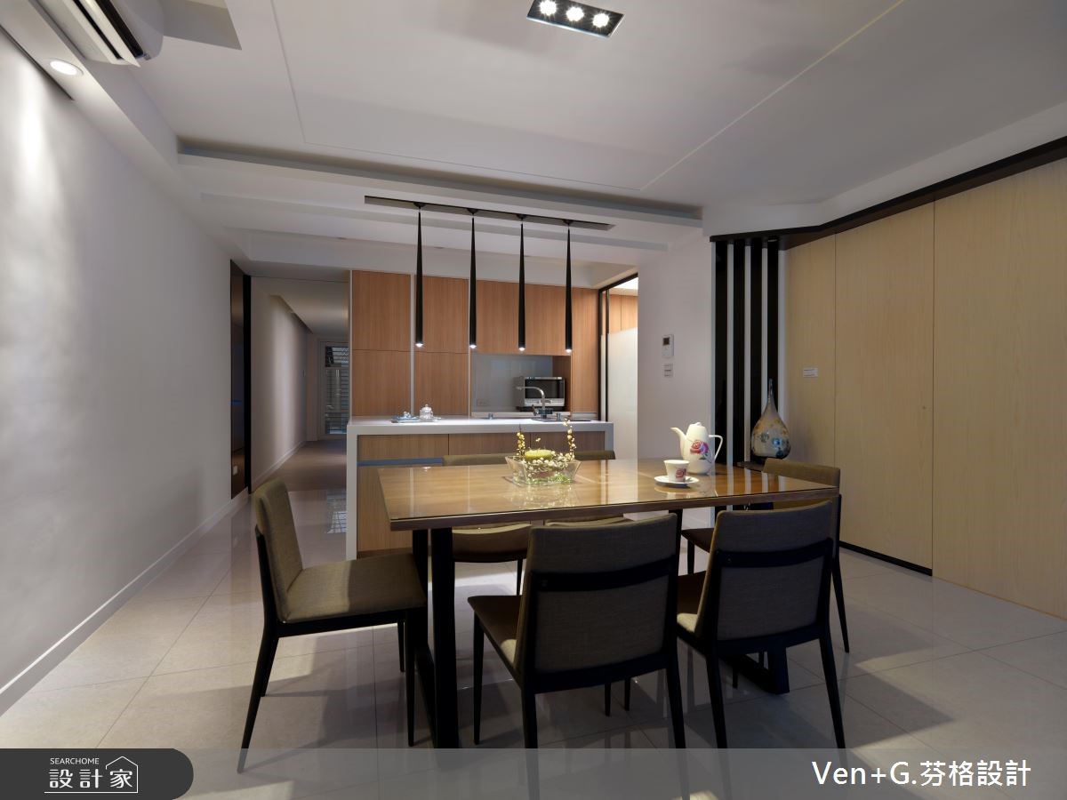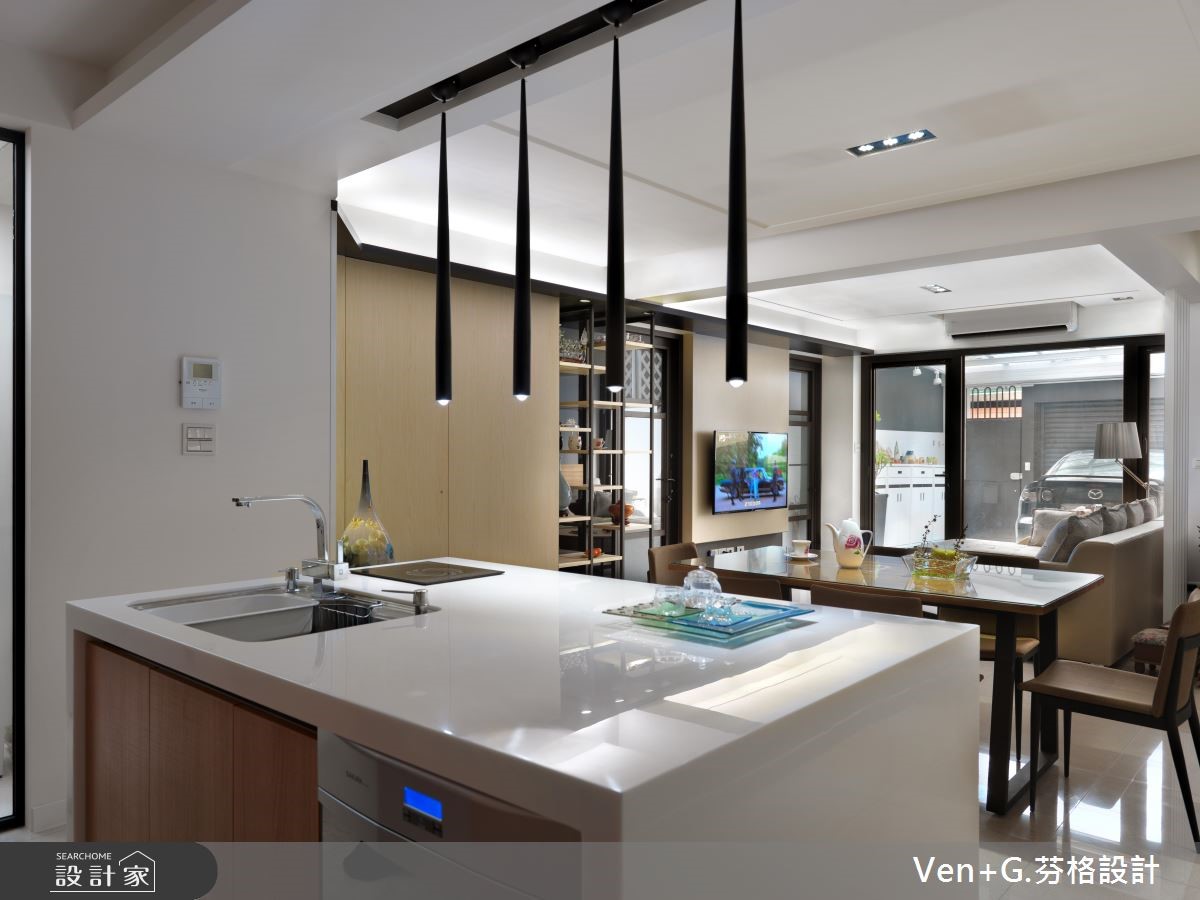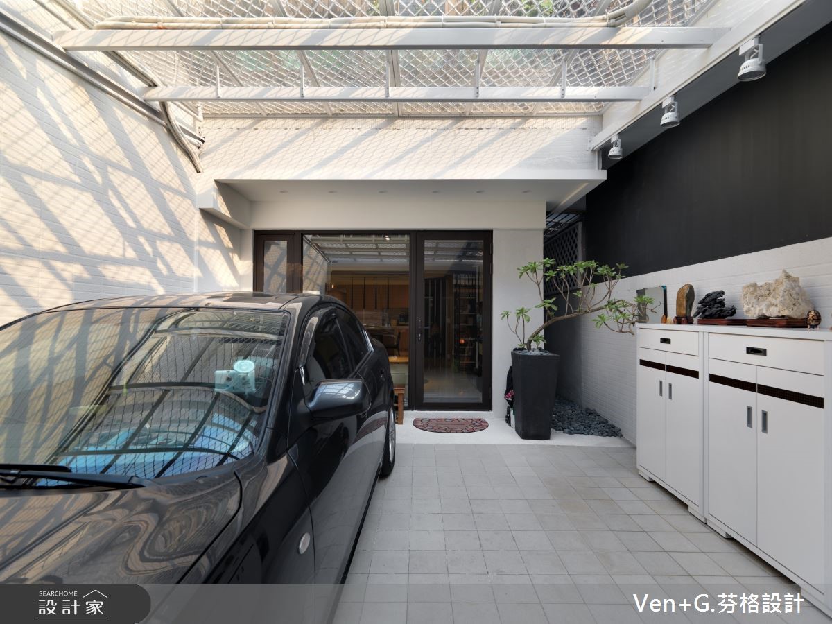面对光线走不进来、通风不足的狭长老屋,经过设计师重新规划装修后,让阳光与空气都能导引入室,加上空间里利用玻璃妆点,营造出通透之感,让老屋彻底变身明亮阳光宅。【玻璃材质,营造清透感空间】室外宽敞的车库腹地,上方以光罩设置屋顶,将户外阳光接引进来,而玻璃材质的落地门窗设计,加上开放式的格局安排,让光得以恣意流淌于室内,赋予流动感的活力气息。进入公共领域,电视墙以浅色木纹铺陈,搭配两侧玻璃门扇,让空间更显通透与放大;而圆形茶几、收纳柜与餐厨区则以木纹肌理呈现,搭配简约的白色衬底,营造出舒心自然的有氧宅。