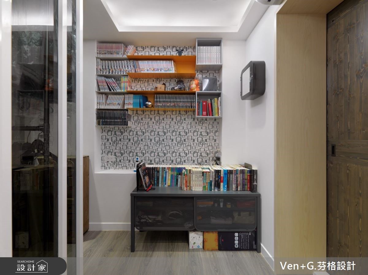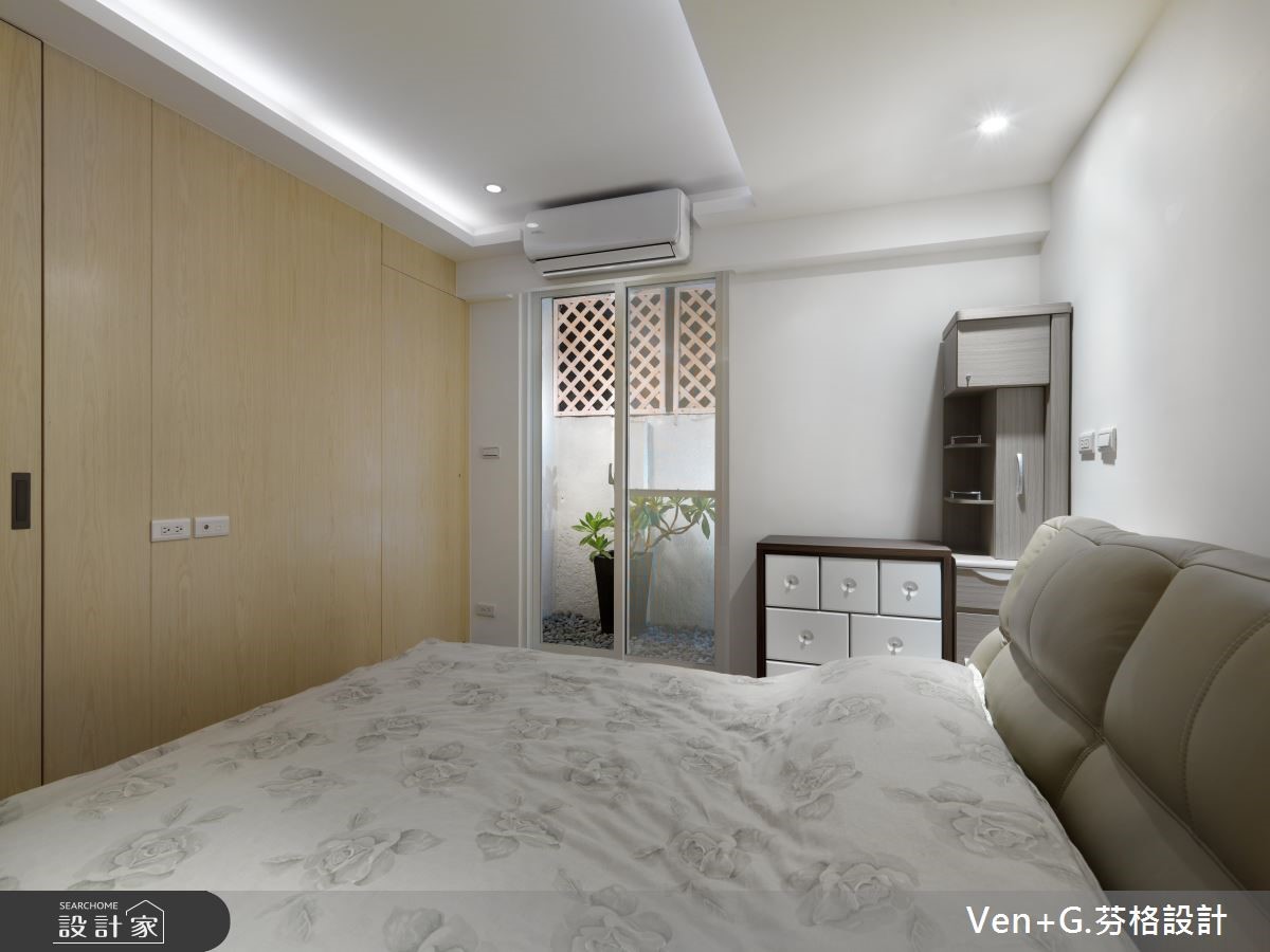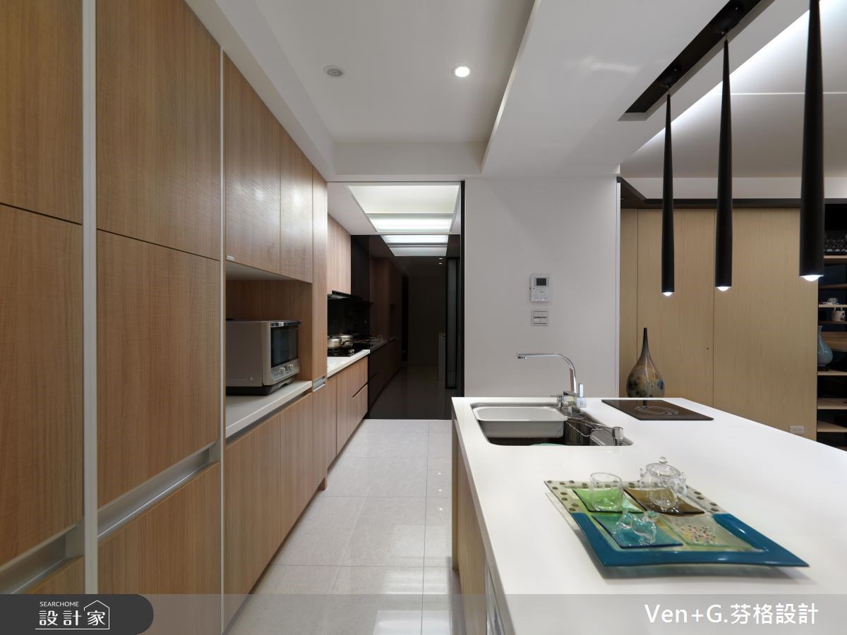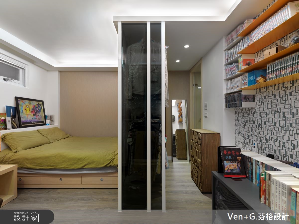 面对光线走不进来、通风不足的狭长老屋,经过设计师重新规划装修后,让阳光与空气都能导引入室,加上空间里利用玻璃妆点,营造出通透之感,让老屋彻底变身明亮阳光宅。【玻璃材质,营造清透感空间】室外宽敞的车库腹地,上方以光罩设置屋顶,将户外阳光接引进来,而玻璃材质的落地门窗设计,加上开放式的格局安排,让光得以恣意流淌于室内,赋予流动感的活力气息。进入公共领域,电视墙以浅色木纹铺陈,搭配两侧玻璃门扇,让空间更显通透与放大;而圆形茶几、收纳柜与餐厨区则以木纹肌理呈现,搭配简约的白色衬底,营造出舒心自然的有氧宅。