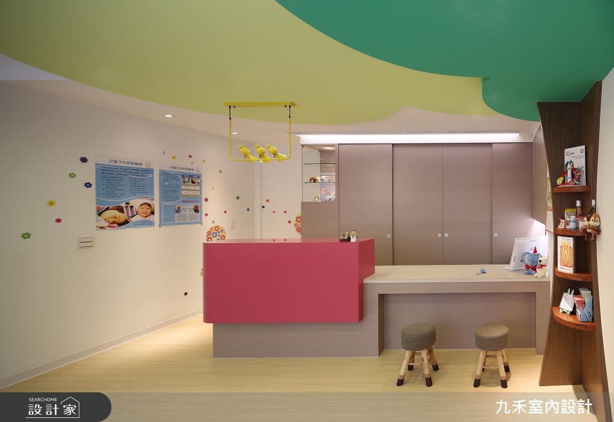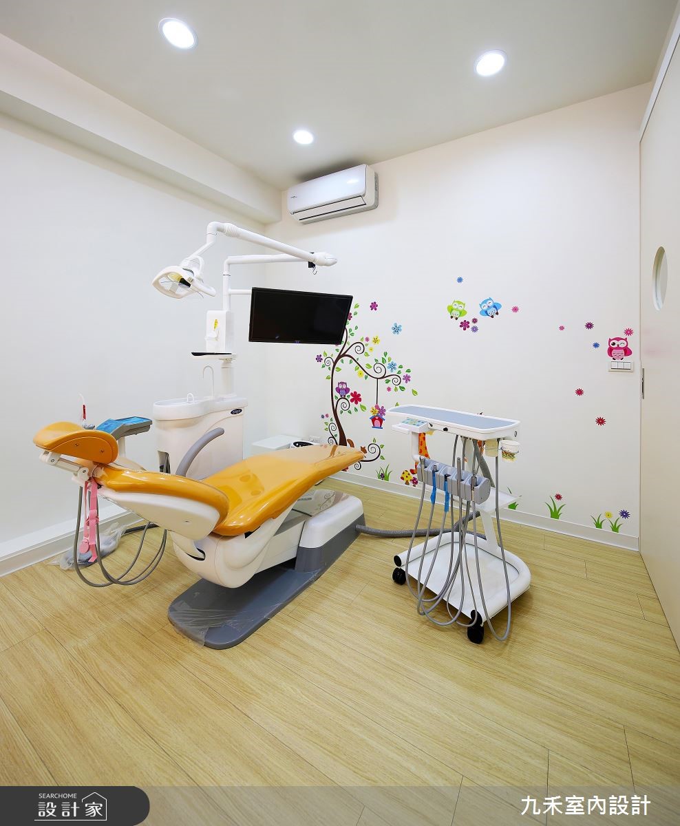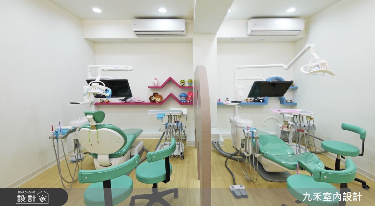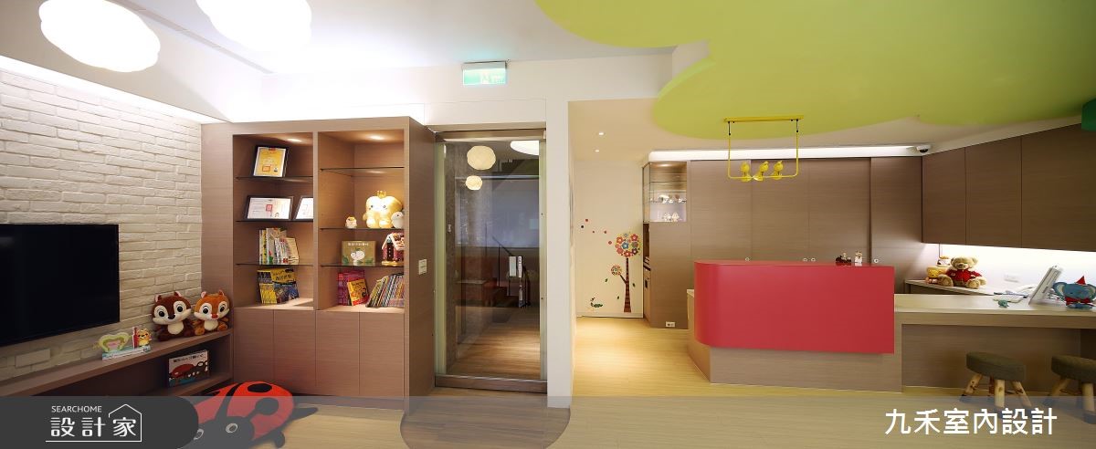 花栗鼠儿童牙医诊所,前身为132平方米长型老屋,经由改建后加入北欧风格,坐拥儿童游戏区与宽敞的看诊空间,并搭佐充满童趣感的设计,瞬间瓦解传统牙医的压迫感,创造出深受孩童喜爱的舒适氛围。 【粉嫩色彩,造悠闲好心情】由于老屋原本阴暗无光,拆除隔断引入大量日照,空间更为明亮。大量使用明亮的色彩、柔和的装饰,营造欢乐无压的气氛。采用独特温暖的光源,并悬吊云朵造型吊灯,赋予徜徉大自然的美好意境。墙面的展示柜则以木色为底,并延伸至天际,有如耸立且开枝散叶的大树,搭配随处可见的动物玩偶。柜台处并加入三只黄色小鸟为装饰,诊间有大象造型隔间,以童话元素增添整体的生动俏皮感,打造出深受孩子喜爱的场景。