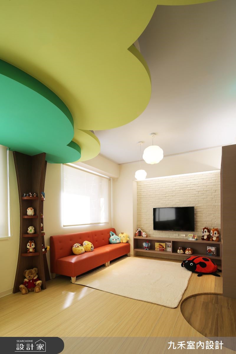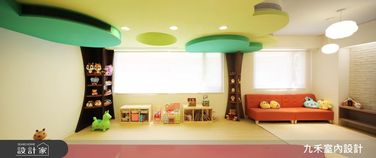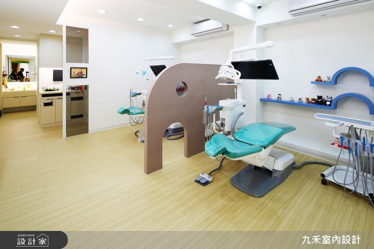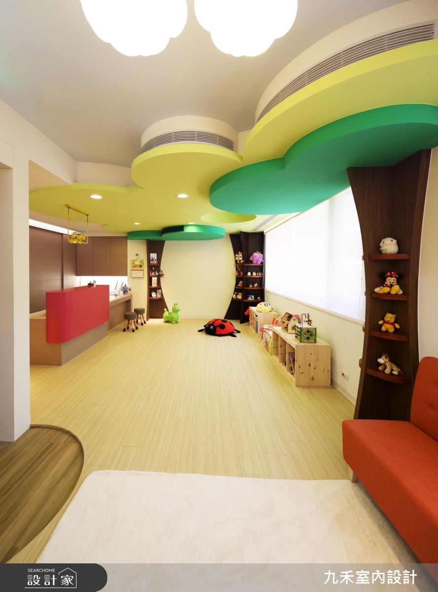 花栗鼠儿童牙医诊所,前身为132平方米长型老屋,经由改建后加入北欧风格,坐拥儿童游戏区与宽敞的看诊空间,并搭佐充满童趣感的设计,瞬间瓦解传统牙医的压迫感,创造出深受孩童喜爱的舒适氛围。 【粉嫩色彩,造悠闲好心情】由于老屋原本阴暗无光,拆除隔断引入大量日照,空间更为明亮。大量使用明亮的色彩、柔和的装饰,营造欢乐无压的气氛。采用独特温暖的光源,并悬吊云朵造型吊灯,赋予徜徉大自然的美好意境。墙面的展示柜则以木色为底,并延伸至天际,有如耸立且开枝散叶的大树,搭配随处可见的动物玩偶。柜台处并加入三只黄色小鸟为装饰,诊间有大象造型隔间,以童话元素增添整体的生动俏皮感,打造出深受孩子喜爱的场景。