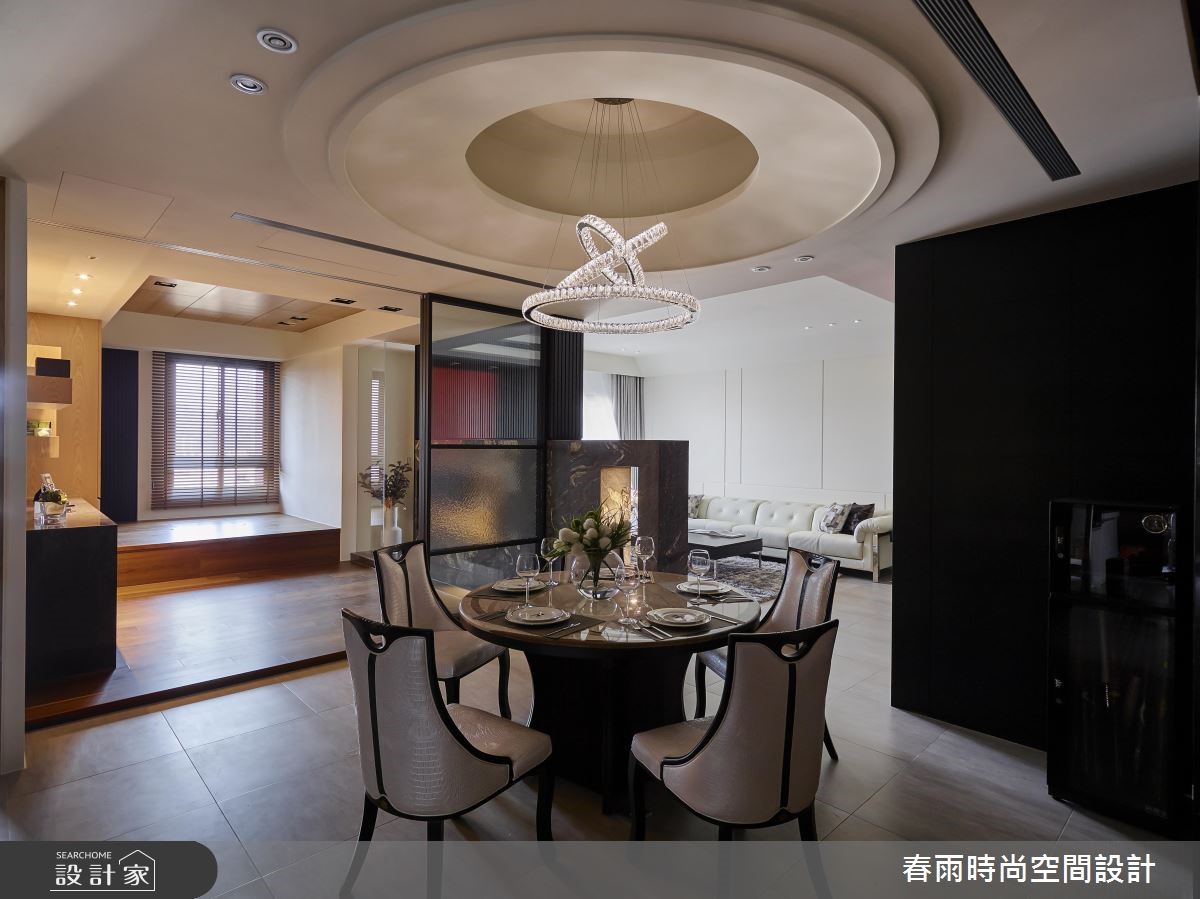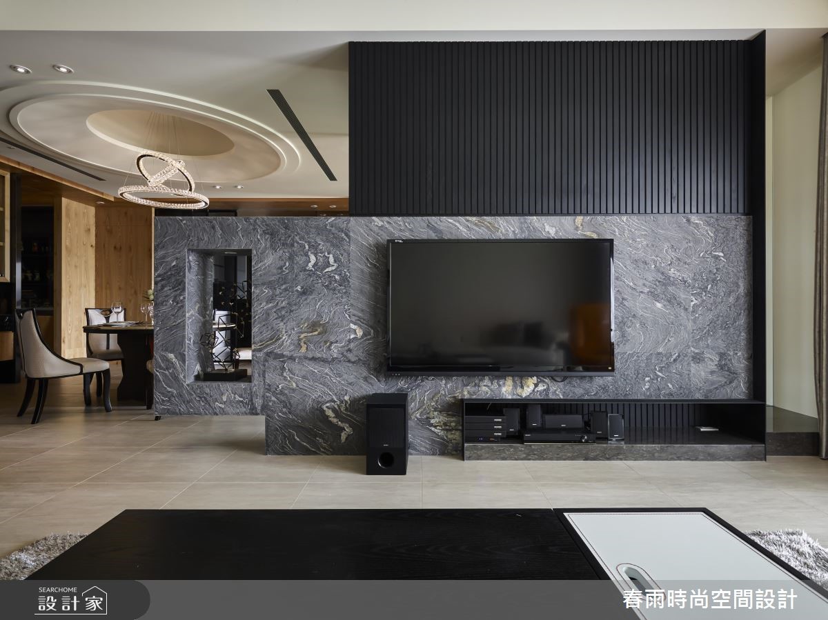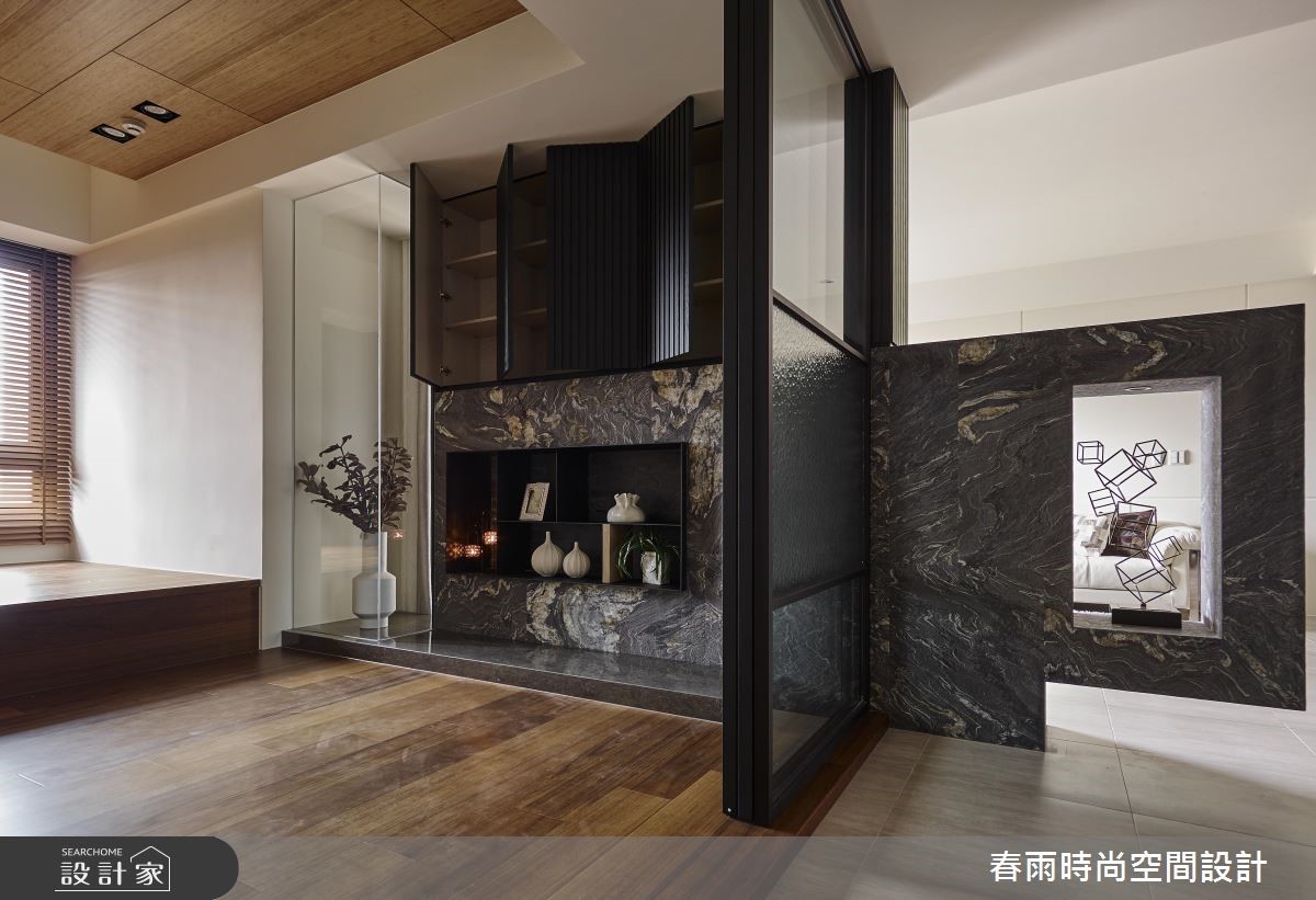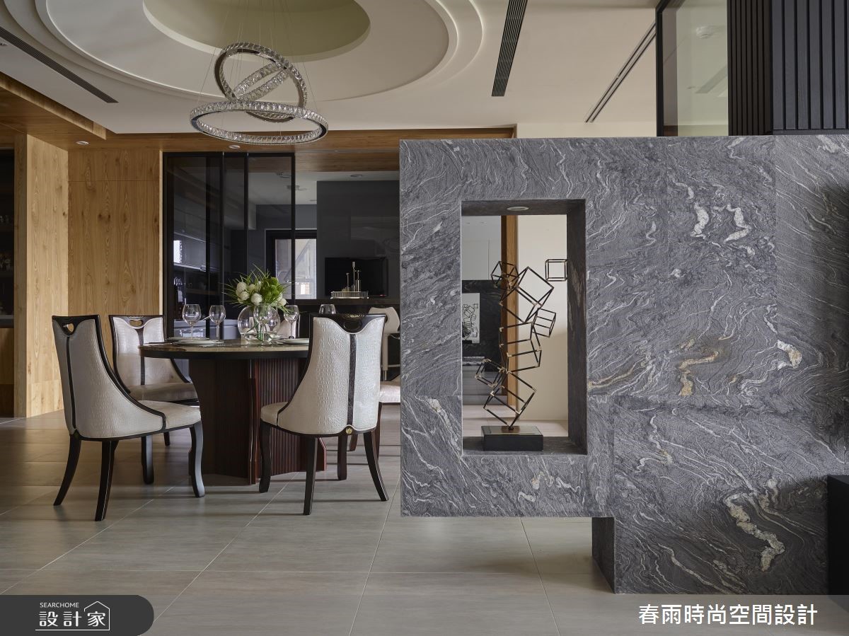 63 坪大宅,因家庭成员皆已成年,并且涵括两个世代,设计上相当注重居住者的隐私,以及一家人团聚的公共空间规划,设计师以时尚大器的现代风定义,搭配大理石材质、细部的灯光佐饰,以及充裕的收纳设计,完成机能与美感兼具的优质跨世代居所。步入这处住宅空间,半身高的铁灰色大理石墙相当吸睛,以浓郁的纹理挹注天然石质的艺术质性,向外稍微延伸,巧妙地拉阔了客厅的比例,并以虚实相间的镂空展示框格,与后方的用餐区、和室,保留开放敞亮的视感。玄关旁则将储藏室结合佛龛,既满足了收纳的机能需求,也让视线无法直接穿透屋内,达成隐私性的考量。餐厅为连繫家人情感的温馨场域,以圆融而优雅的天花设计与餐桌造型相互呼应,象徵一家人的幸福和圆满。多功能和室可兼做客房使用,利用,内部具有衣橱、矮柜等储物设计,另外,在架高木地板下方与电视墙后方也延伸大量的展示和收纳功能,打造实用和质感兼具的时尚大宅。小编的最爱宛如国外景观饭店的主卧室,可以望见辽阔的户外视野,来自阳台与五角形的窗檯处的明亮採光,为工作区和卧榻处提供了充裕的自然光线,形塑舒适放鬆的私领域氛围。