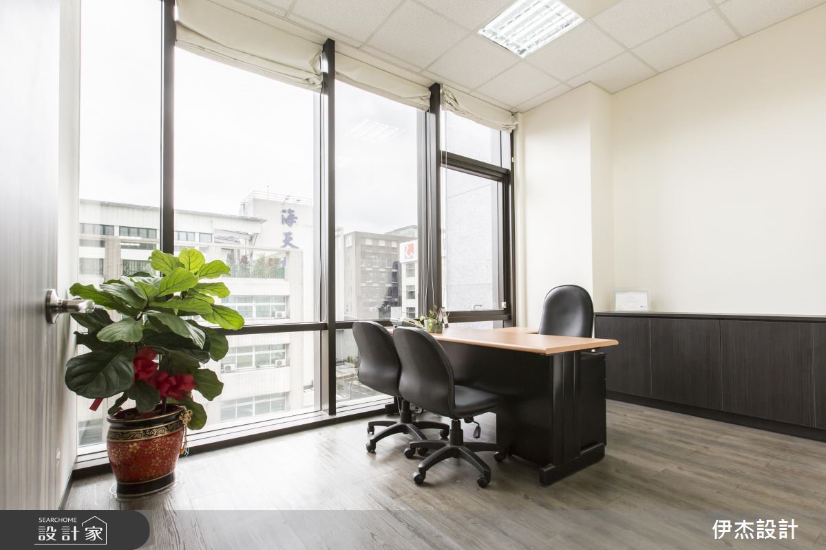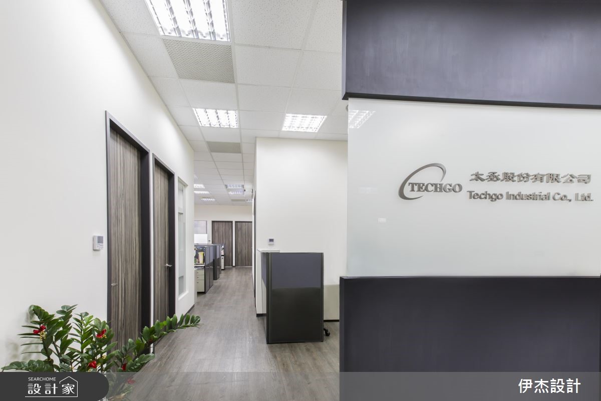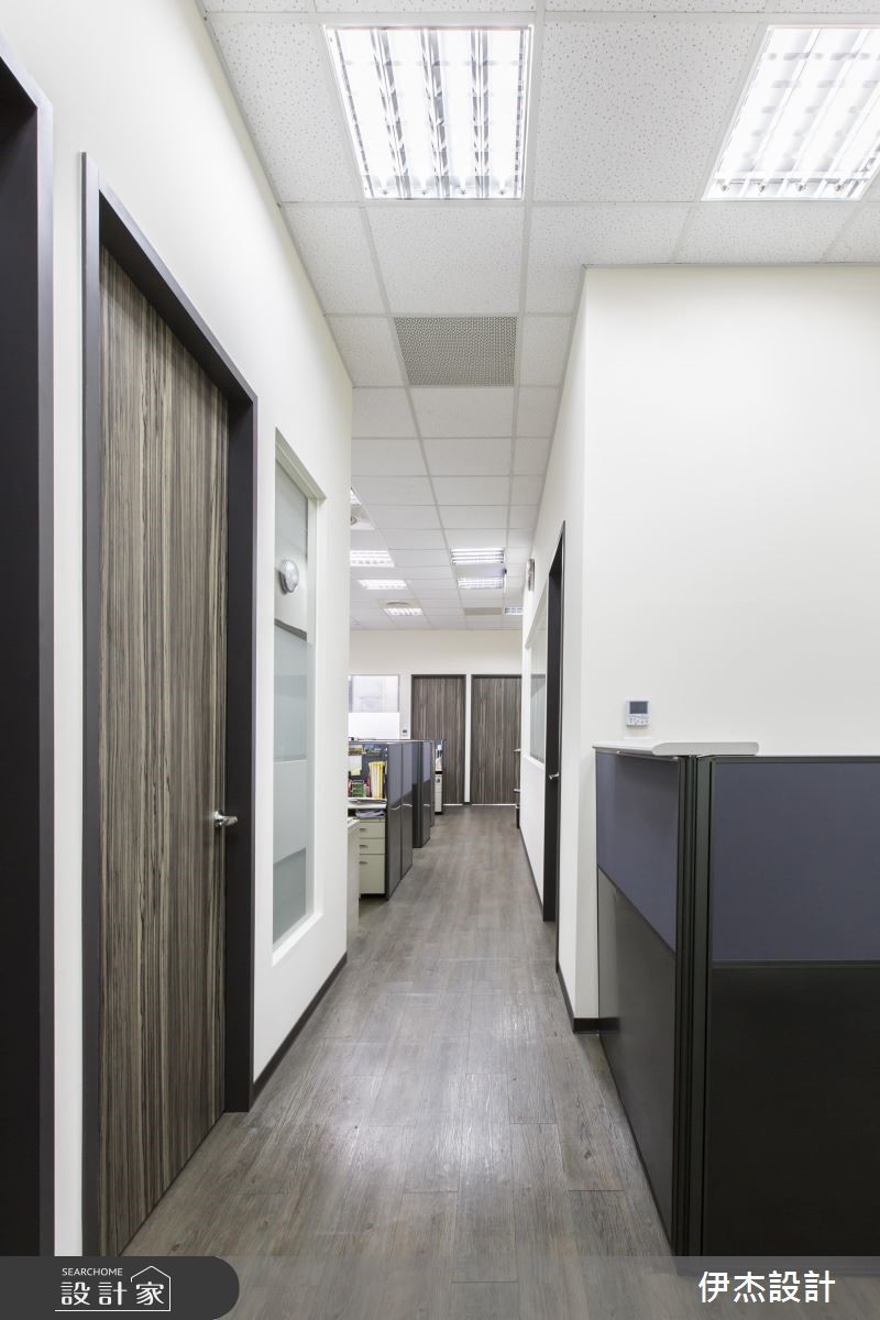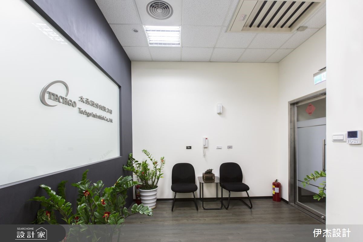 机电公司为扩大服务业务,特别请设计师重新打造总部,藉由现代感的设计手法,呈现干净、俐落的视觉感受;在木纹肌理的铺陈下,更散发温润的自然气息,破除办公空间给人的刻板印象。【简约用色,营造清爽的工作氛围】迎宾领域以深浅两色与异材质堆叠的壁面,映照出鲜明的公司LOGO,并摆设绿意植栽与单椅,让到访的客人能在此等待歇息,展现无上的贴心。进入简约的办公间,中心廊道形成流畅的动线导引,搭配原木线条的地面与门扇,展现惬意、舒适的工作环境。整体以白色为基底,挑选黑紫两色组成的OA家具摆设,简单的线条与色系,创造出整齐划一的和谐之美,也替明亮的空间增添些许沉稳感受;而主管专属的办公空间里,藉由对外窗的设计手法,引入户外充沛的光线,让空间更明亮、宽敞。