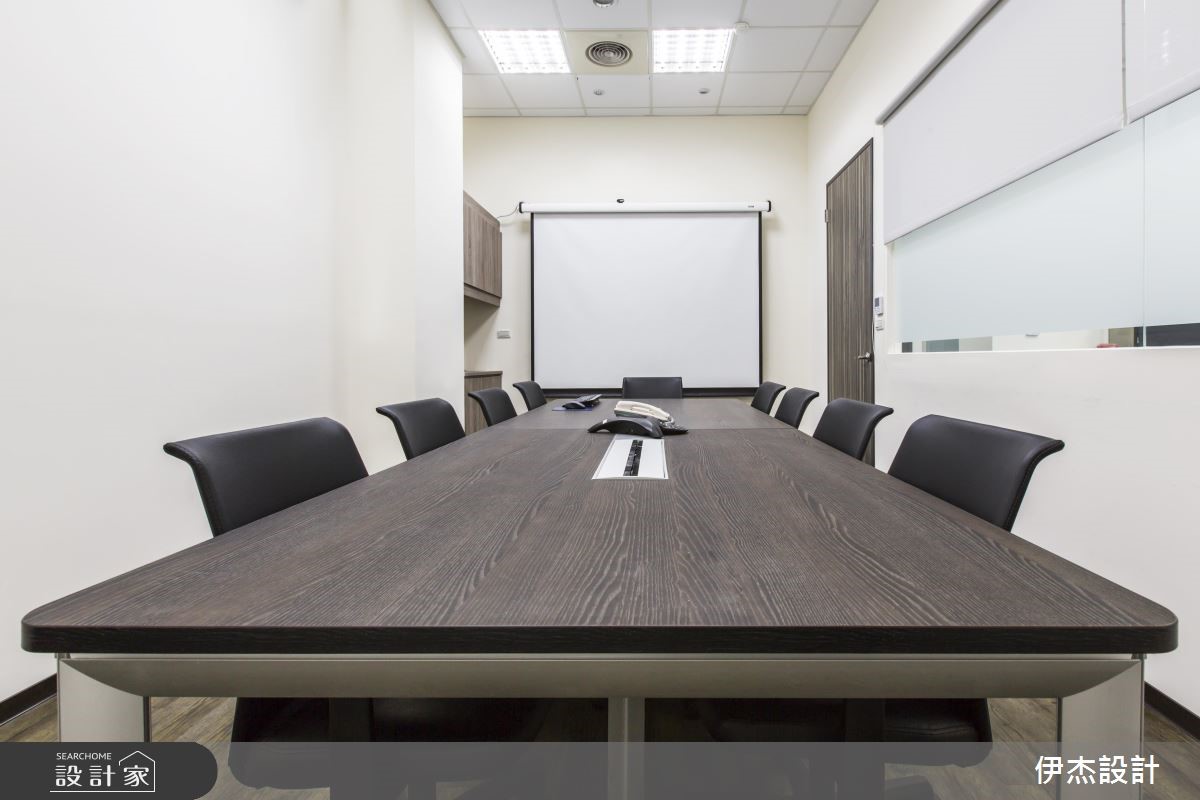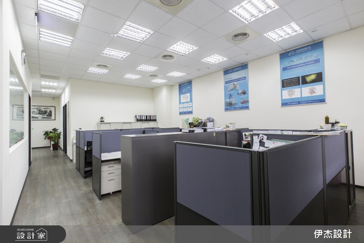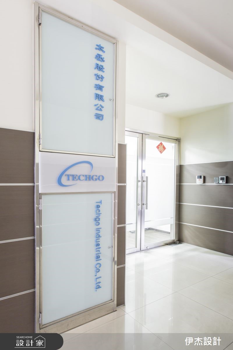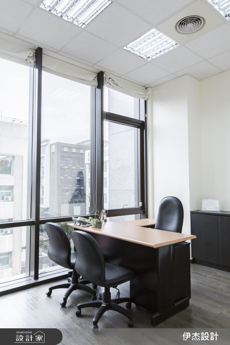 机电公司为扩大服务业务,特别请设计师重新打造总部,藉由现代感的设计手法,呈现干净、俐落的视觉感受;在木纹肌理的铺陈下,更散发温润的自然气息,破除办公空间给人的刻板印象。【简约用色,营造清爽的工作氛围】迎宾领域以深浅两色与异材质堆叠的壁面,映照出鲜明的公司LOGO,并摆设绿意植栽与单椅,让到访的客人能在此等待歇息,展现无上的贴心。进入简约的办公间,中心廊道形成流畅的动线导引,搭配原木线条的地面与门扇,展现惬意、舒适的工作环境。整体以白色为基底,挑选黑紫两色组成的OA家具摆设,简单的线条与色系,创造出整齐划一的和谐之美,也替明亮的空间增添些许沉稳感受;而主管专属的办公空间里,藉由对外窗的设计手法,引入户外充沛的光线,让空间更明亮、宽敞。