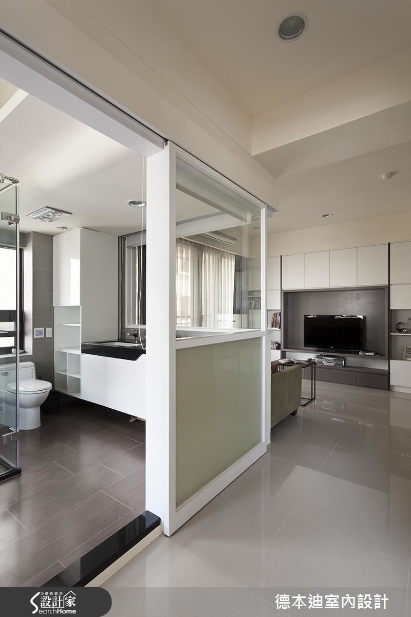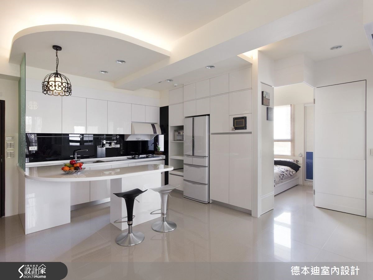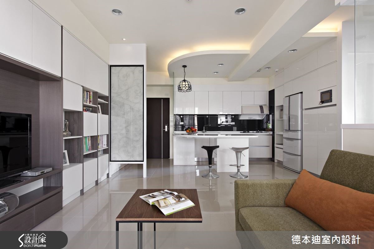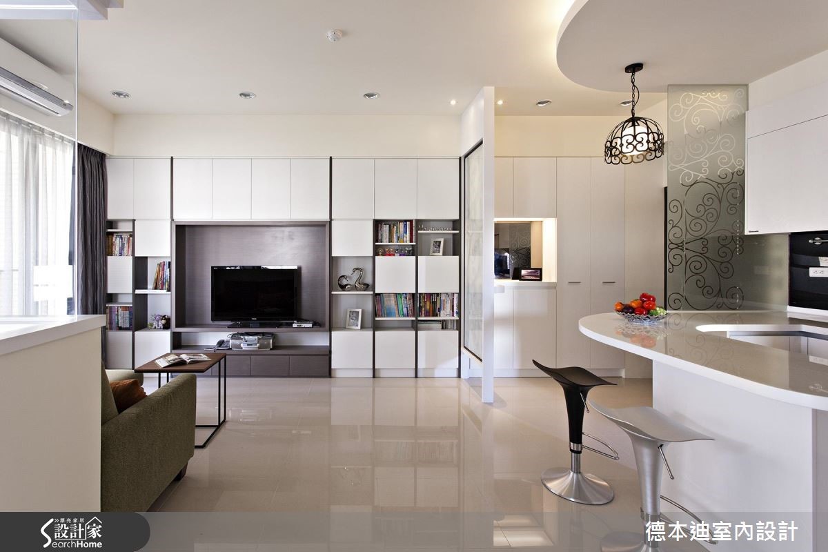 56平方米的现代风单身宅,既有建商配给的厨具过小,且较好的景观视野局限在浴室与次卧房,不符合屋主的使用期待,于是设计师调整原先格局,除了扩大厨房使用机能,还将次卧与浴室打通,仅利用玻璃隔断,打造在泡澡、阅读时都可欣赏夜景的纾压居宅。【白色系统柜,打造清爽居家】为了阻绝开门见窗的视线问题,设计师配置铁件及喷砂玻璃隔屏,一旁也采以相同图腾元素的喷砂玻璃装饰墙面;客厅内则藉由白色电视柜延伸,创造加乘的空间感,并藉由展示与封闭的穿插设计,将收纳机能蕴含其内,交织出丰富的墙面风貌。餐厅于天花板加入圆弧线条,呼应下方吧台的圆弧造型,规划出可品酒用餐的放松场合,并以L型格局收纳厨具设备,完善利用空间;寝卧内收掉多余赘饰,呈现简约无压的氛围,腰线以下则透过蓝色挥洒,带出视觉多变性,并整合大容量的衣柜空间,满足屋主生活所需。