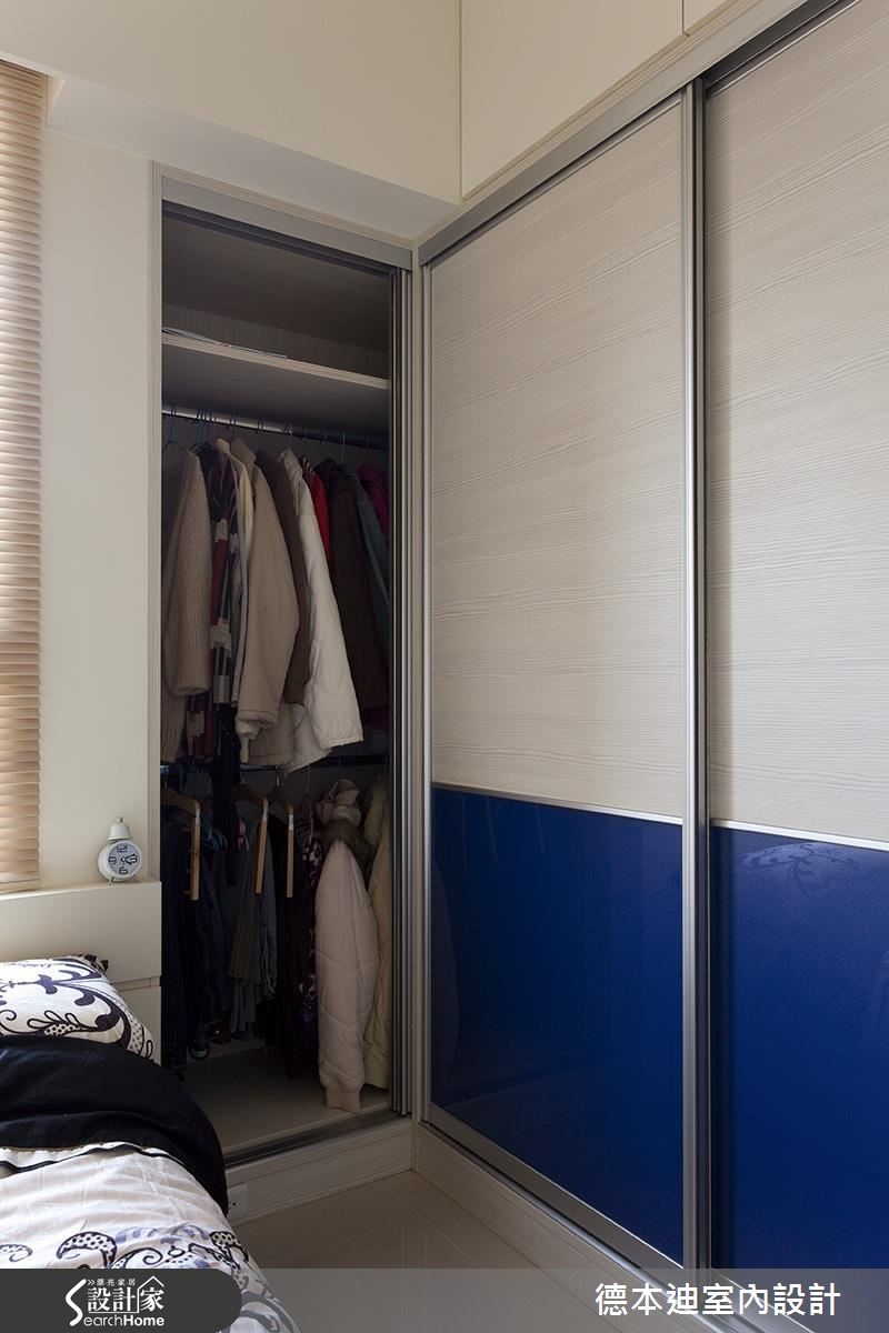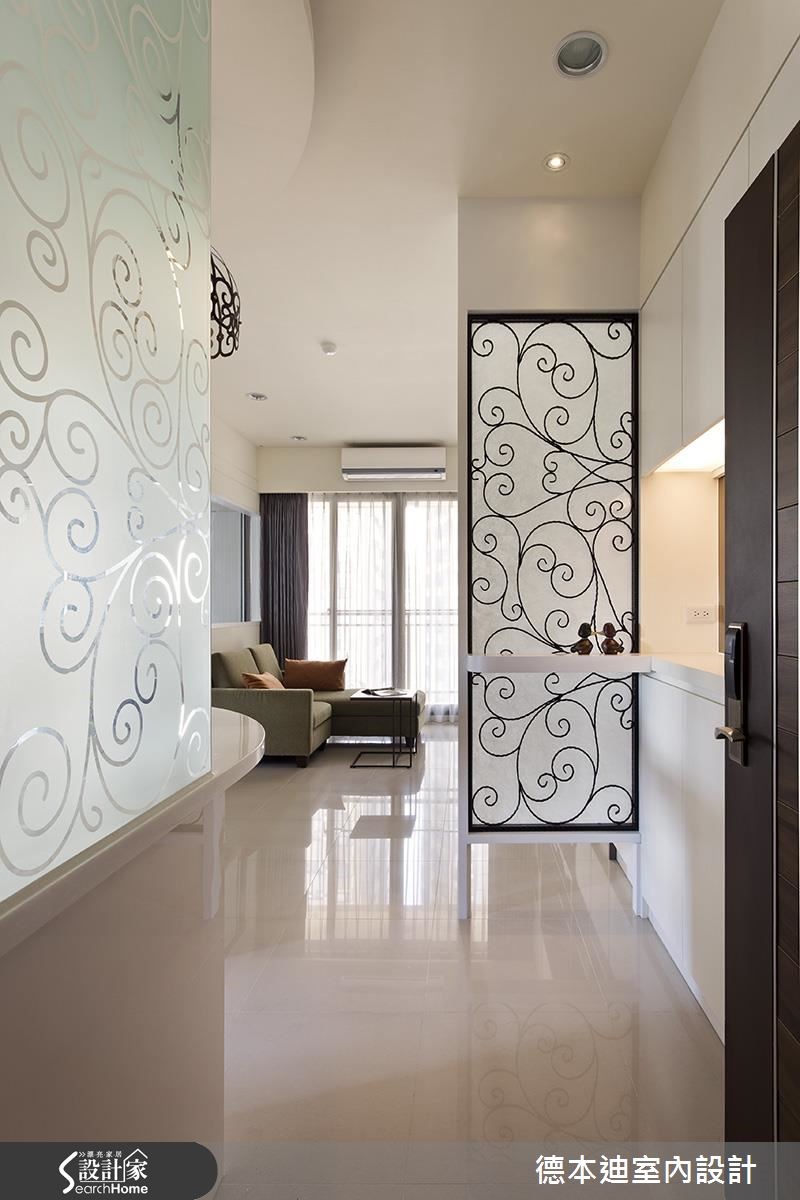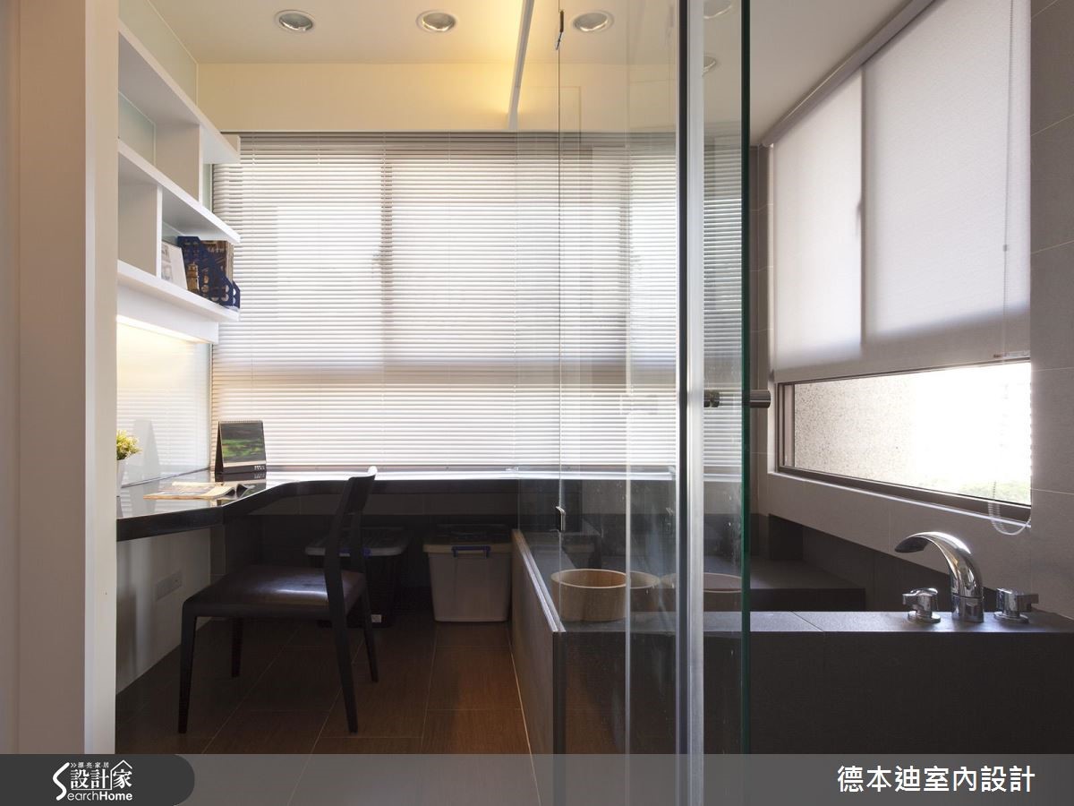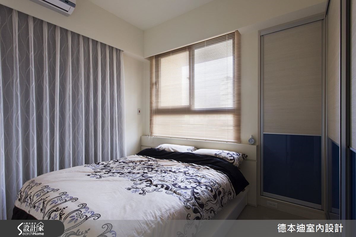 56平方米的现代风单身宅,既有建商配给的厨具过小,且较好的景观视野局限在浴室与次卧房,不符合屋主的使用期待,于是设计师调整原先格局,除了扩大厨房使用机能,还将次卧与浴室打通,仅利用玻璃隔断,打造在泡澡、阅读时都可欣赏夜景的纾压居宅。【白色系统柜,打造清爽居家】为了阻绝开门见窗的视线问题,设计师配置铁件及喷砂玻璃隔屏,一旁也采以相同图腾元素的喷砂玻璃装饰墙面;客厅内则藉由白色电视柜延伸,创造加乘的空间感,并藉由展示与封闭的穿插设计,将收纳机能蕴含其内,交织出丰富的墙面风貌。餐厅于天花板加入圆弧线条,呼应下方吧台的圆弧造型,规划出可品酒用餐的放松场合,并以L型格局收纳厨具设备,完善利用空间;寝卧内收掉多余赘饰,呈现简约无压的氛围,腰线以下则透过蓝色挥洒,带出视觉多变性,并整合大容量的衣柜空间,满足屋主生活所需。